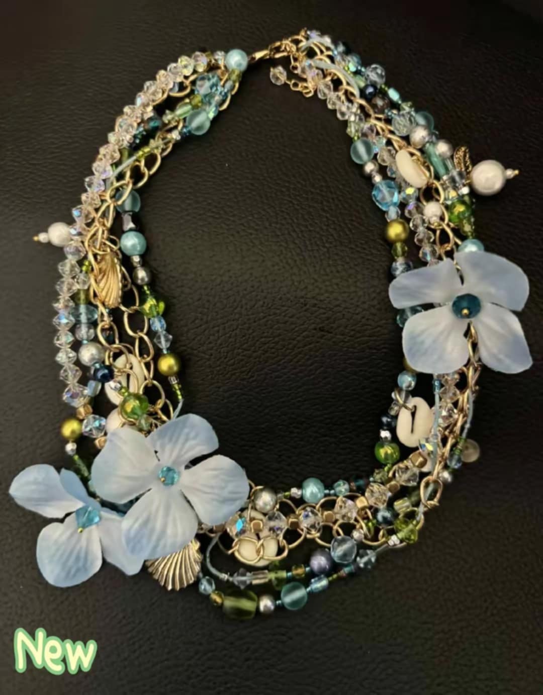 Ако морето и пролетта решат да се съберат в едно бижу....ще изглеждат точно така! Това ръчно изработено колие е комбинация от нежни мъниста, ефирни цветя и капчици блясък- направено да събира погледи и комплименти. Единствено- няма второ като него! Става идеален подарък (дори и за ..... себе си). Опаковано в луксозна опаковка.