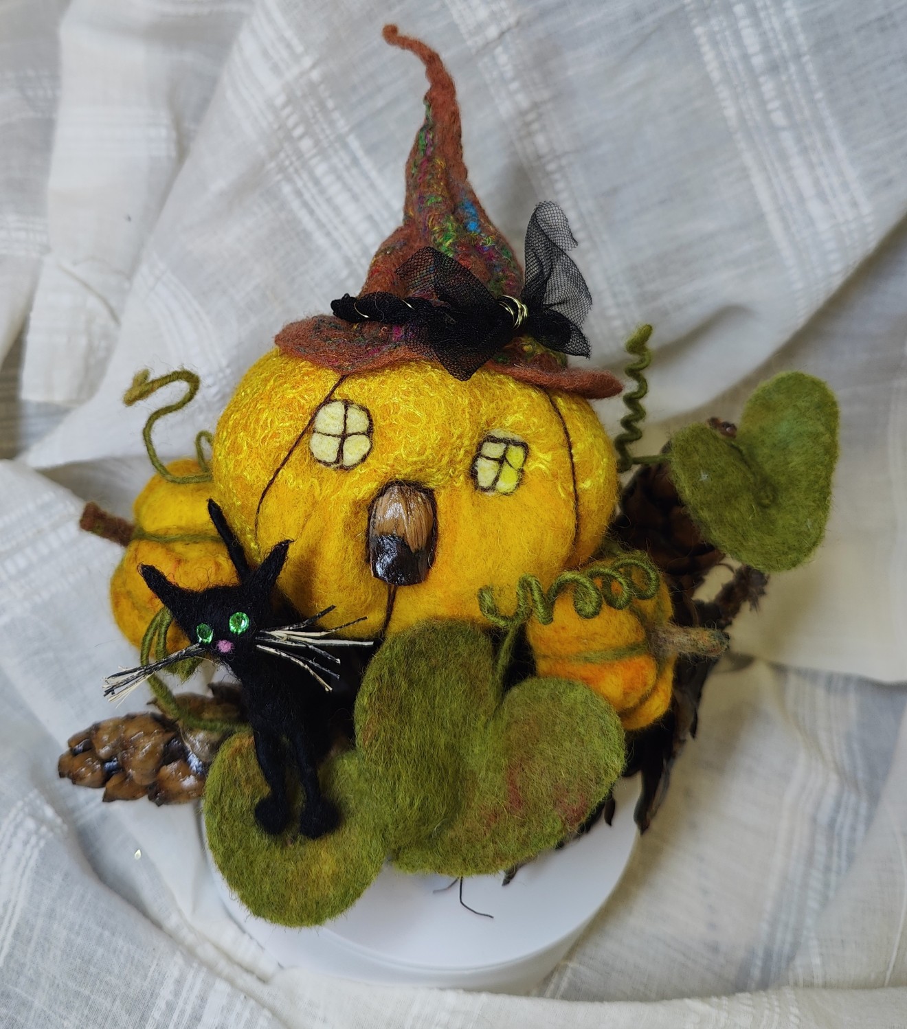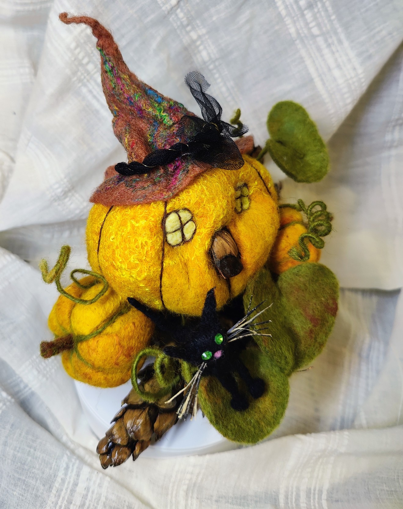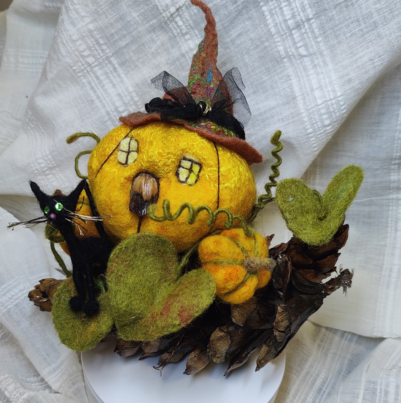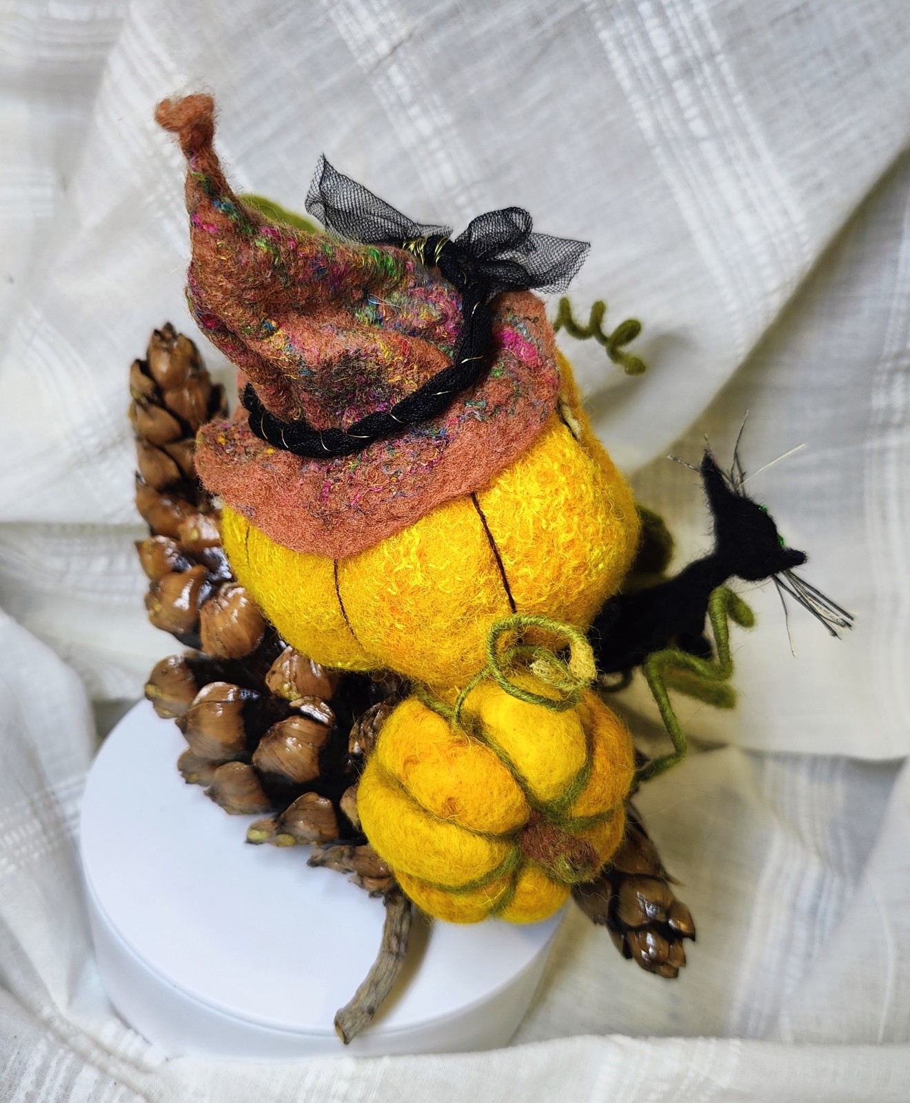 Хелуинска декорация от вълнени орнаменти (осем броя) в смесена техника - мокро и сухо плъстене. Аранжировка върху натурални лакирани шишаркию