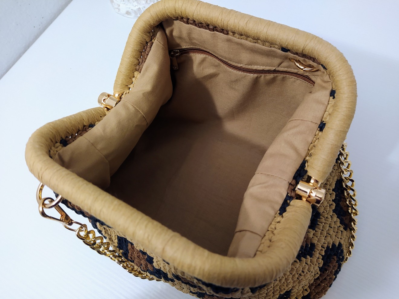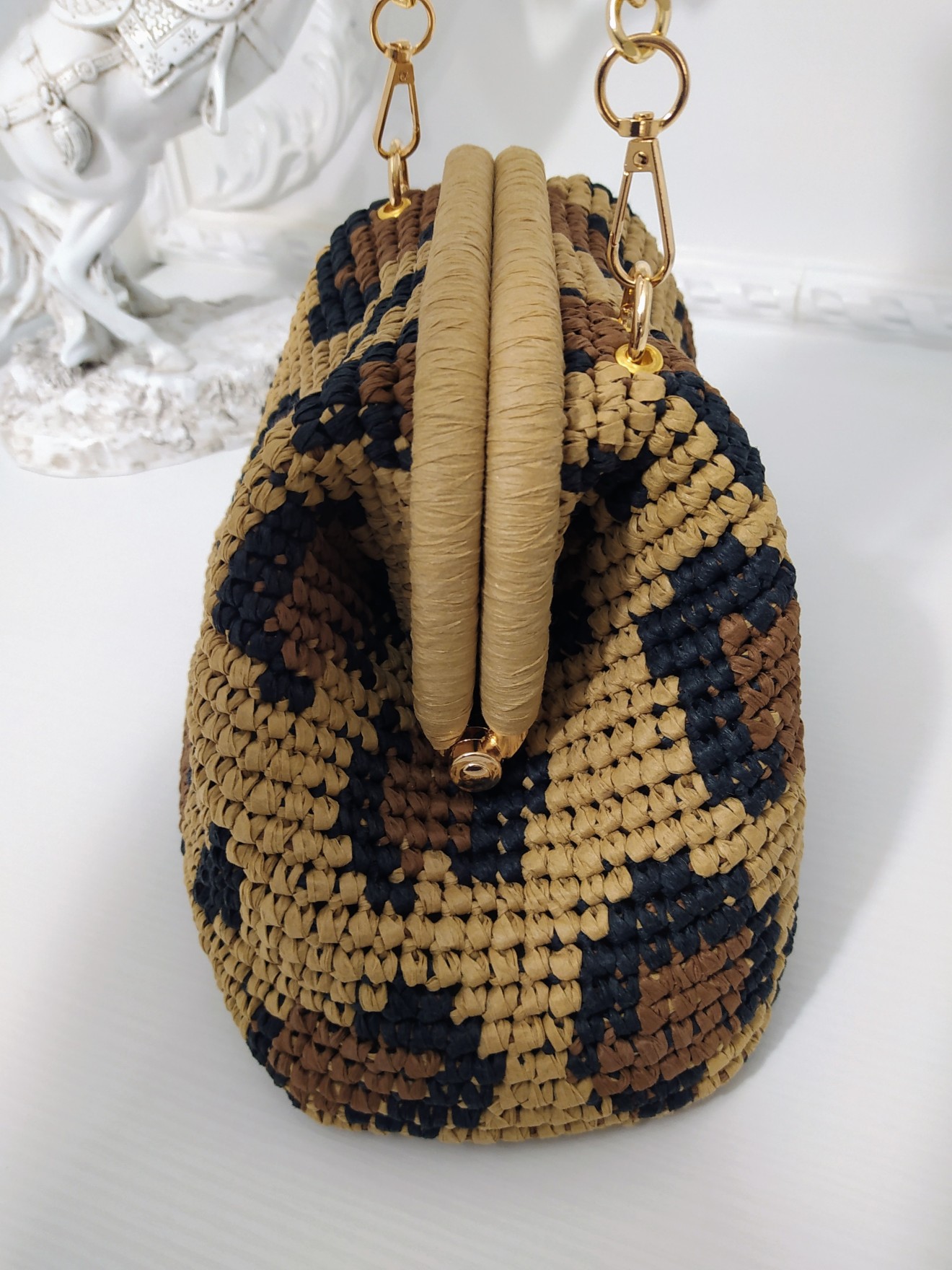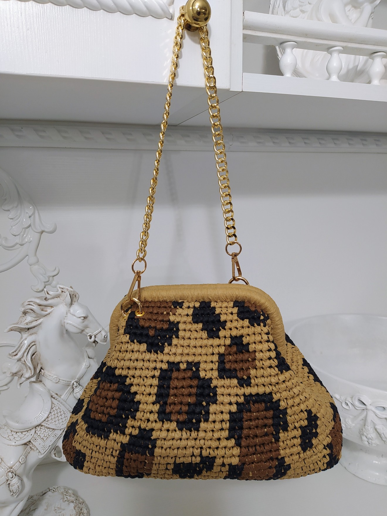 Плетена дамска чанта от хартиена прежда рафия с леопардова шарка. Със скрита рамка и подплата от памучен плат с вътрешен джоб с цип. С твърдо дъно, което запазва формата си. С дръжка - синджир в златно ( дължина - 70 см.).