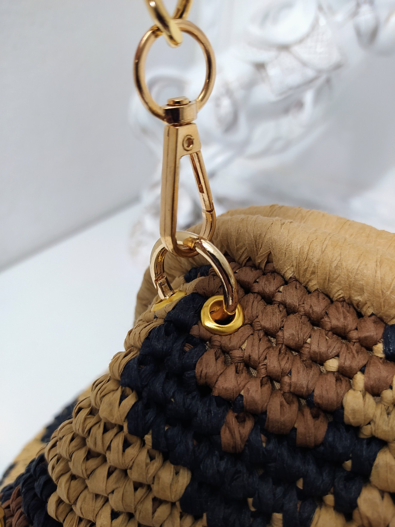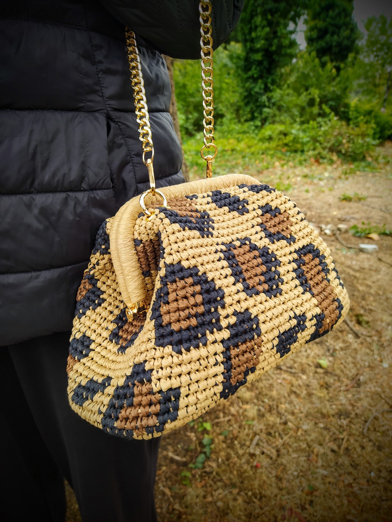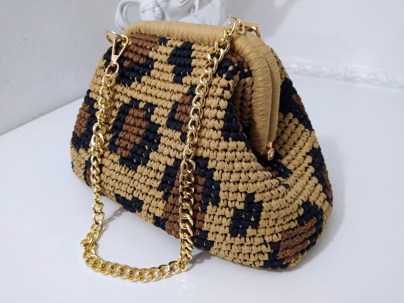 Плетена дамска чанта от хартиена прежда рафия с леопардова шарка. Със скрита рамка и подплата от памучен плат с вътрешен джоб с цип. С твърдо дъно, което запазва формата си. С дръжка - синджир в златно ( дължина - 70 см.).