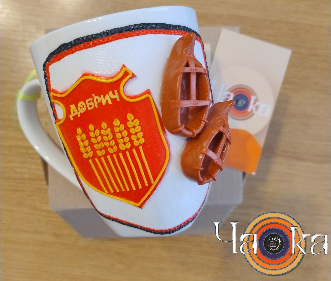 Ръчно декорирана чаша с полимерна глина със знак на гр. Добрич и цървули. Чашата е изработена по поръчка, така че моделът може да се променя в зависимост от желанието.