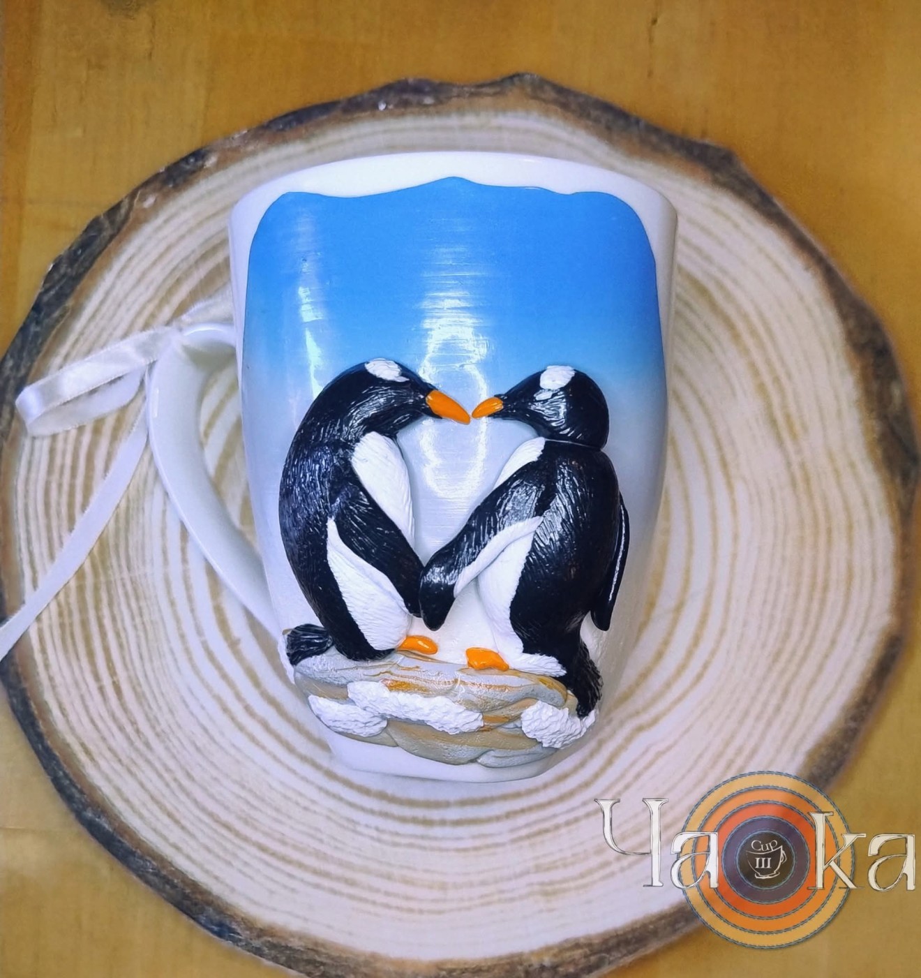 Ръчно декорирана чаша с полимерна глина с пингвини. Чашата е направена по поръчка.