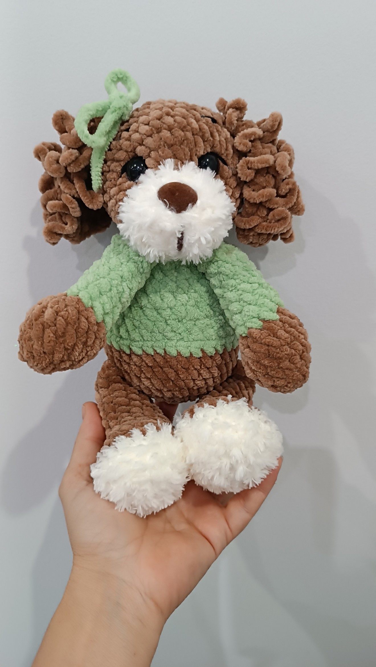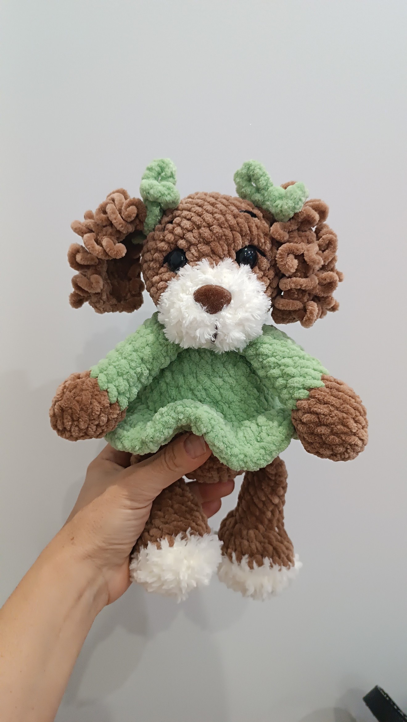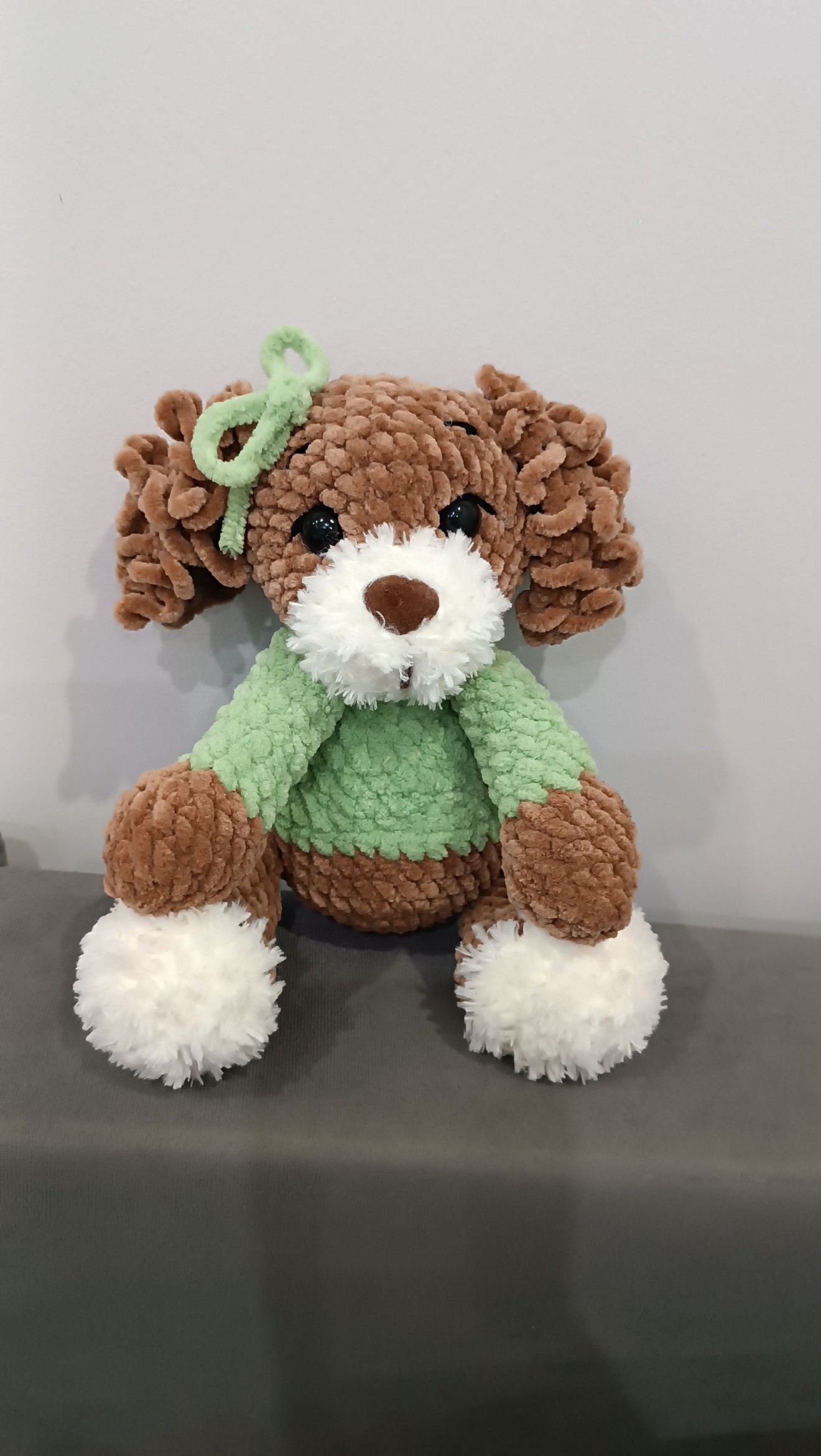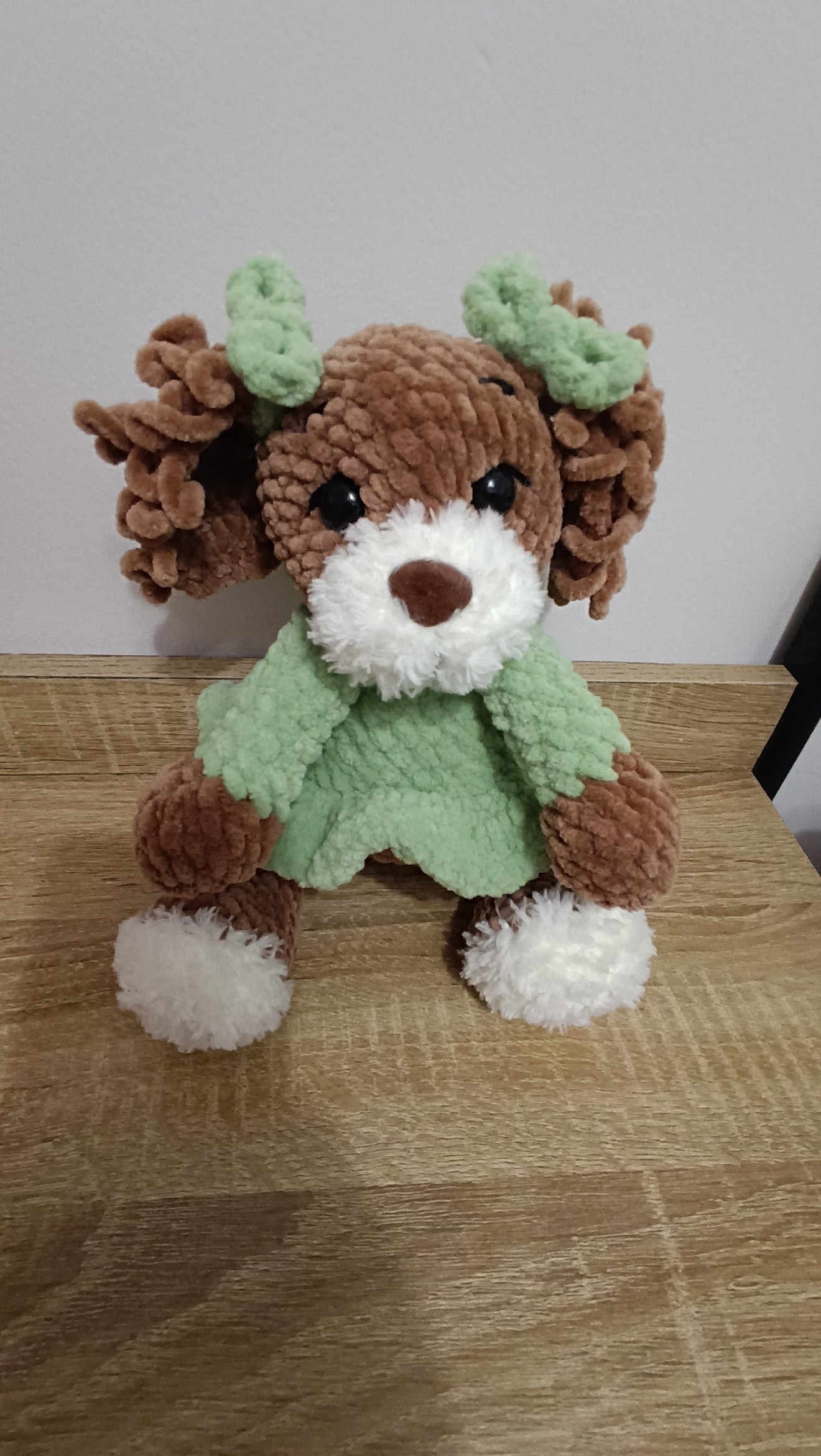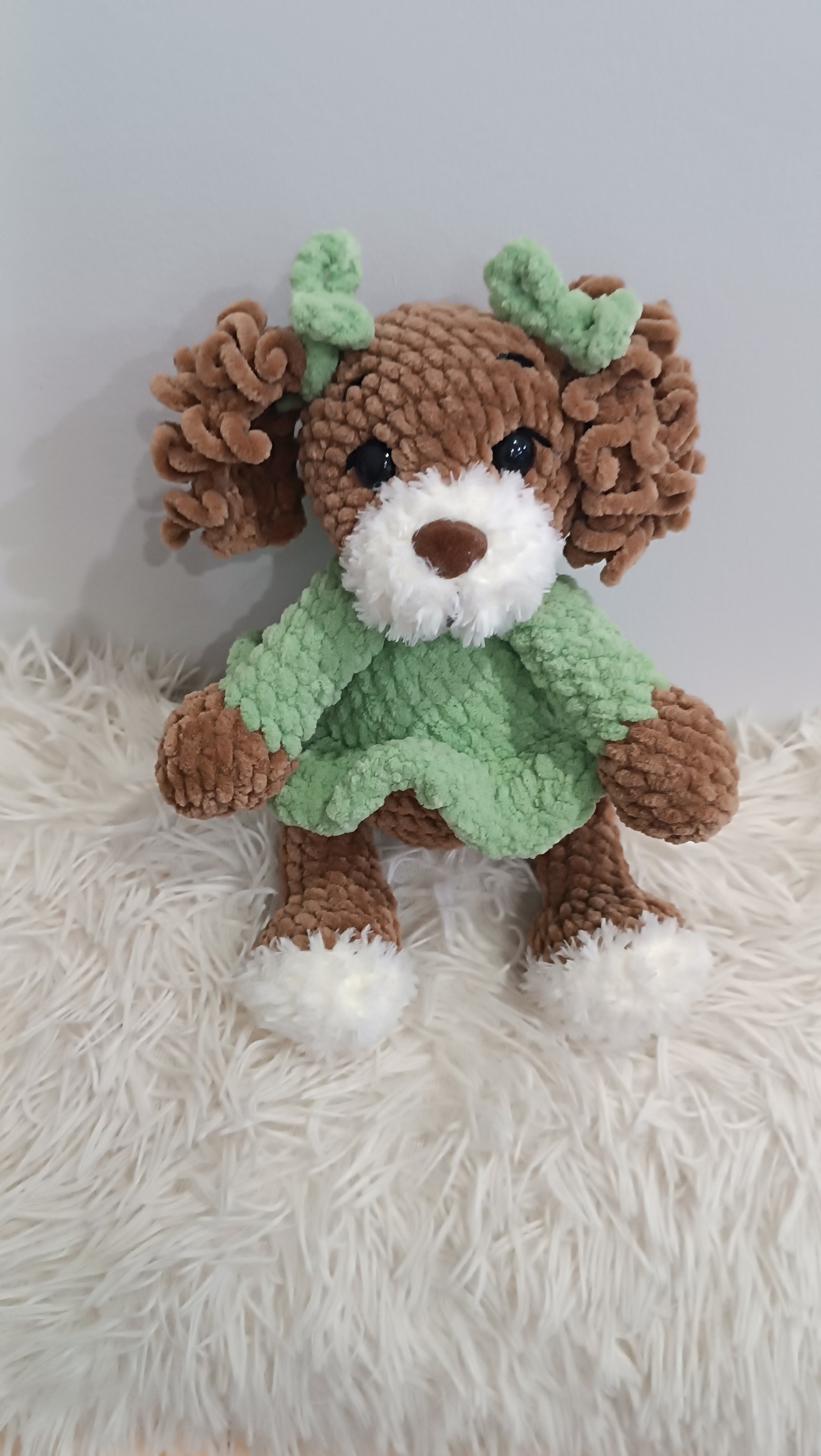 Очарователно плетено кученце, изработено на една кука от мека плюшена прежда. В топъл кафяв цвят с бяла муцунка и лапички, облечено в нежна зелена рокличка и с две панделки в същия цвят. Играчката излъчва уют и нежност — идеален подарък за дете или декорация за детска стая.Може да бъде изработено в друг цвят и за момче. Високо-24см
