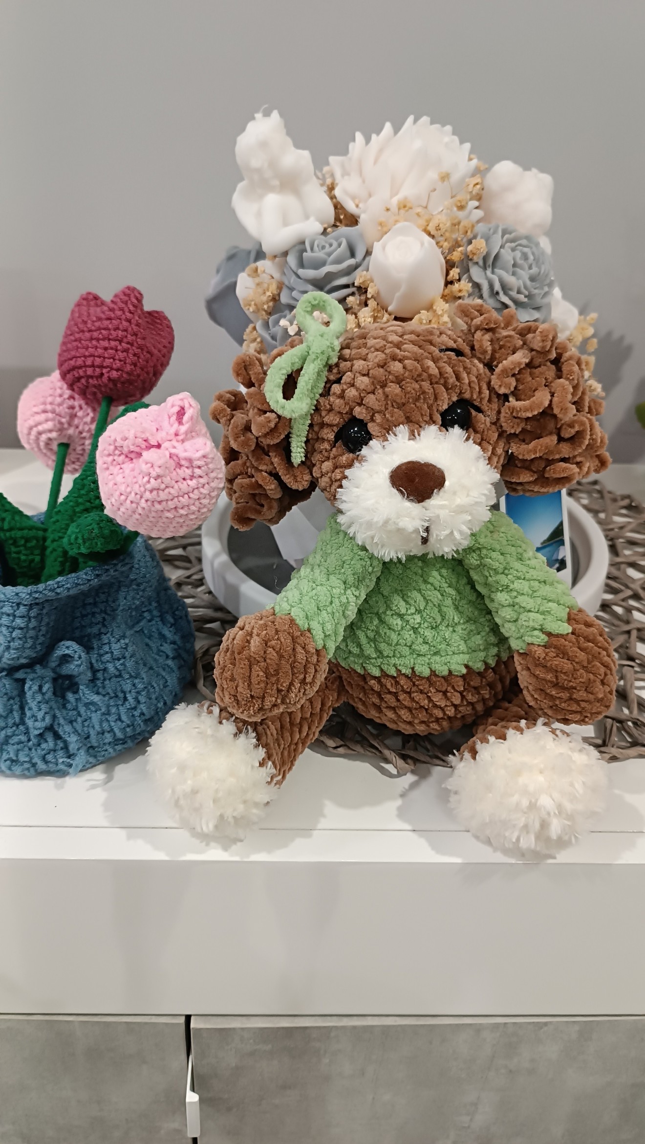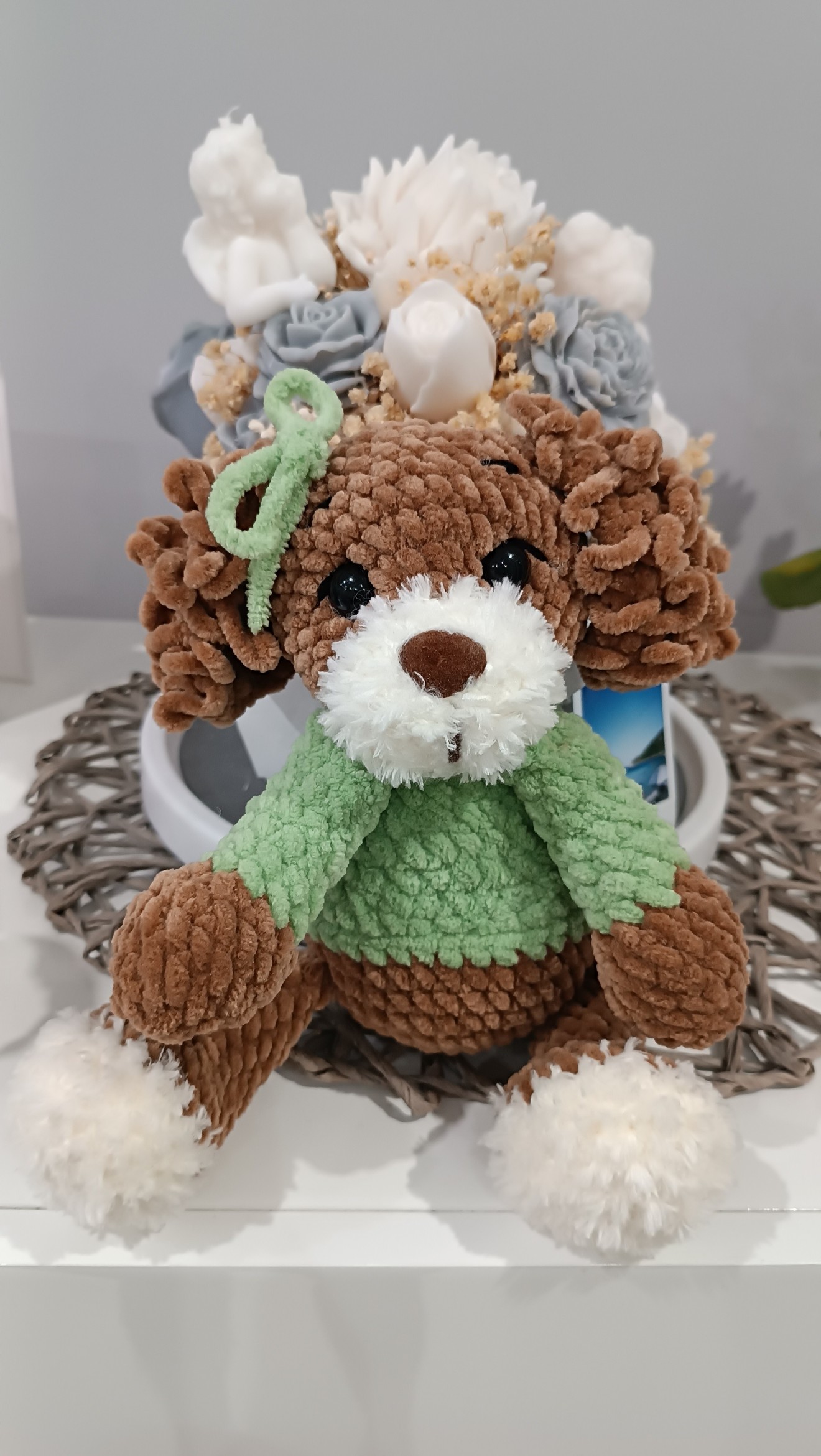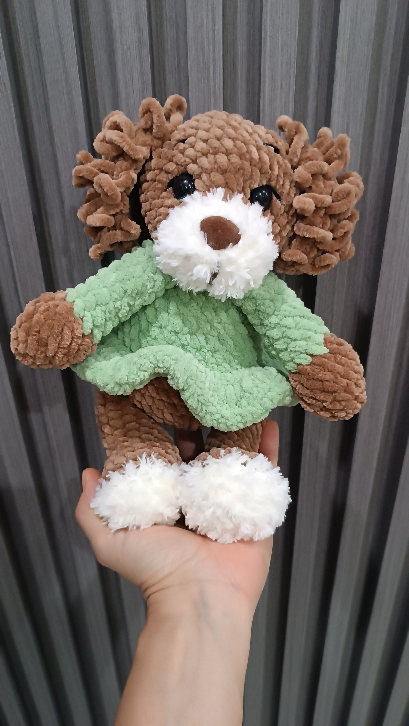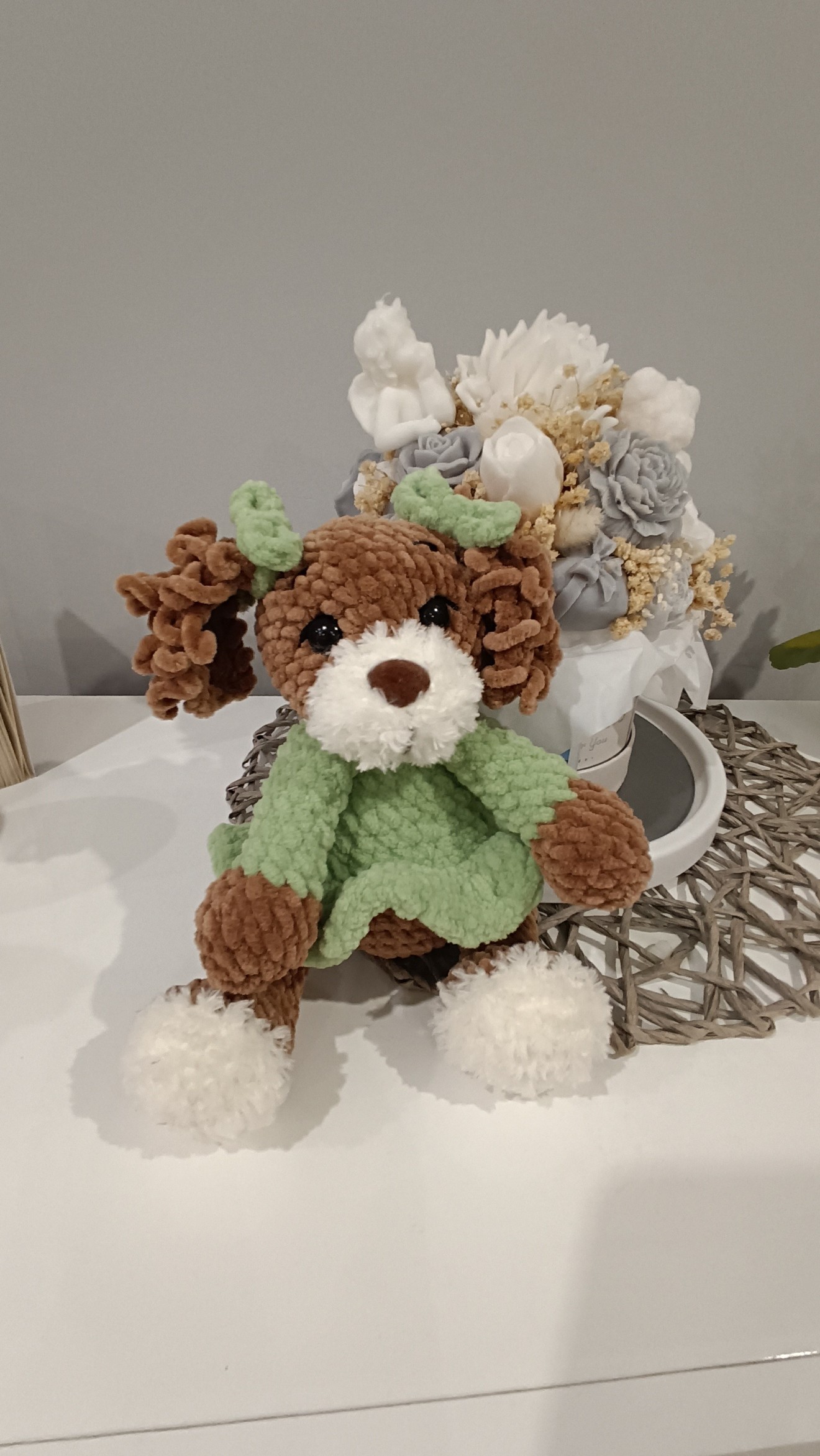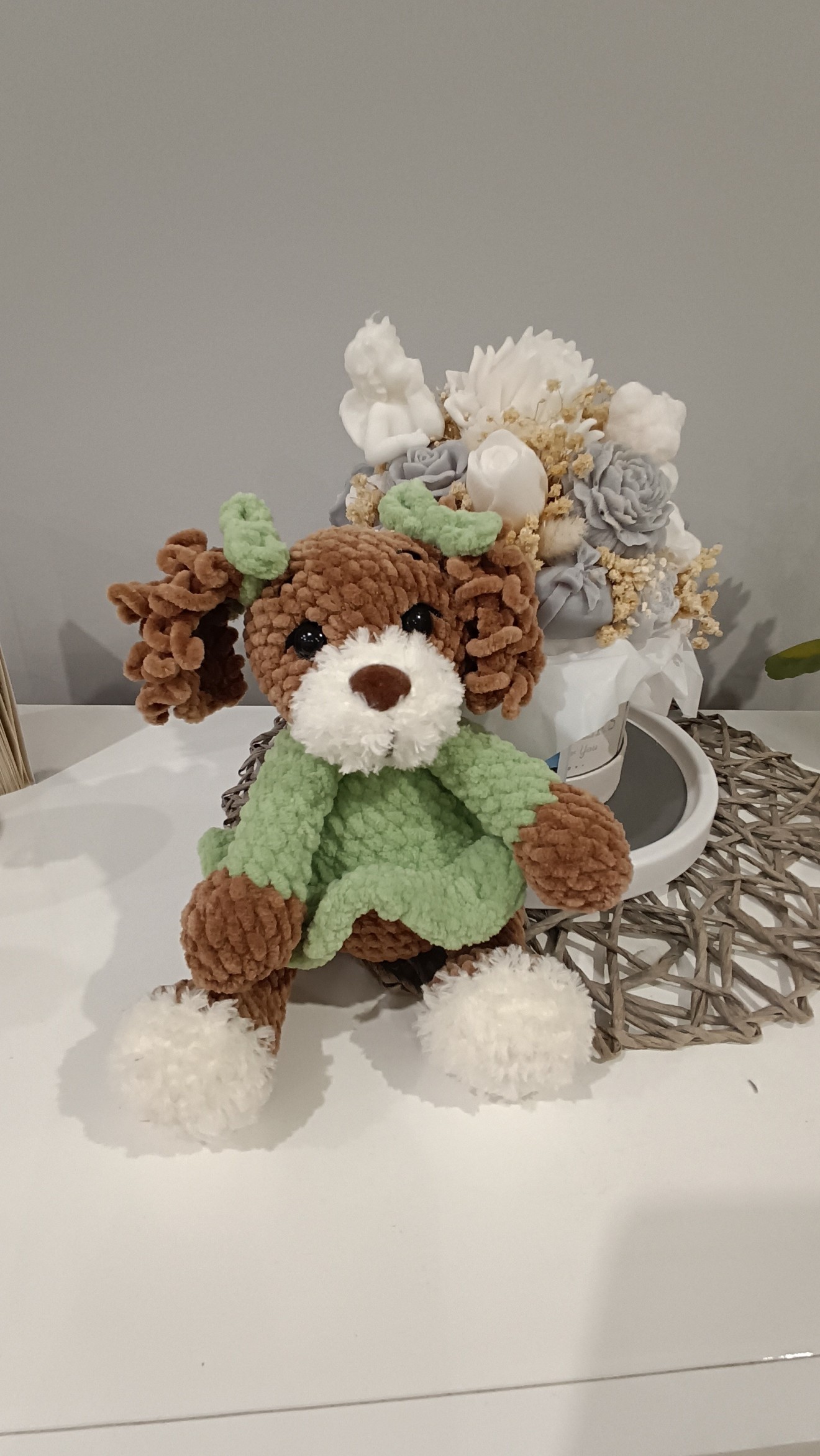Очарователно плетено кученце, изработено на една кука от мека плюшена прежда. В топъл кафяв цвят с бяла муцунка и лапички, облечено в нежна зелена рокличка и с две панделки в същия цвят. Играчката излъчва уют и нежност — идеален подарък за дете или декорация за детска стая.Може да бъде изработено в друг цвят и за момче. Високо-24см