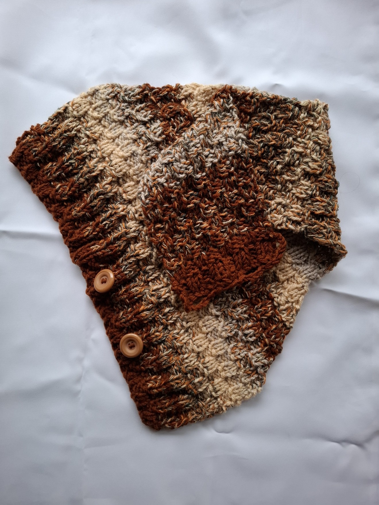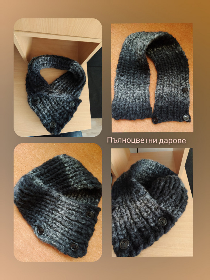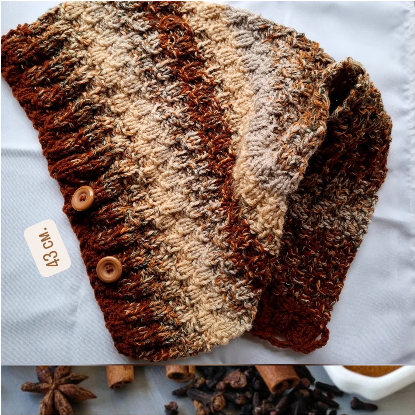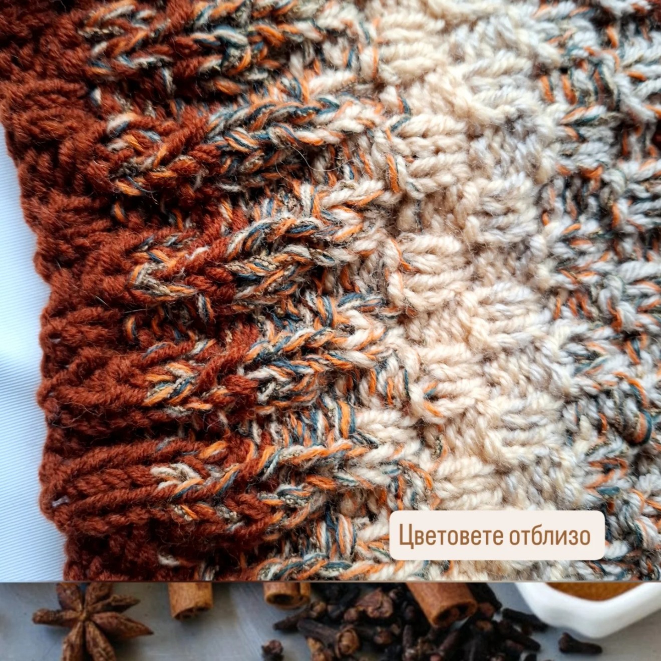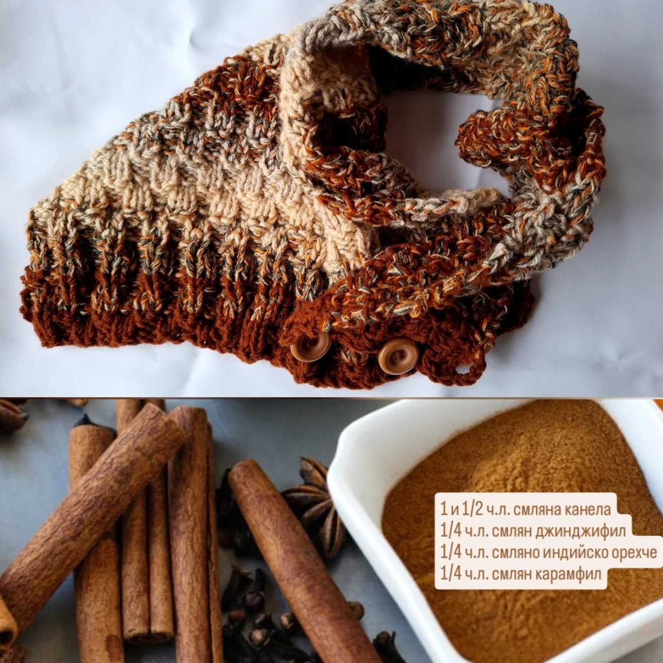 Плетен шал яка, вдъхновен от тиквения пай и цветовете на подправките, с които го приготвям: 1 и 1/2 ч.л. смляна канела 1/4 ч.л. смлян джинджифил 1/4 ч.л. смляно индийско орехче 1/4 ч.л. смлян карамфил Елегантен, топъл, есенен и много красив. Изплетен от нишки със състав: 25 % вълна, 75 % акрил; 49% вълна, 51% акрил; 100 % акрил. Закопчава се с копчета, с триъгълна форма в единия край и по-тясна правоъгълна в другия. Пристига опакован в кутия с панделка, готов за подаряване. Възможност за добавяне на лично пожелание, когато е за подарък. И разбира се, с инструкции за пране и почистване. Може да се изработи подобен, според Вашите изисквания. 💝 Подходящ е за романтичен жест, за рожден ден, имен ден или друг повод, особено ако търсите подарък, който ще се използва. Поздрави! Пълноцветни дарове 🌈