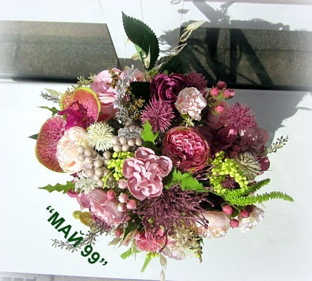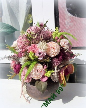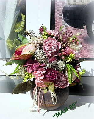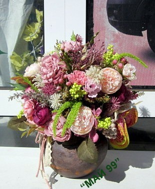 Аранжировка с изкуствени цветя и сухи елементи в преливащи розово-екрю и пепелно розово цветове в керамична състарена кашпа с панделка дантела и шнур. Височина 30 см. и 24 см. в обемната част. Уникат!