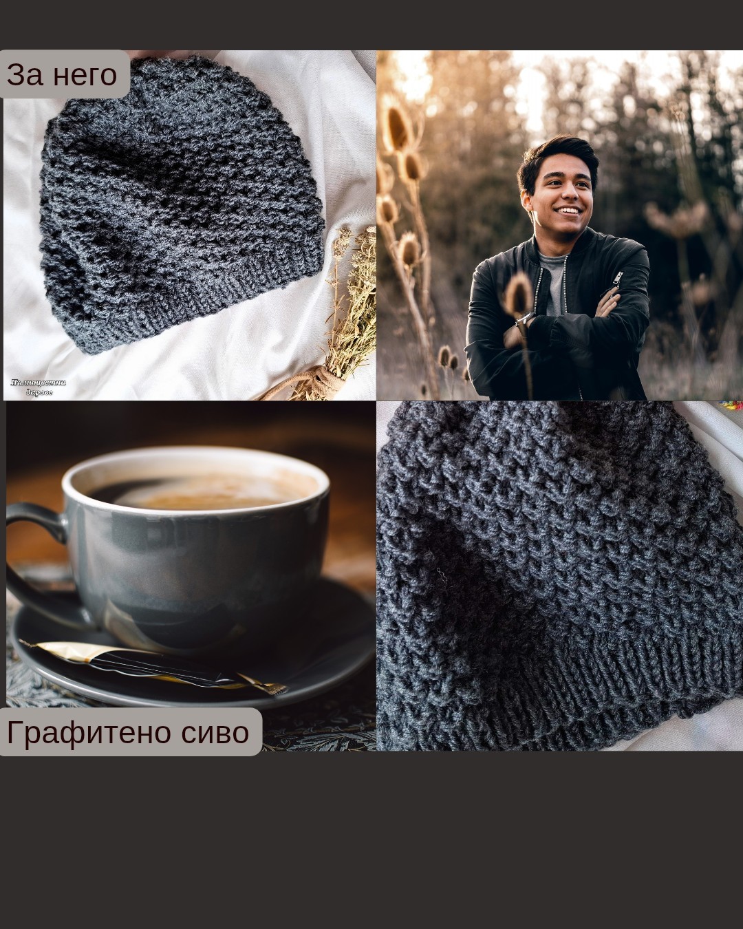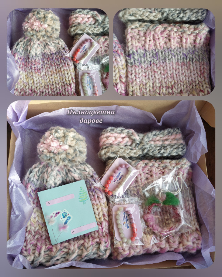 Комплект от фина, деликатна и мека мериносова вълна, под формата на шапки за него и нея. Преждата: Лека и проветива, запазва топлината, без да спарва. Подходяща дори за най-взискателната кожа! Цветовете: Матово кадифено червено и графитено сиво. Може да се изработят в цвят по избор. Комплектът пристига опакован в кутия с панделка и картичка, готов за подарък. Възможно е да се добавят имената на получателите и лично послание. Всяка пратка се подготвя отделно, напишете изискванията си в съобщение.