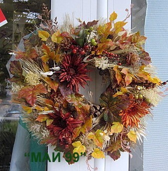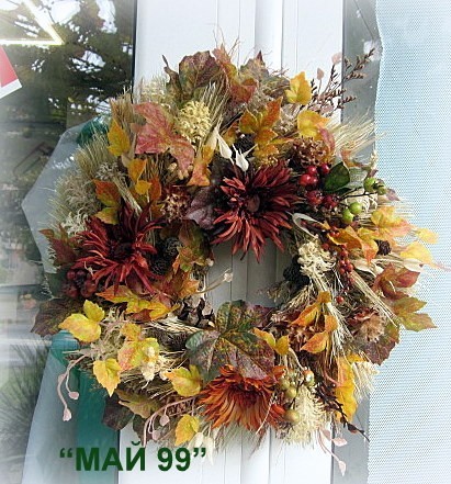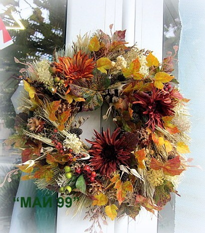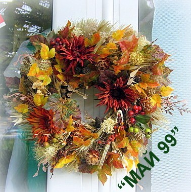 Богаго аранжиран есенен венец ф 43 см. с житни класове,сухи треви,есенни изкуствени клонки и листа,шишарки и сухи елементи и горени гербери в преливащи есенни багри! Уникат!