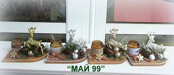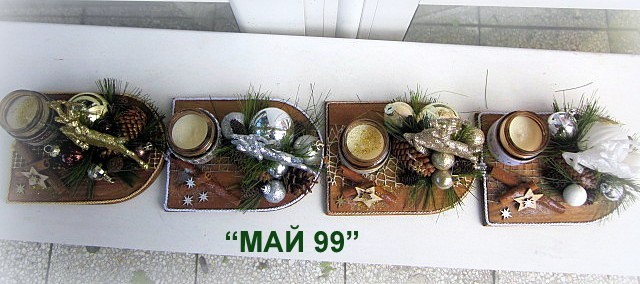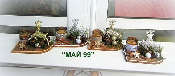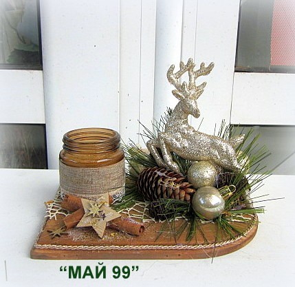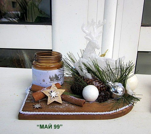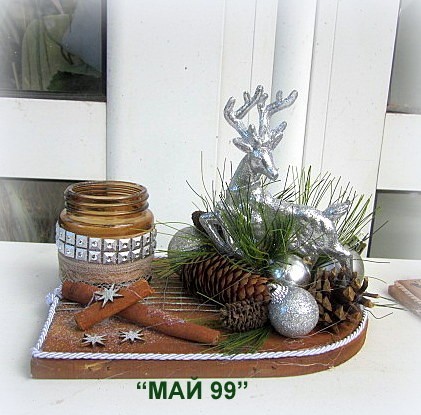 Ефектен и елегантген коледен подарък на сървена подложка 20/15 см. с коледна декорация и 4 цвята еленче с брокат,ароматна свещ в бурканче и канела.