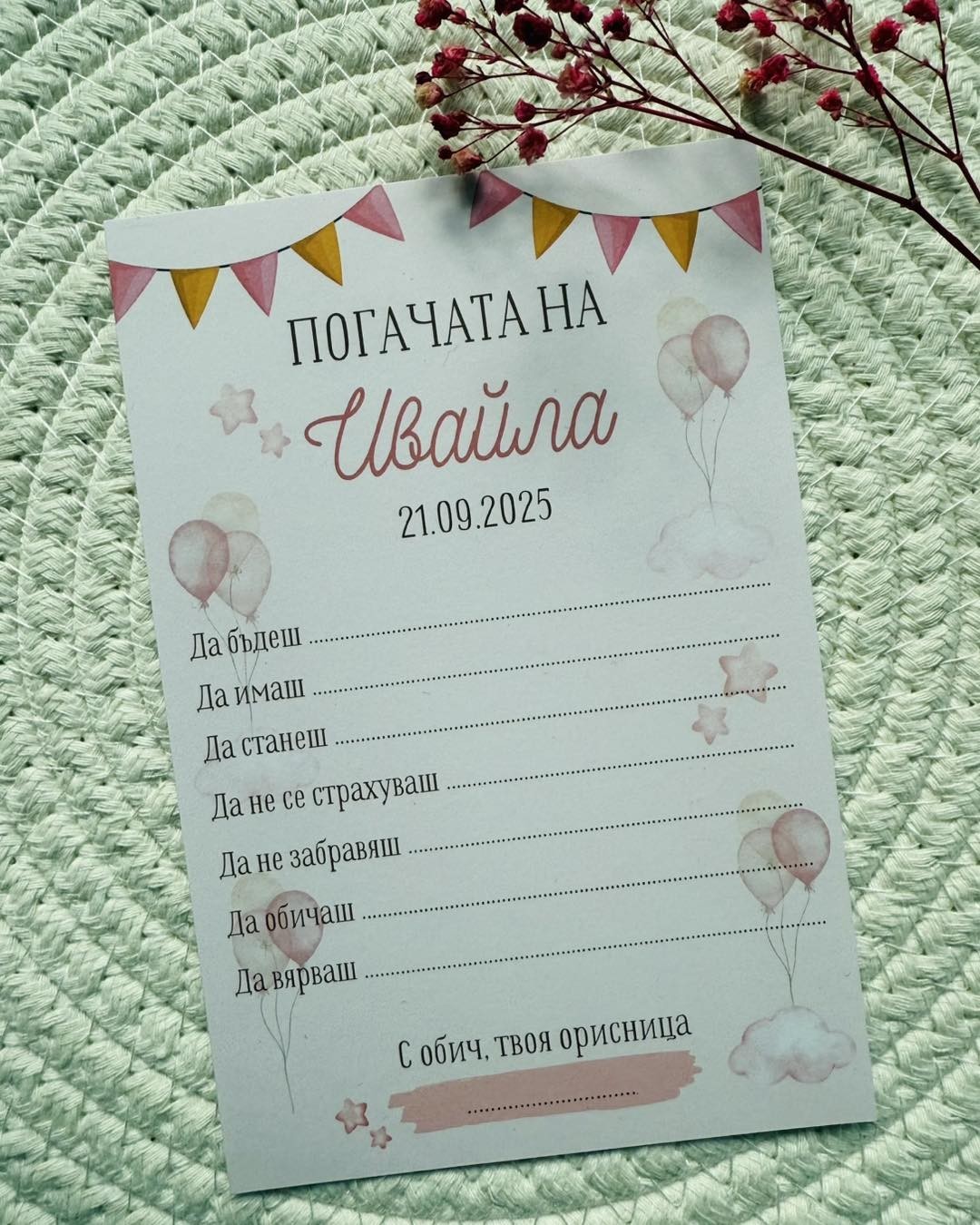 Карти за наричане за погача на бебе - красив и мил спомен за мама и бебе! 💕 Всеки гост може да остави своето пожелание за здраве, щастие и любов – скъп жест, който остава завинаги. Могат да бъдат изработени в дизайн по ваш избор. Размер на всяка карта - 10х15 см. Цената е за 1 брой карта. Можете да поръчате толкова бройки, колкото желаете.
