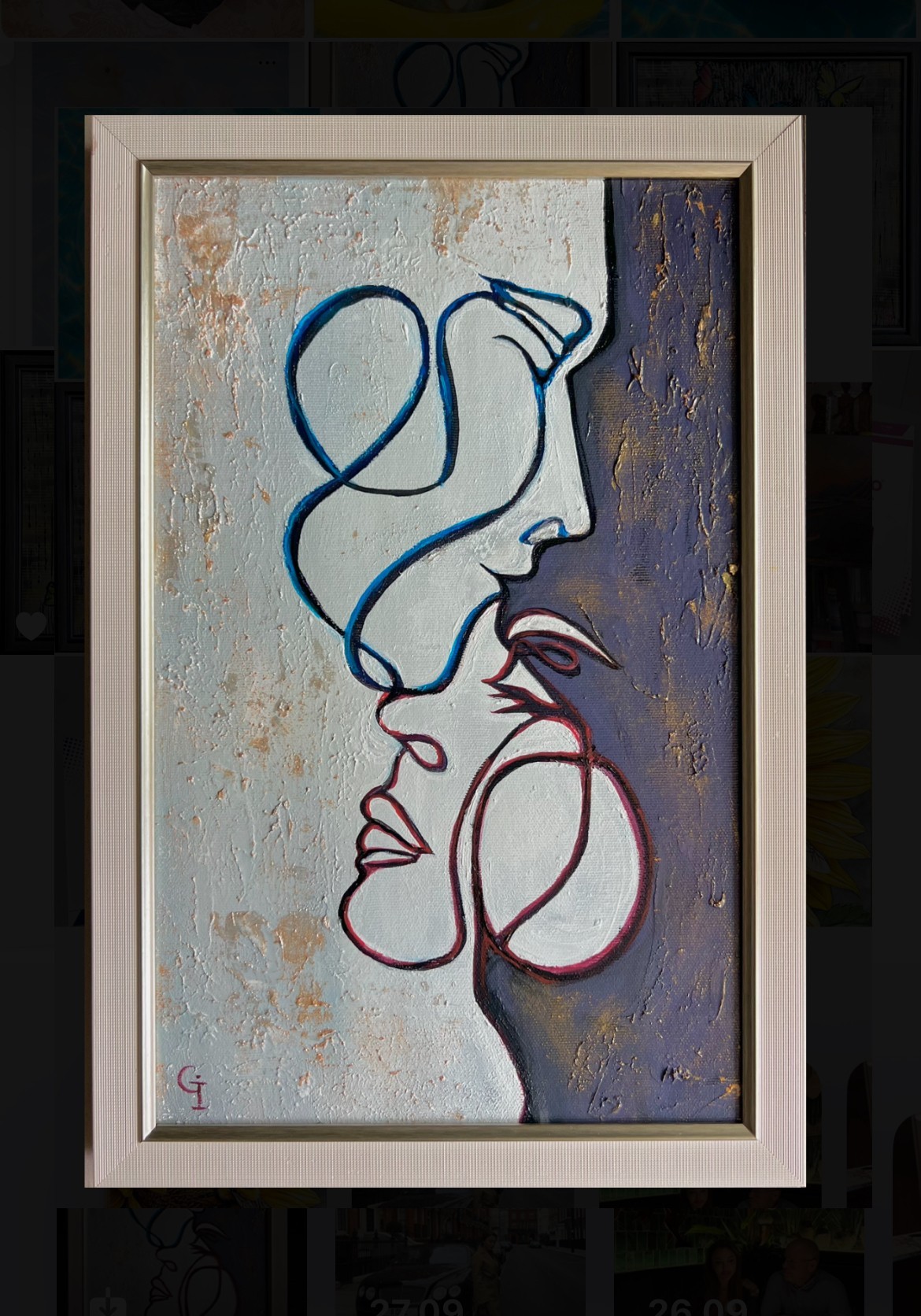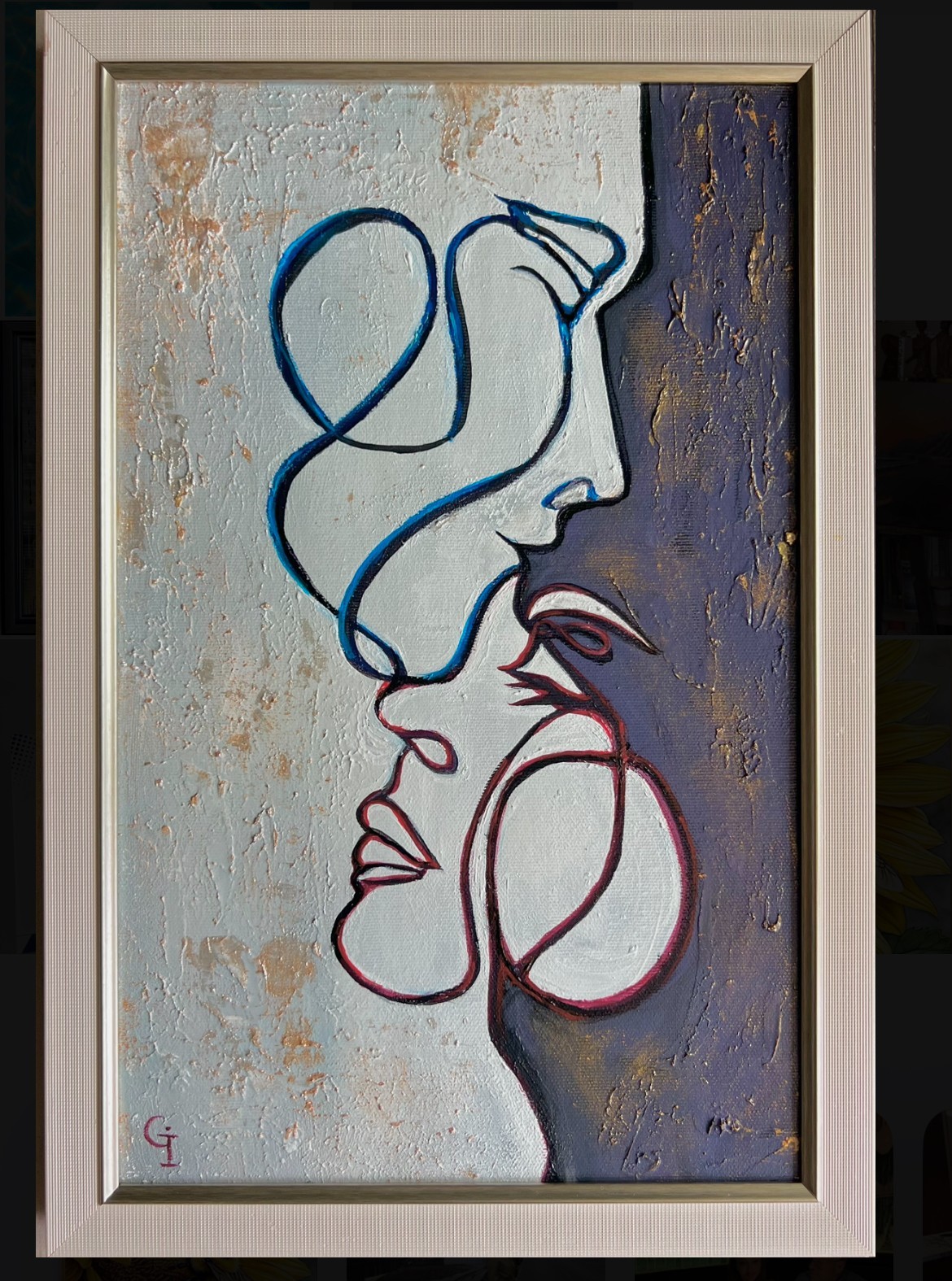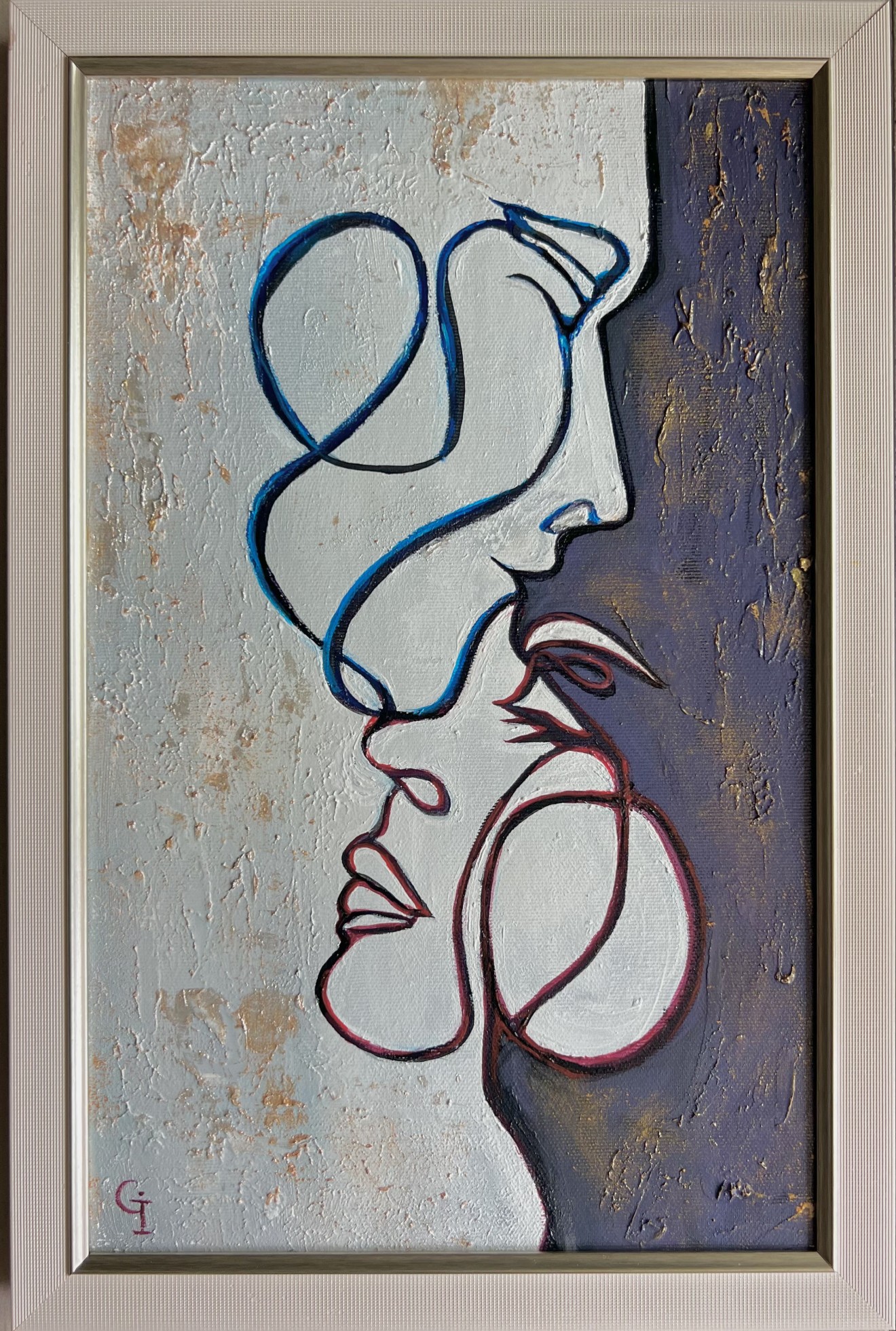 “Fusion”, acryl on canvas, 43/30 cm; Minimalist monochrome art evoking romance through a single continuous line;