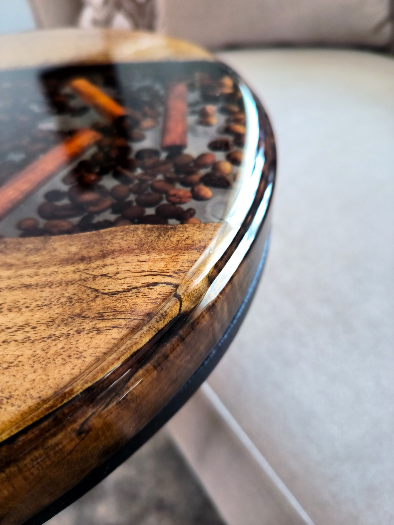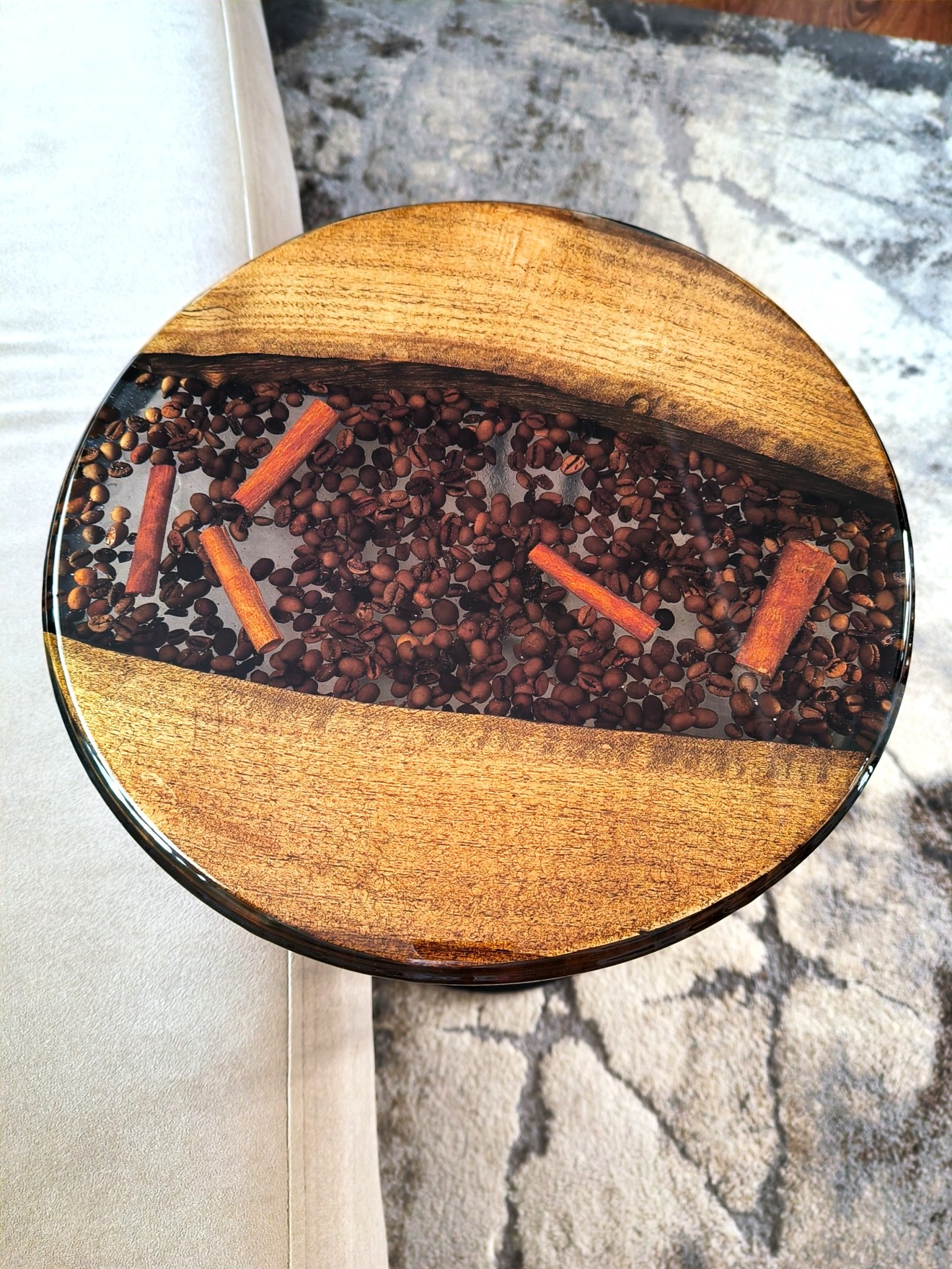 Топлина и аромат, претворени в дизайнерска форма – тази ръчно изработена помощна маса комбинира естествено дърво с епоксидна смола, в която са вградени истински кафени зърна и канелени пръчици. Топлите цветове и органичната текстура създават усещане за уют и спокойствие, а ръчно изкованите метални крака добавят елегантна стабилност. Идеален акцент за кът за кафе или ароматен щрих в интериора. ● Размери: Ø36.5 см / височина 60 см ● Цвят: черно / златно