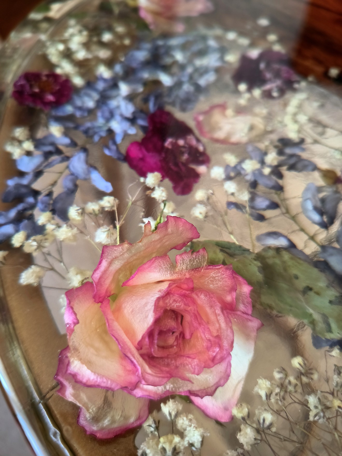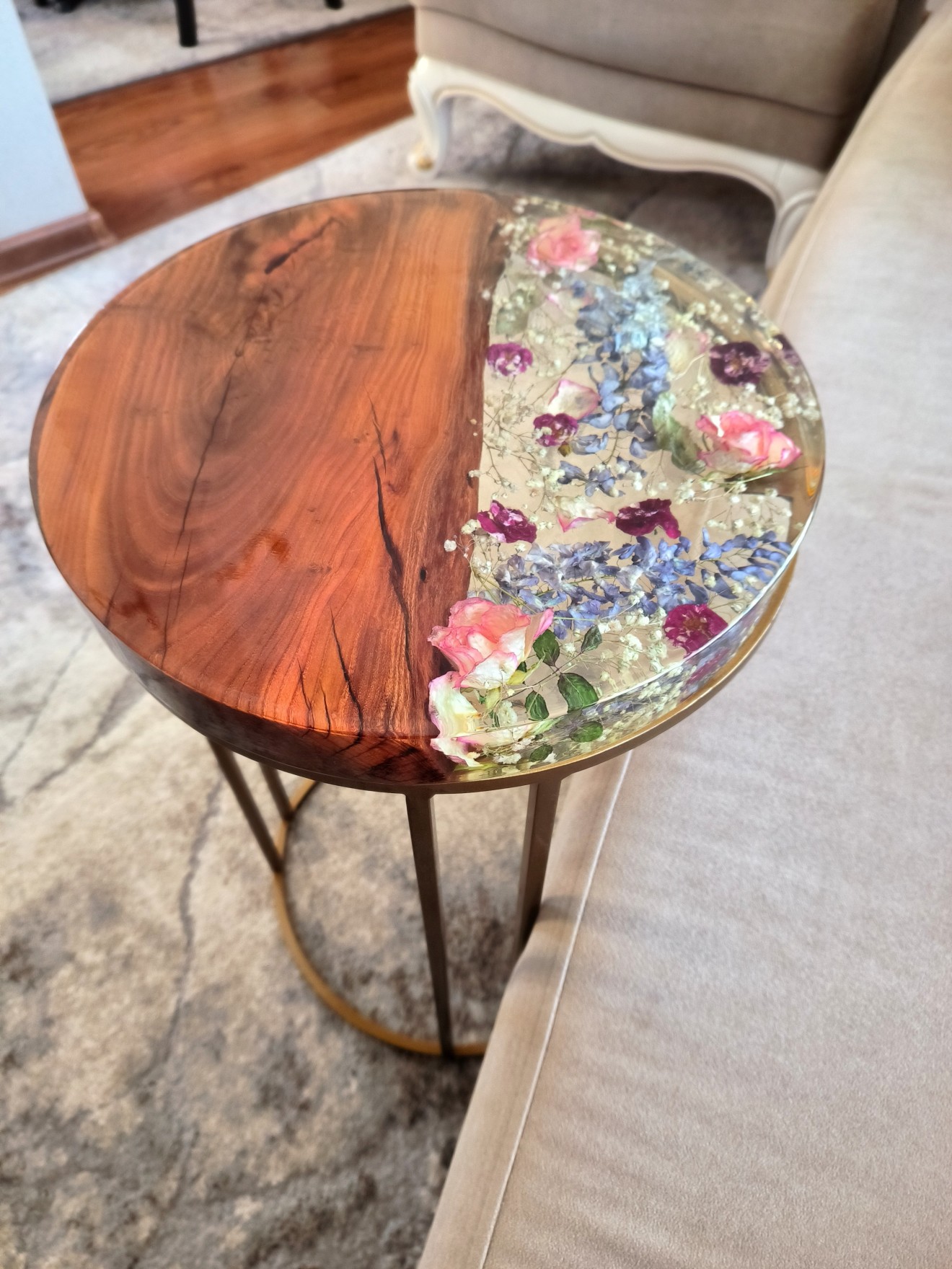 Елегантна и артистична, тази ръчно изработена помощна маса комбинира естествена красота и изящна изработка. Повърхността ѝ съчетава бадемово дърво и прозрачна епоксидна смола, в която нежно са вградени цветове от глициния – символ на изтънченост и спокойствие. Краката са ръчно изработени от ковано желязо, придаващи стабилност и характер на цялата конструкция. Идеална за интериор с вкус към уникалното и естественото. ● Размери: Ø36.5 см / 60 см (височина) ● Цвят : черно / златно