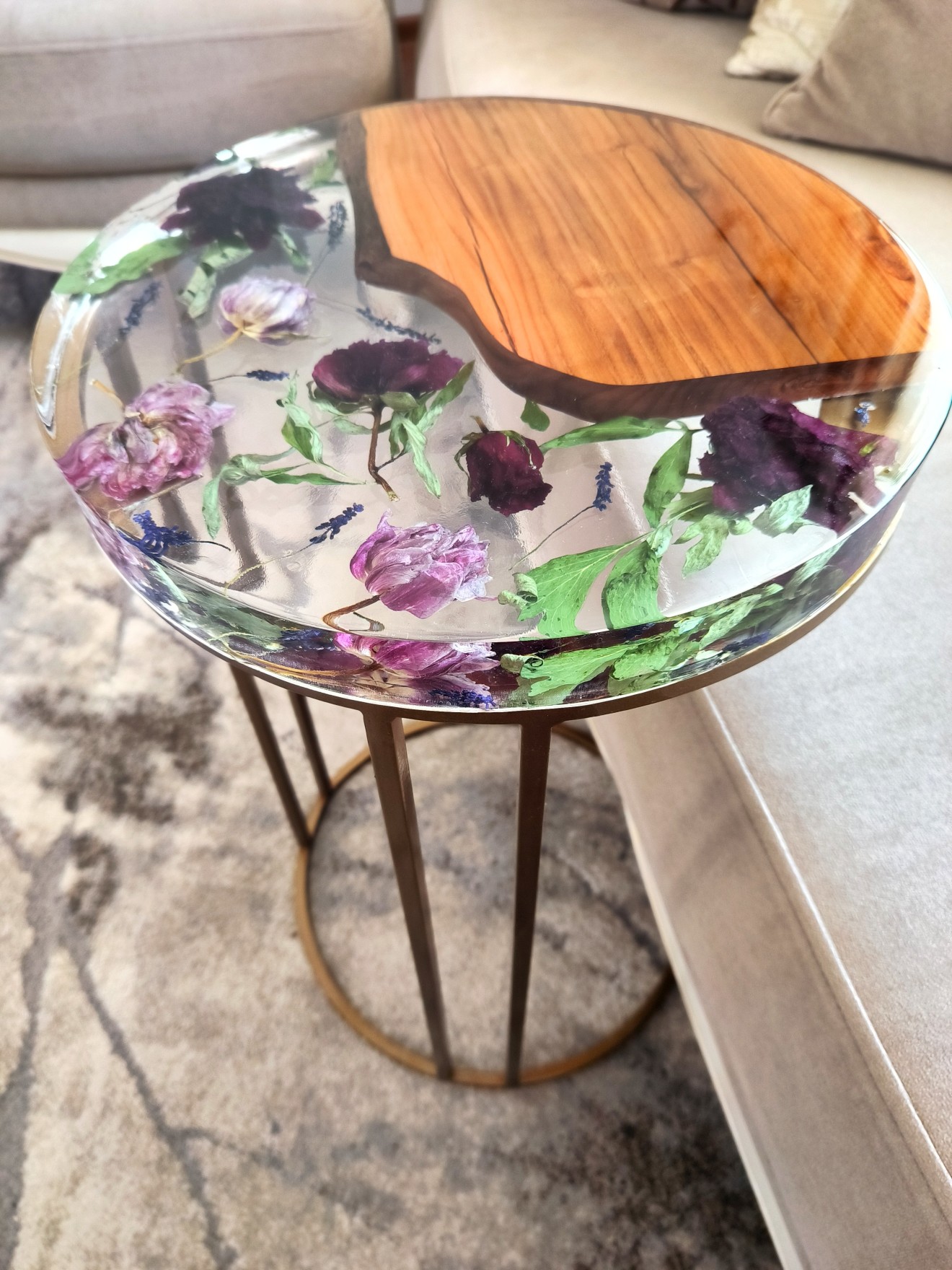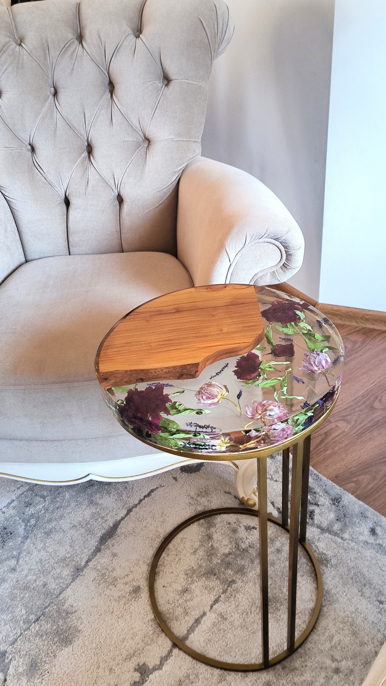 Тази фина и изящна помощна маса внася пролетна свежест и естествена красота във всеки дом. Плотът е изработен от бадемово дърво и прозрачен слой епоксидна смола, в който са внимателно вградени лалета и божури – нежно съчетание, което създава усещане за живот и хармония. Ръчно изкованите метални крака придават стабилност и елегантност. Перфектен акцент за интериор, носещ топлина и характер. ● Размери: Ø36.5 см / височина 60 см ● Цвят: черно / златно
