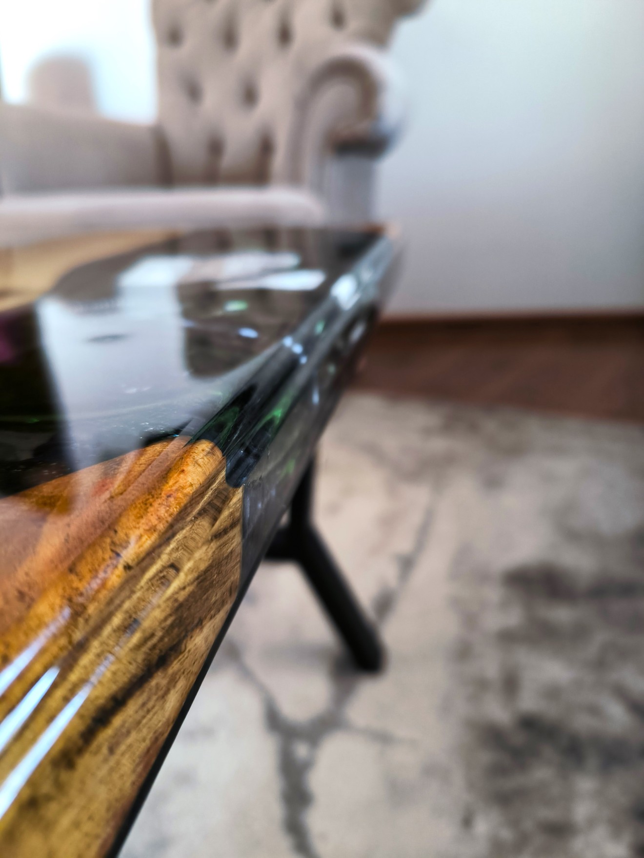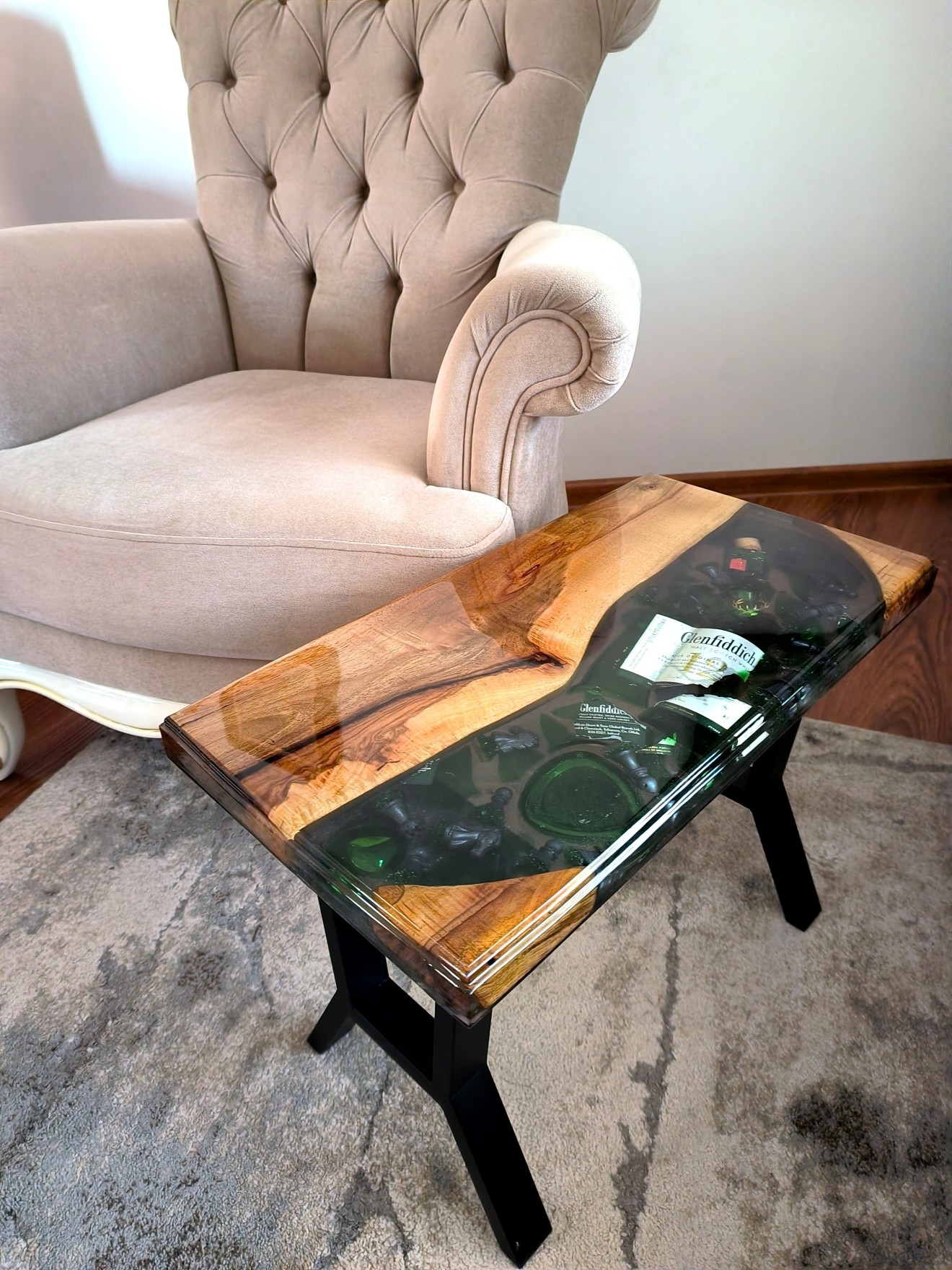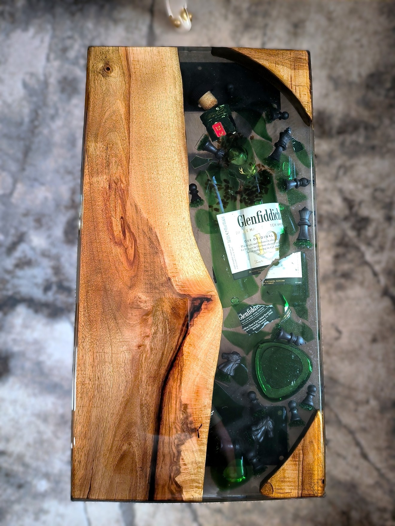 Тази ръчно изработена маса е истинско произведение на изкуството – предмет, който разказва история. В епоксидната ѝ повърхност са вградени фрагменти от счупена бутилка Glendfiddich и разпръснати шахматни фигури, застинали в миг на движение. Топлите тонове на естественото дърво балансират динамиката на композицията, придавайки усещане за дълбочина и контраст. Изключителен акцент за модерен интериор или оригинален подарък с характер. ● Размери: 58 см (дължина) / 30 см (ширина) / 43 см (височина)