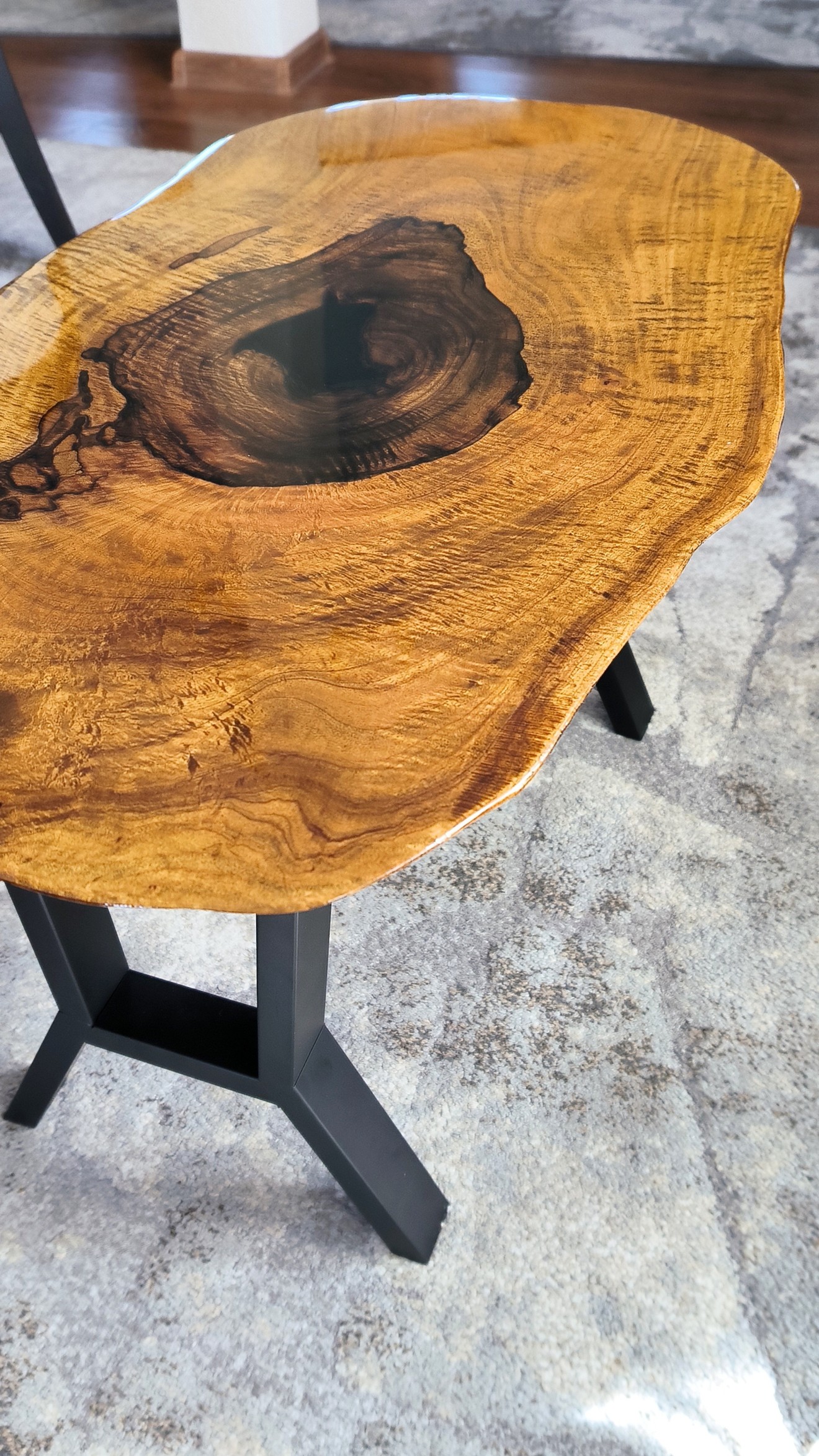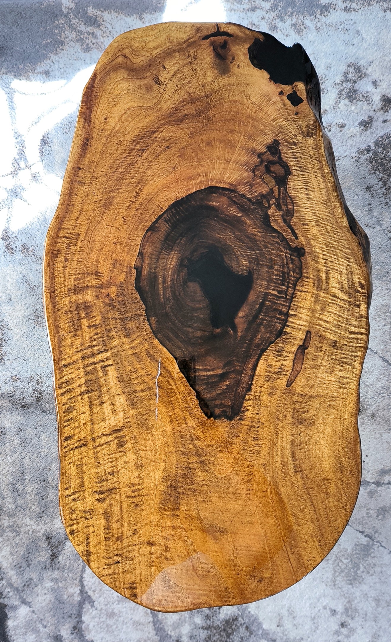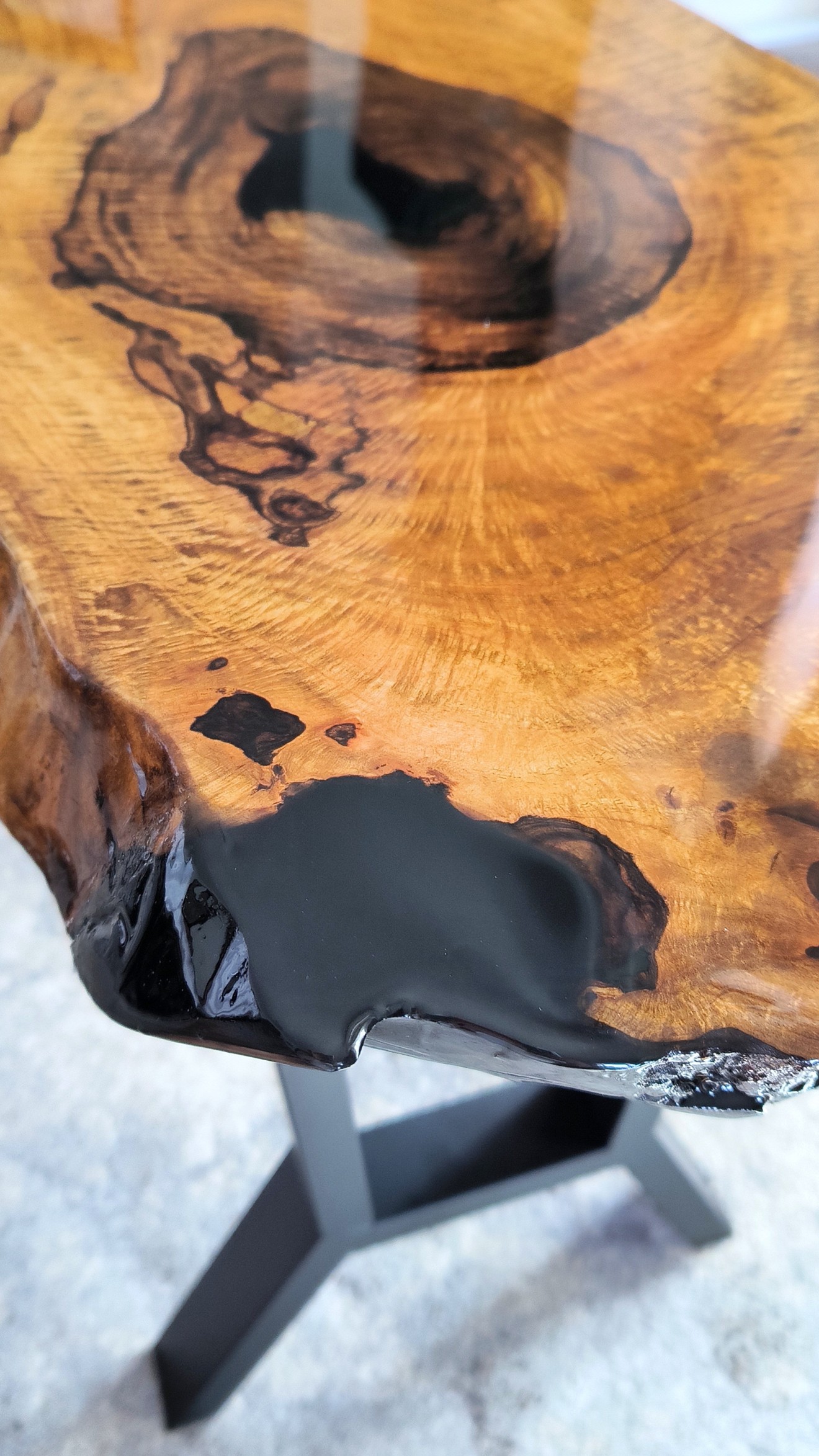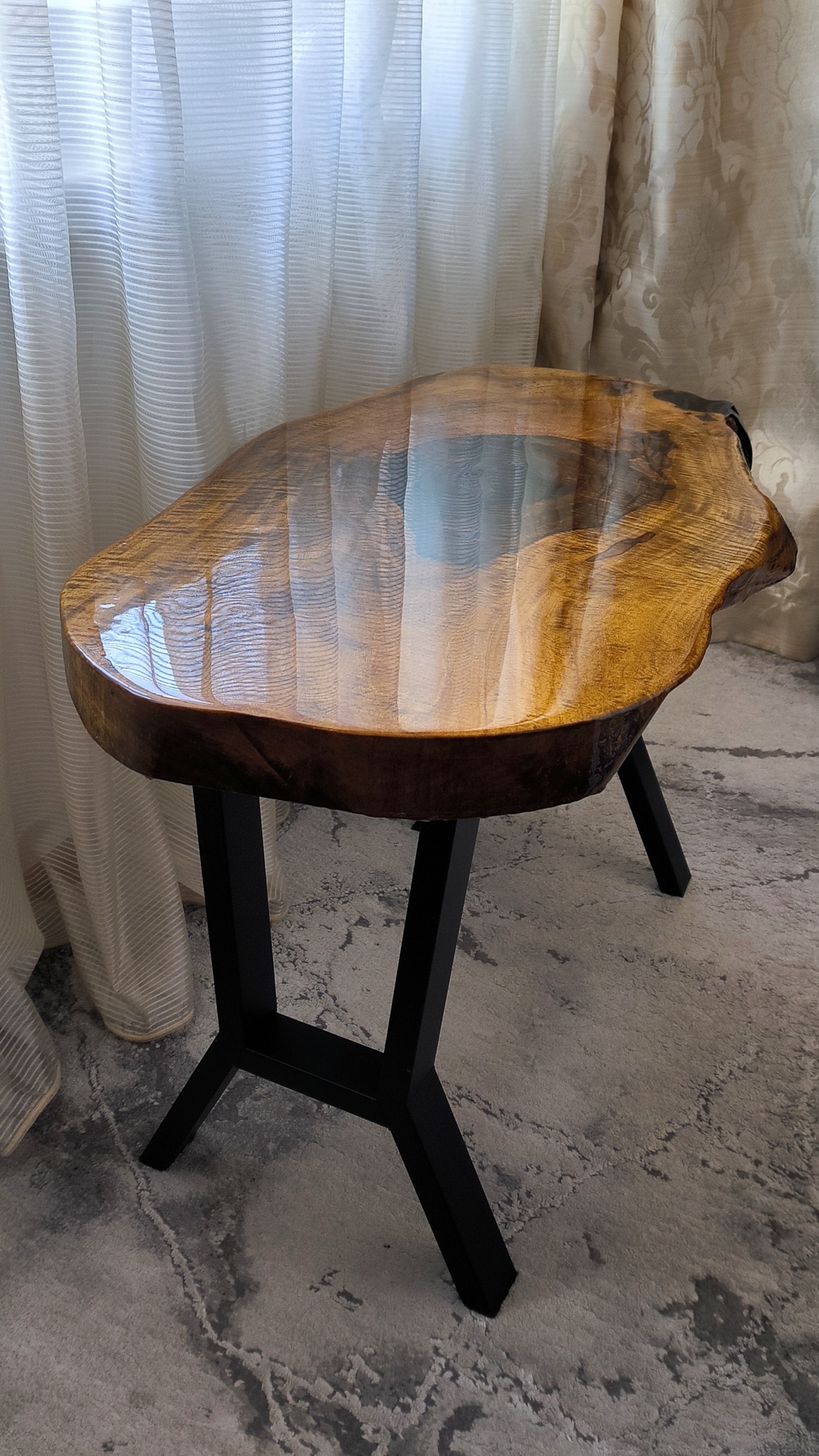 Тази изящна холна маса е изработена ръчно от масивна шайба орех, запазила естествената си форма и характер. Фините цепнатини и естествени кухини са запълнени с черна епоксидна смола, която подчертава дълбочината и шарките на дървото. Гланцовият завършек придава блясък и защита, съчетавайки устойчивост с изтънченост. Всеки модел е уникален – със собствена история и неподправено усещане за природа, което внася топлина и стил във всеки интериор.