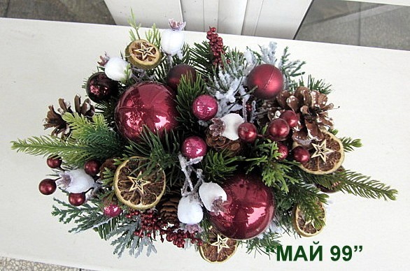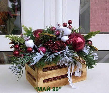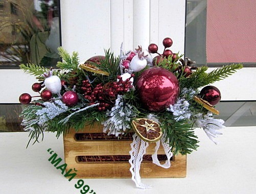 Коледна украса в дървена щайга, зебло/ 16 см. с изкуствени зелени и заскрежени клонки,шишарки,резенчета протокал,канела,памук,топки и винено червени топчета с обща дължина см.26 см.