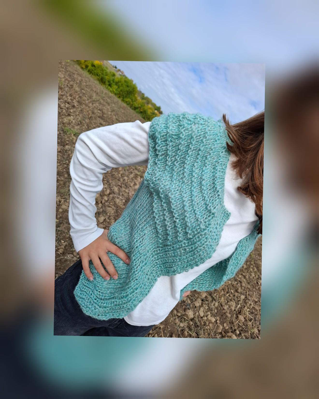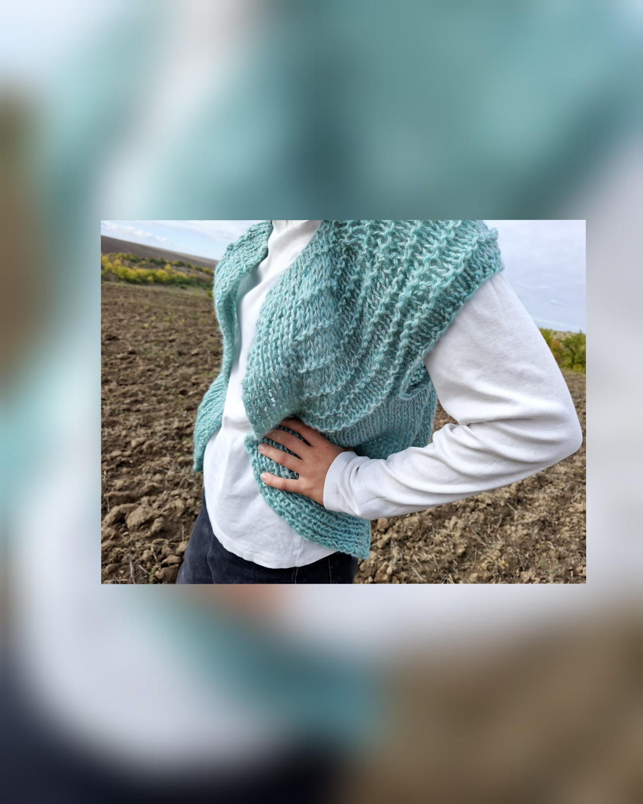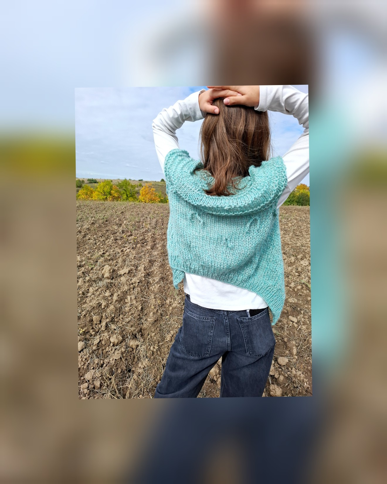 Ръчно изплетена пухкава, мека и топла жилетка. В нежно син цвят, в два преплетени нюанса. С лъскава нишка и красива плетка. Обгръща, като топла прегръдка. Пада елегантно, подходяща за панталон, пола или дънки. Размер S/M. Прежда 20% вълна, 75% акрил, 5% металик; 20% вълна, 80% акрил. Пристига опакована в кутия с панделка. Възможност за добавяне на лично пожелание, когато е за подарък. Напишете съобщение, за да уточним. И разбира се, с инструкции за пране и почистване. Може да се изработи подобна, според Вашите изисквания. 💝 Подходяща е за романтичен жест, за рожден ден, имен ден, Коледа или друг повод, особено ако търсите подарък, който ще се използва. Поздрави! Пълноцветни дарове