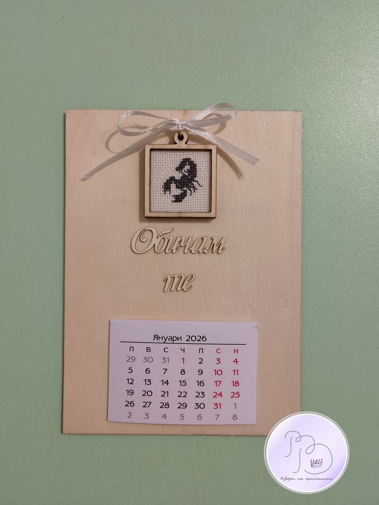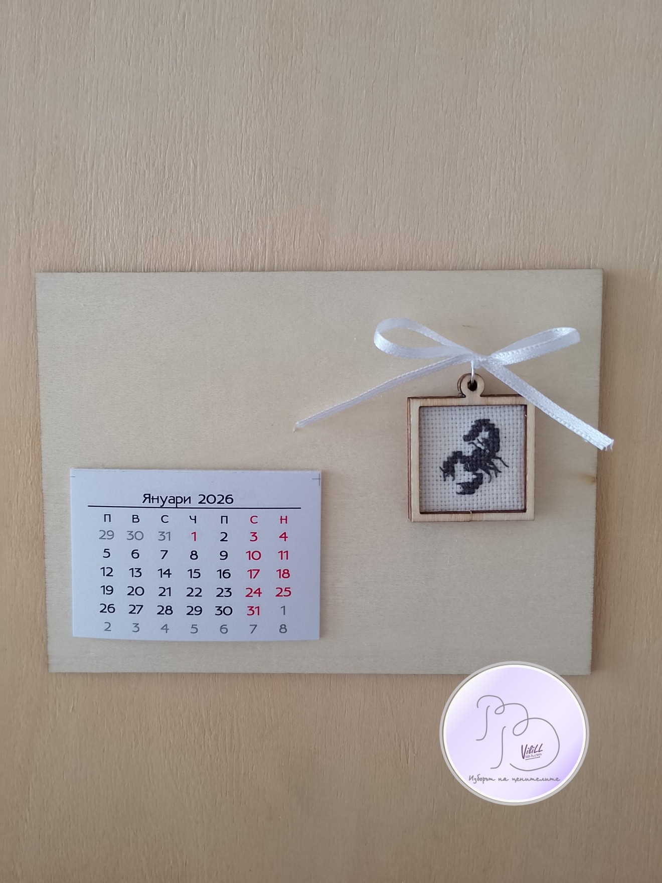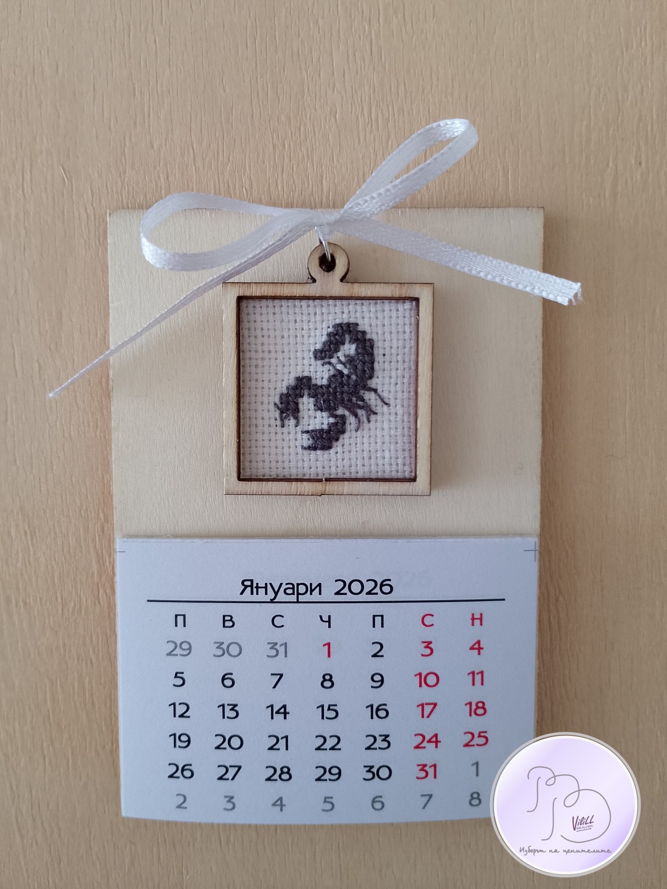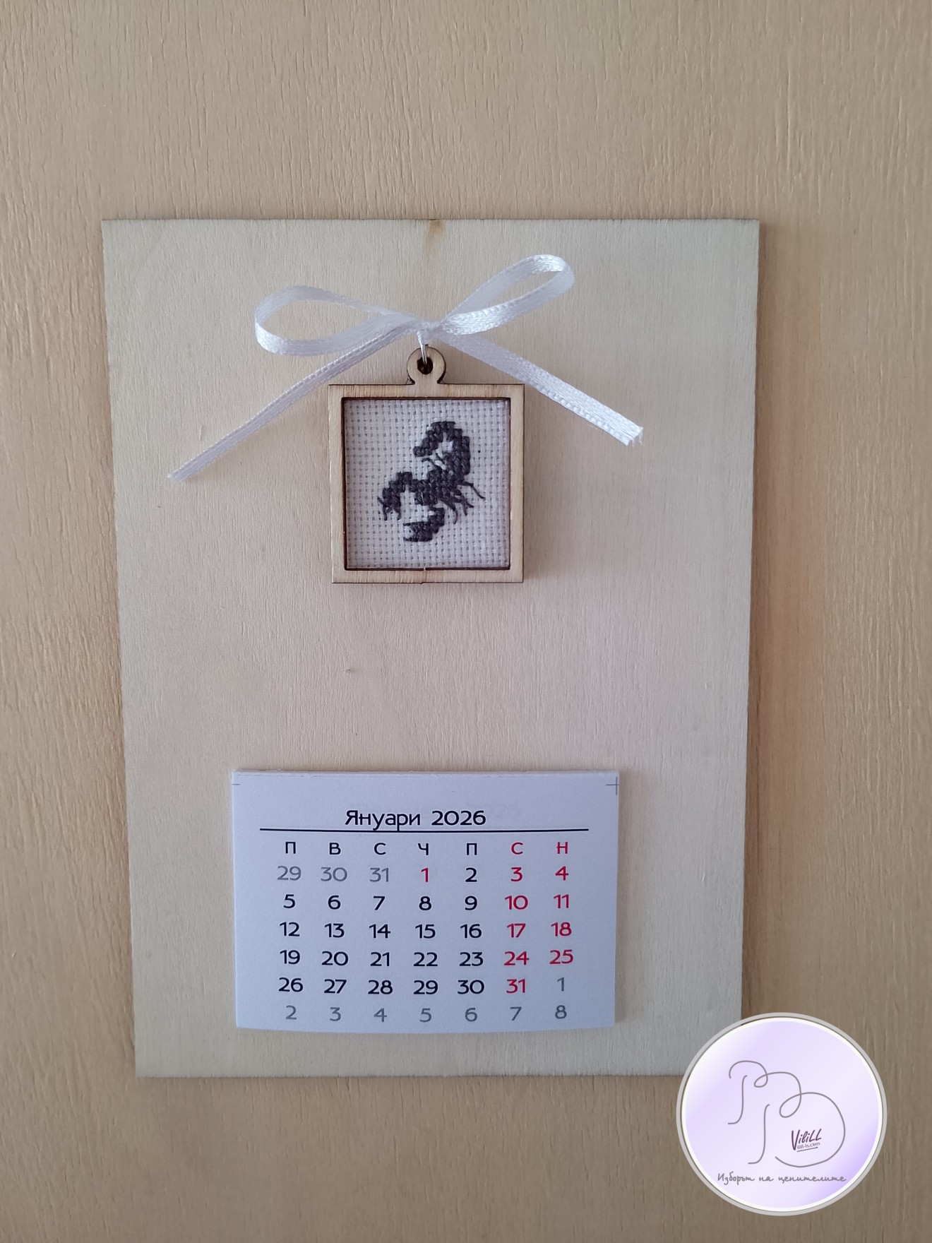 Календар-магнитче 2026 е практична и символична идея за подарък за зодия Скорпион за наближващите зимни празници. Приблизителни размери: -15х11см. -7.10см. Материал: -основа от дърво. -бродиран мотив. -12 листчета с месеците. Изработвам буква и цвят по Ваш избор, както и по различна от представената тема. Може и като магнитче, може да се разположи и на стойка/статив или комбинация от двете според желанието на получателя. Цена: 1.вариант магнитче: -размер 15х11см- 15.00лв./7.67 евро./1 календарче-магнит с бродерия. -размер 7х10см- 12.00лв./6.14 евро./1календарче-магнит с бродерия. 2.вариант настолен календар на стойка: -размер 15х11см- 17.00лв./8.69 евро/1 календарче с бродерия. Доставка до офис на Еконт за сметка на получател или чрез лично предаване в границите на моя град.