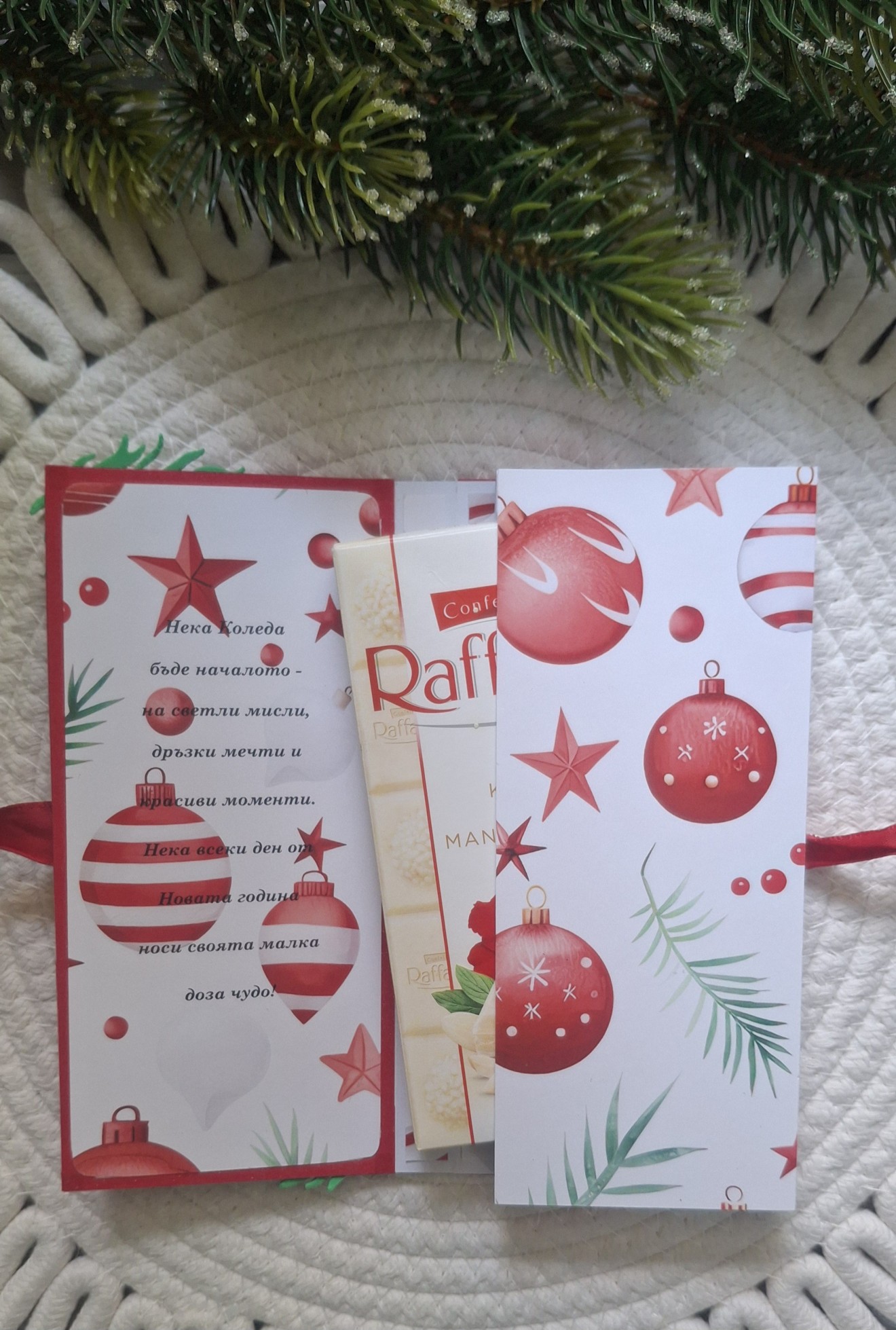 Празниците винаги идват с аромат на сладки спомени, топли усмивки и, разбира се… шоколад! 🍫 А когато шоколадът е „опакован“ в картичка – получаваме най-уютния и различен подарък. Тази картичка шоколад е идеална за всеки, на когото искате да подарите нещо мъничко, но специално: ✨ За колеги и колежки – да внесете празнично настроение в офиса. ✨ За приятели – малък жест, който казва „мисля за теб“. ✨ За учители, треньори или класни ръководители – защото заслужават нещо лично и красиво. ✨ За размяната на подаръци в училище, на работа или в компанията на приятели. ✨ За съседа, който винаги ви усмихва с „добро утро“. ✨ А защо не и за семейството или за вас самите – защото и вие заслужавате коледна сладост! Понякога най-милите подаръци са тези, които носят усмивка, без да са големи и сложни. 👉 Картичката е без шоколад.