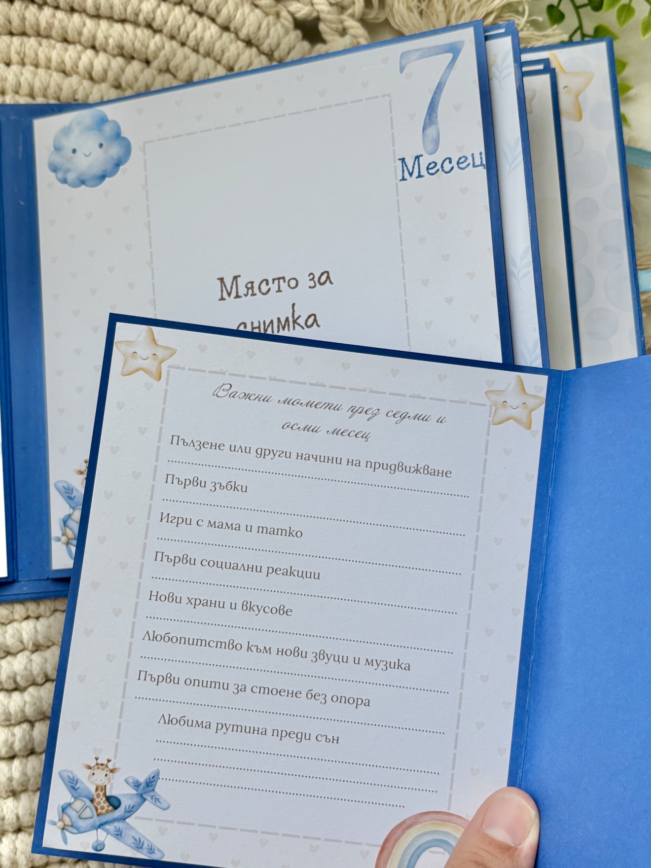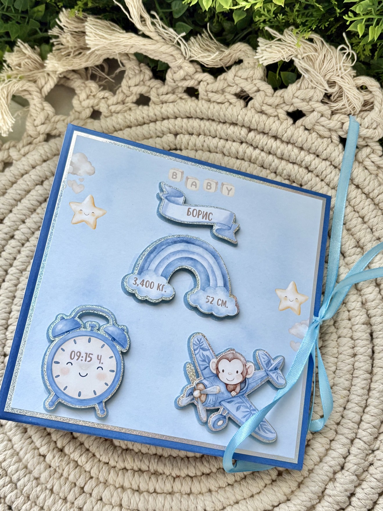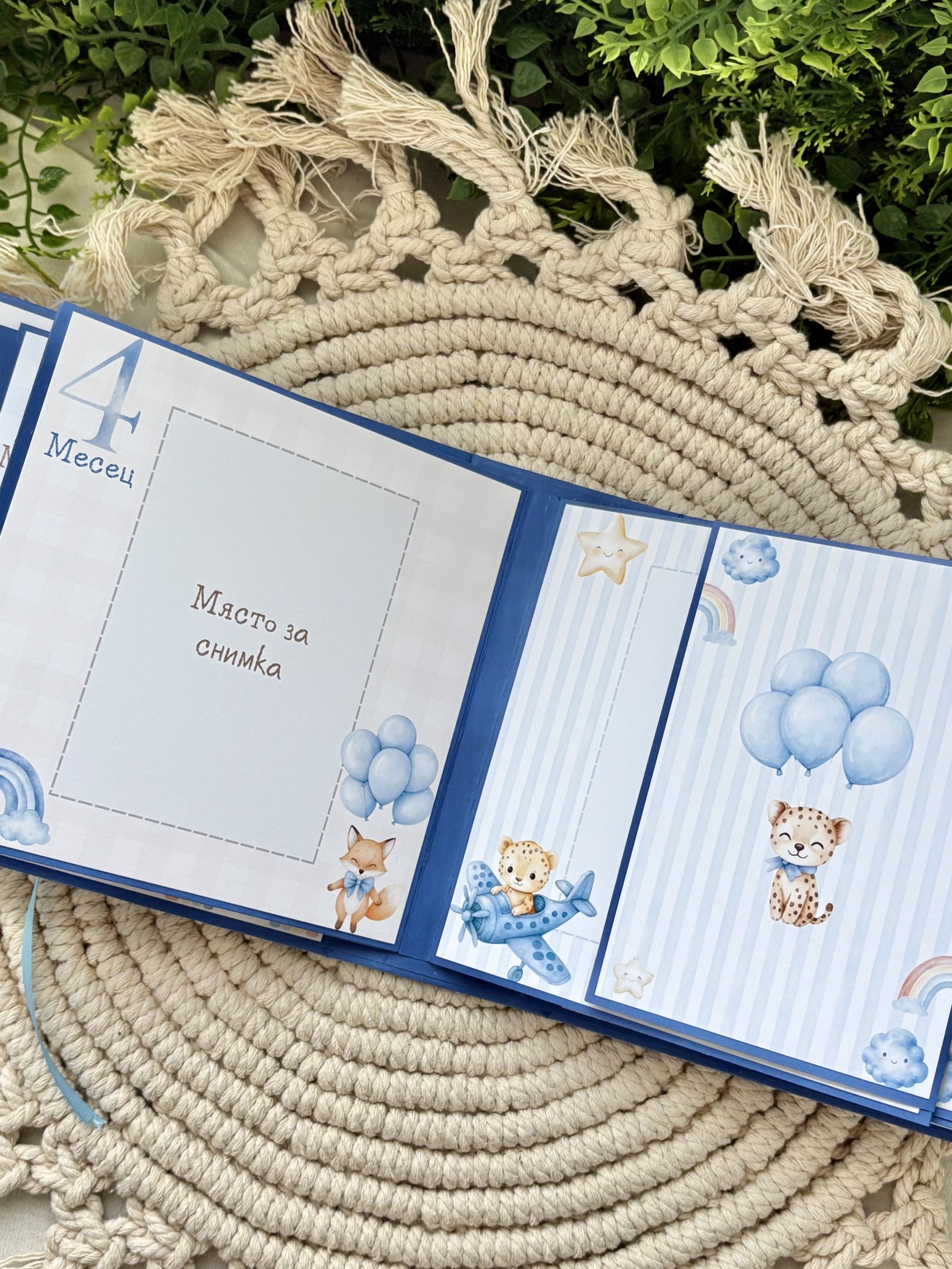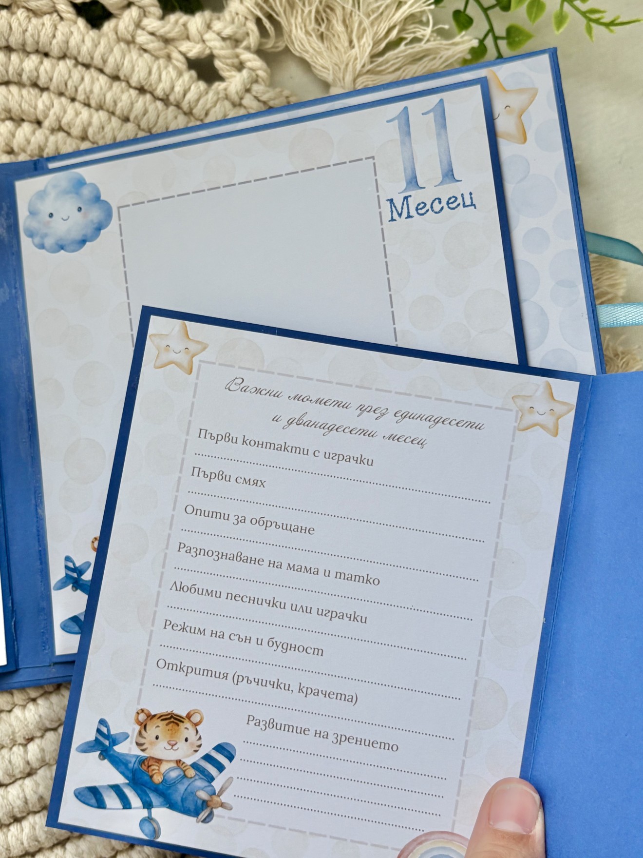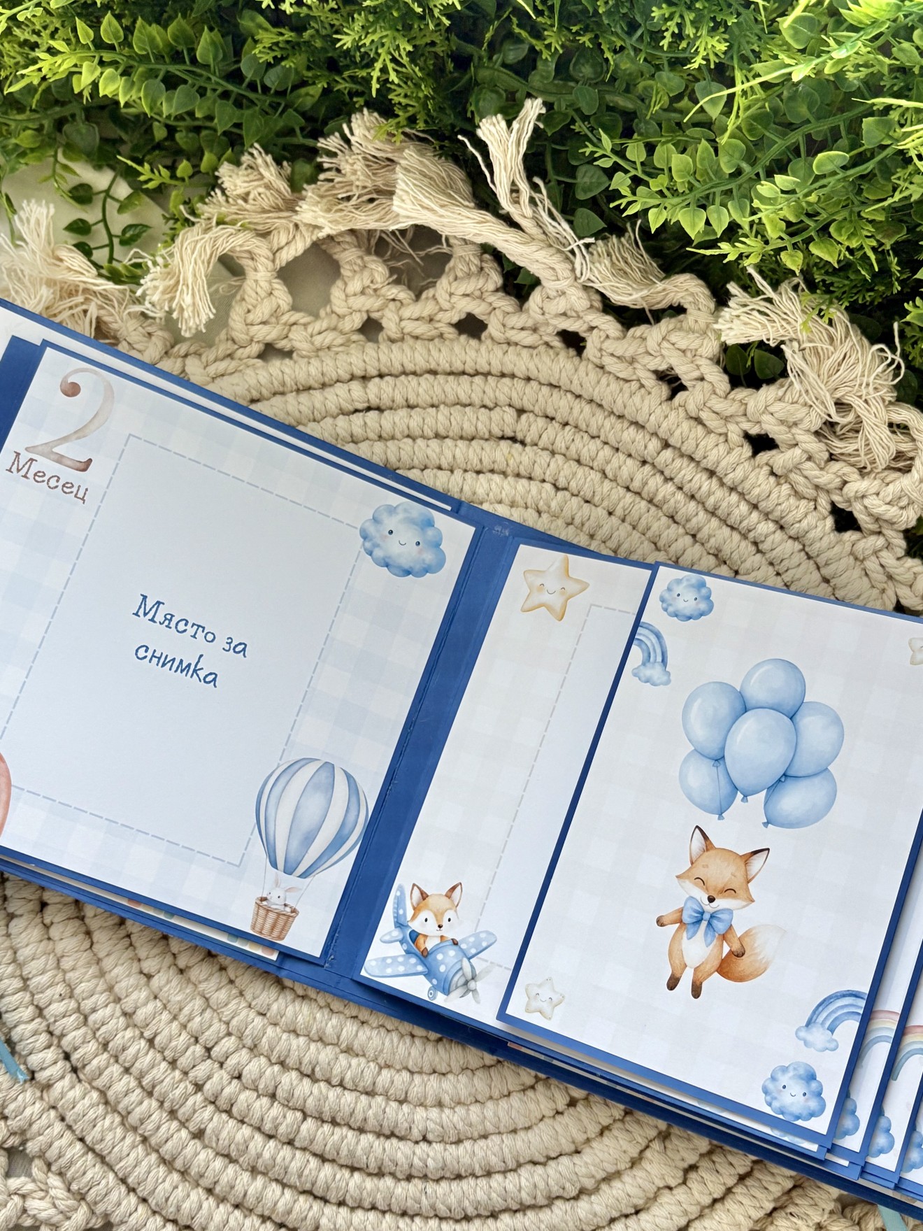 Запазете най-сладките спомени от първата годинка на вашето мъниче! Този нежен албум дневник ще ви помогне да съхраните всяка усмивка, първо зъбче и вълнуващ момент от израстването. ⭐ Размер: 17 х 17 см ⭐ 6 страници с месеците от 1 до 12 и място за снимки ⭐ Вложки за спомени по два месеца (1–2, 3–4, 5–6, 7–8, 9–10, 11–12) ⭐ Персонализирана корица с името на бебето и 3D елементи – дъга, часовник и маймунка на самолет ⭐ Изписани са: име, дата и час на раждане, килограми и сантиметри ⭐ Основен цвят: син, с нежни животни и бебешки мотиви 💫 Защо да го изберете: защото всяко бебе заслужава красиво място, където първите му моменти да оживеят отново. 📦 Изработен от висококачествени картони, опакован в торбичка с принт на същата тематика. 💌 ПОДАРЪК: безплатна картичка в същия стил – за завършен и емоционален подарък!