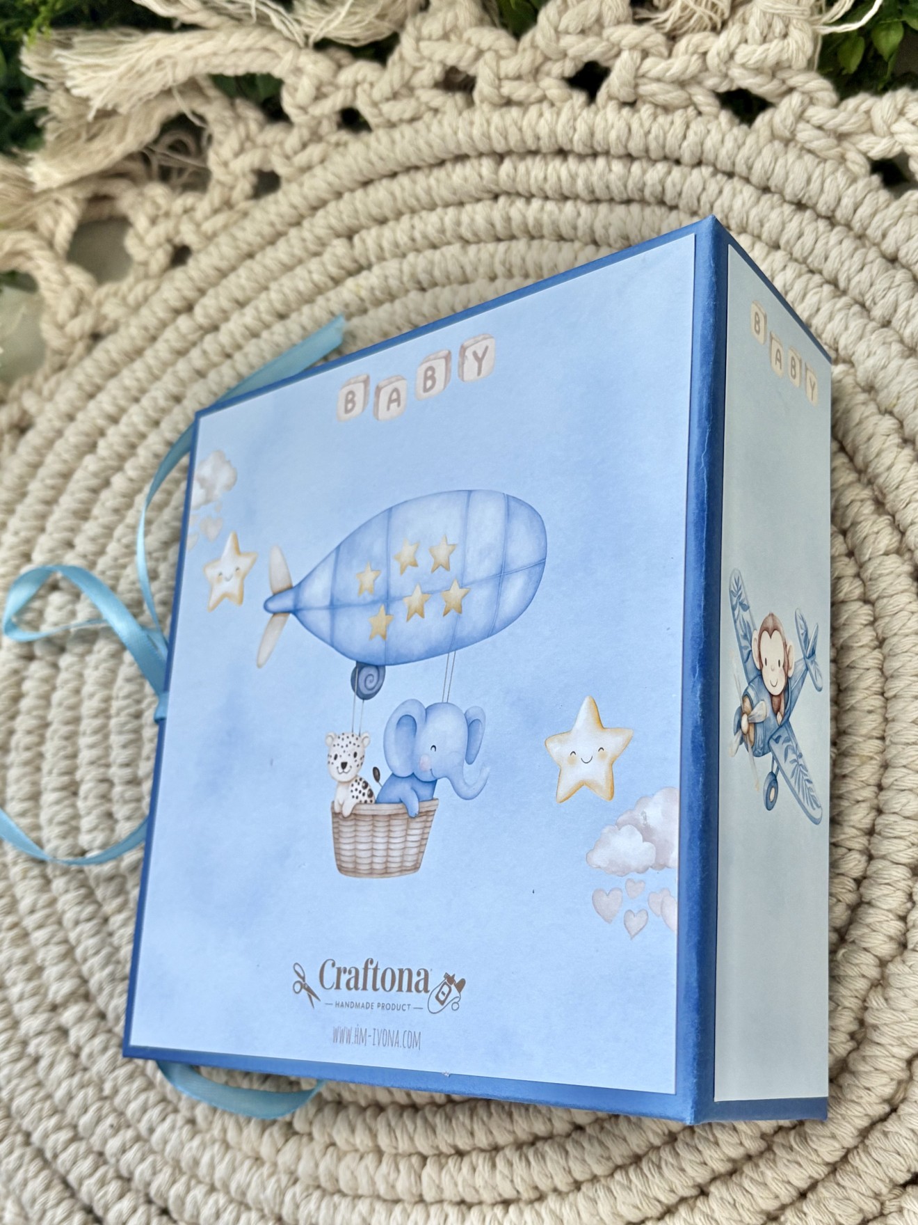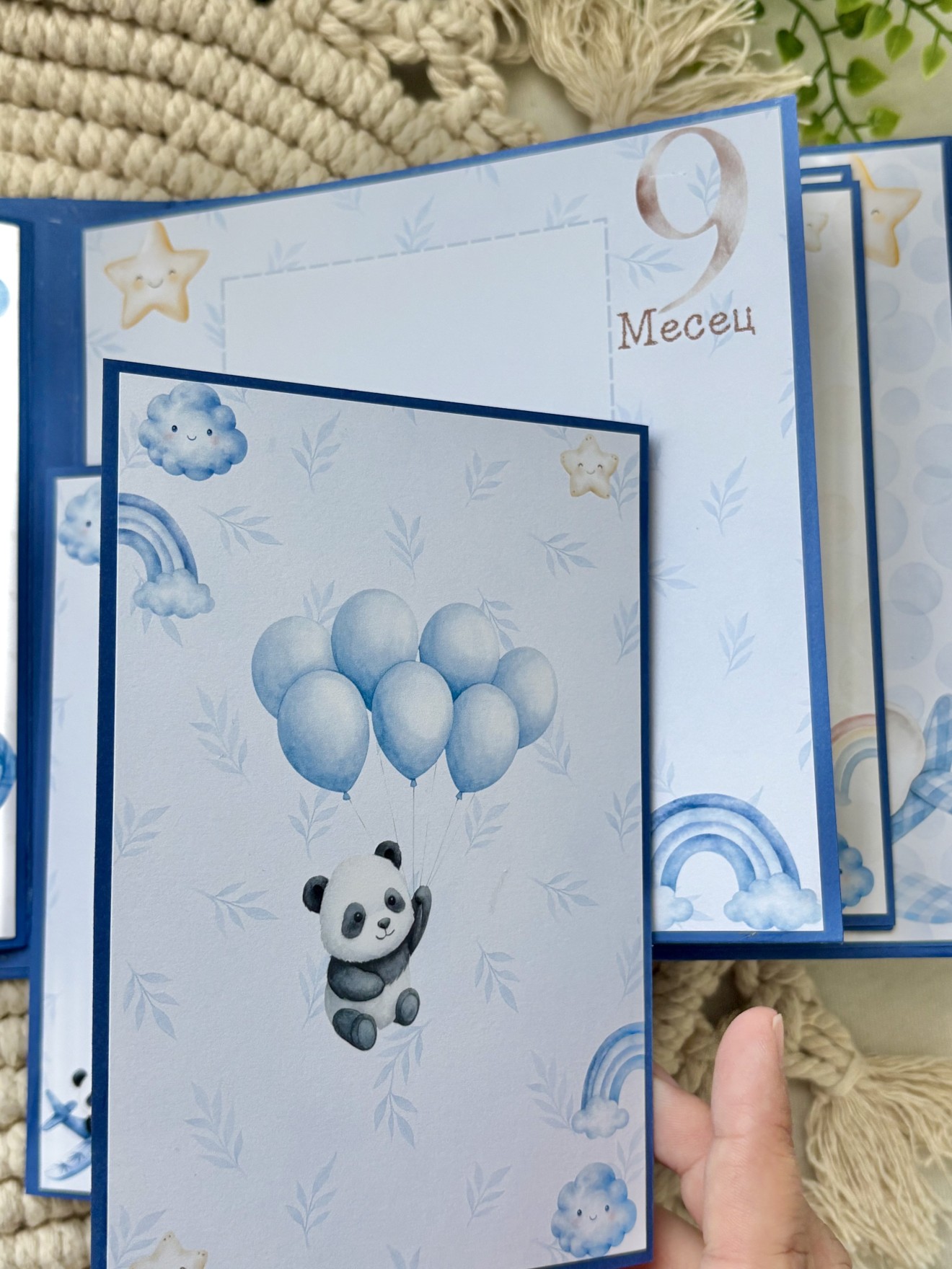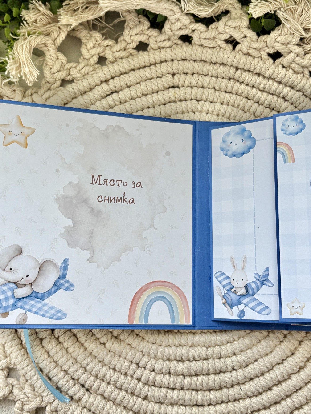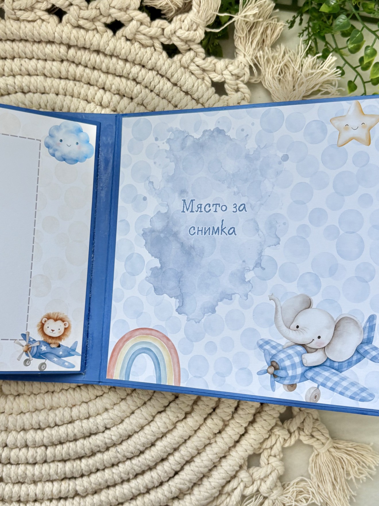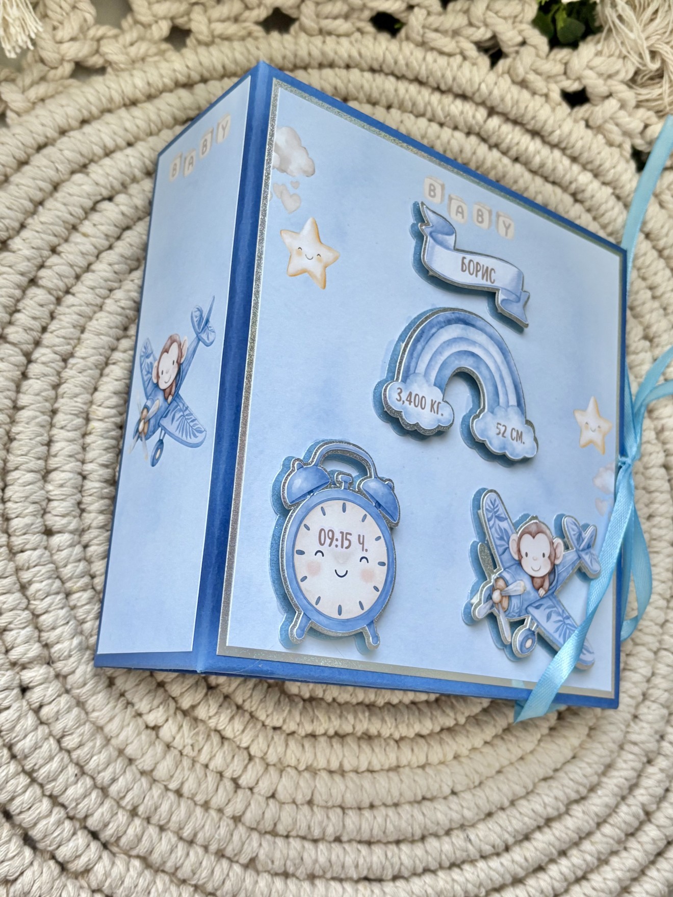 Запазете най-сладките спомени от първата годинка на вашето мъниче! Този нежен албум дневник ще ви помогне да съхраните всяка усмивка, първо зъбче и вълнуващ момент от израстването. ⭐ Размер: 17 х 17 см ⭐ 6 страници с месеците от 1 до 12 и място за снимки ⭐ Вложки за спомени по два месеца (1–2, 3–4, 5–6, 7–8, 9–10, 11–12) ⭐ Персонализирана корица с името на бебето и 3D елементи – дъга, часовник и маймунка на самолет ⭐ Изписани са: име, дата и час на раждане, килограми и сантиметри ⭐ Основен цвят: син, с нежни животни и бебешки мотиви 💫 Защо да го изберете: защото всяко бебе заслужава красиво място, където първите му моменти да оживеят отново. 📦 Изработен от висококачествени картони, опакован в торбичка с принт на същата тематика. 💌 ПОДАРЪК: безплатна картичка в същия стил – за завършен и емоционален подарък!