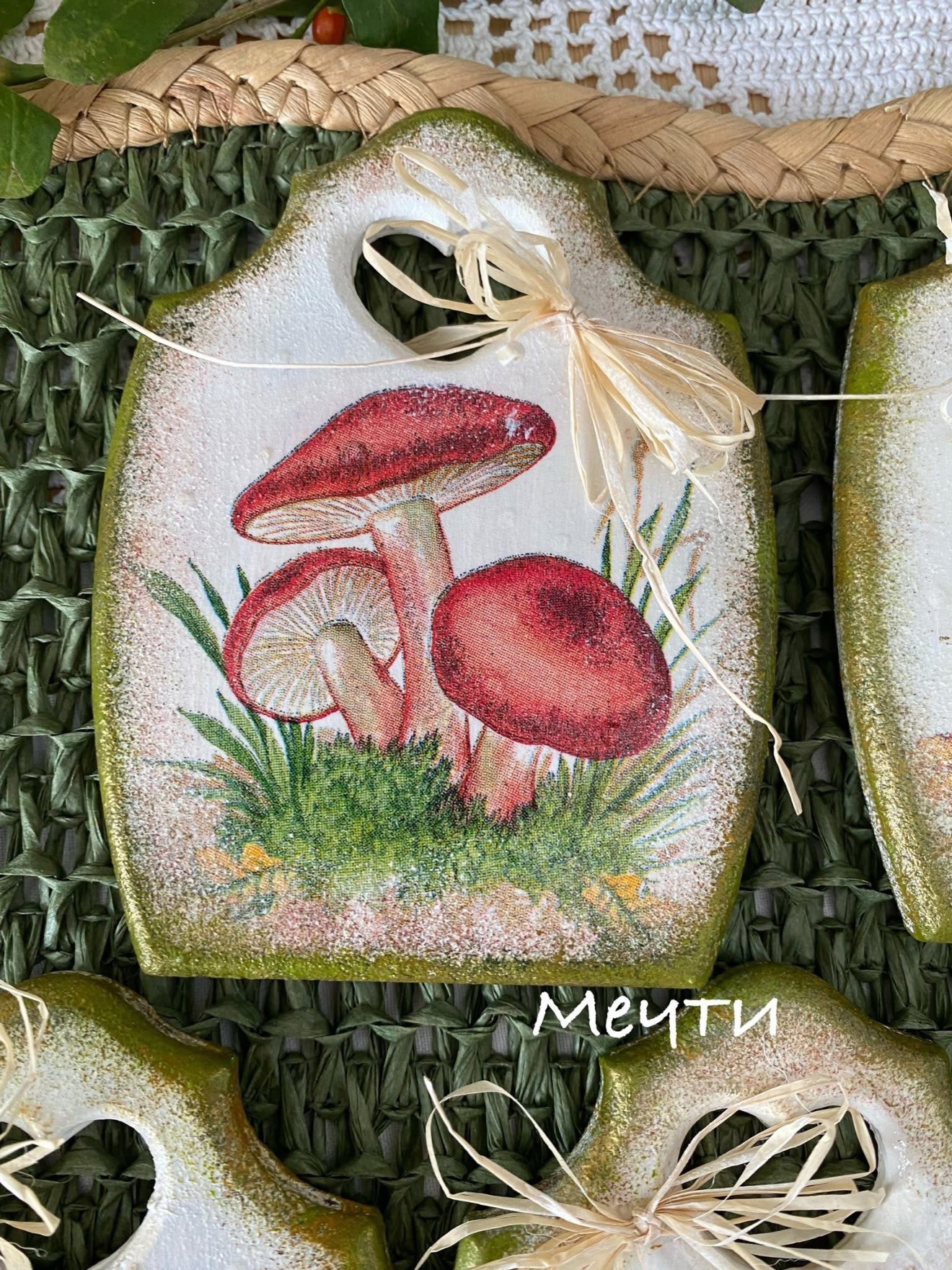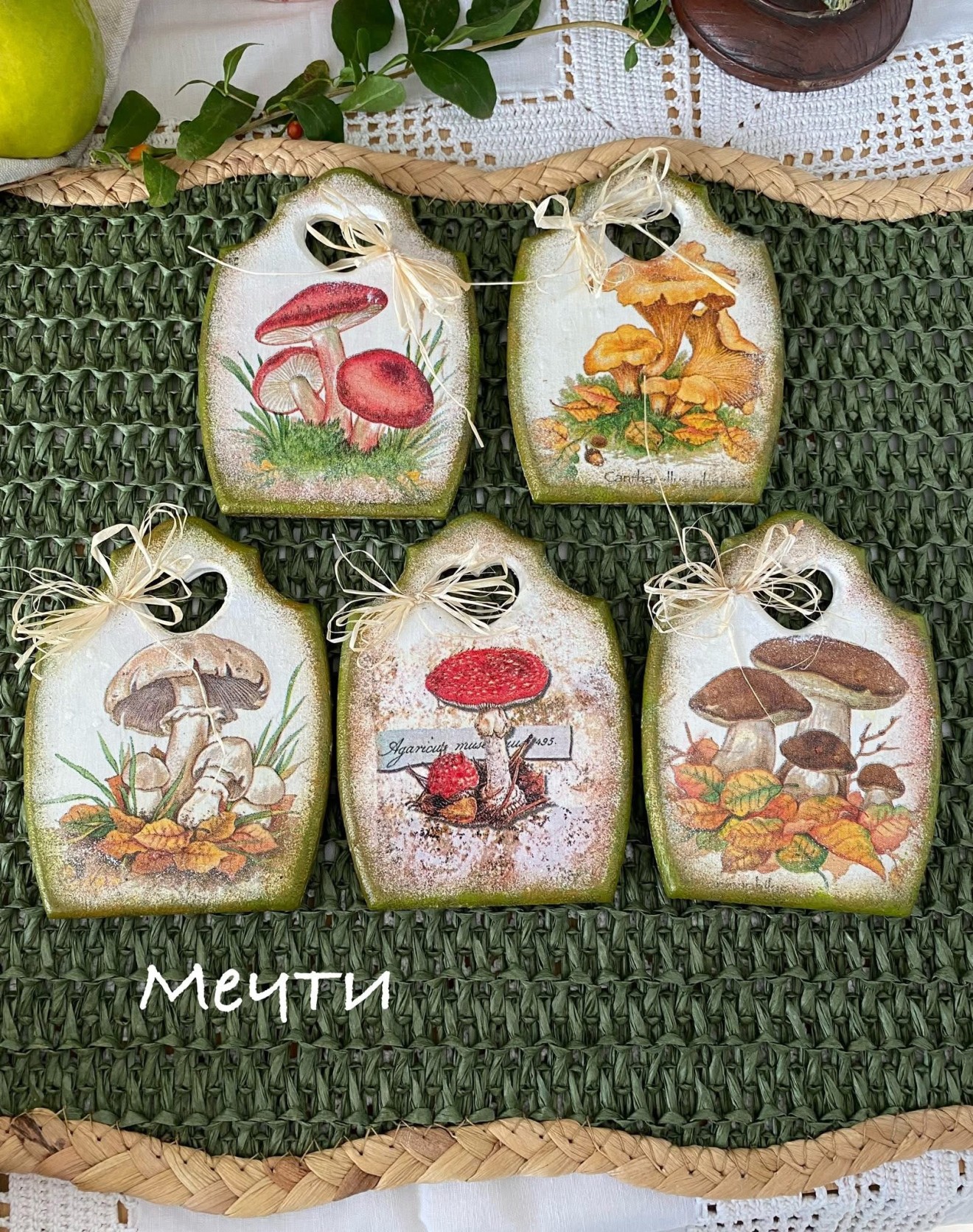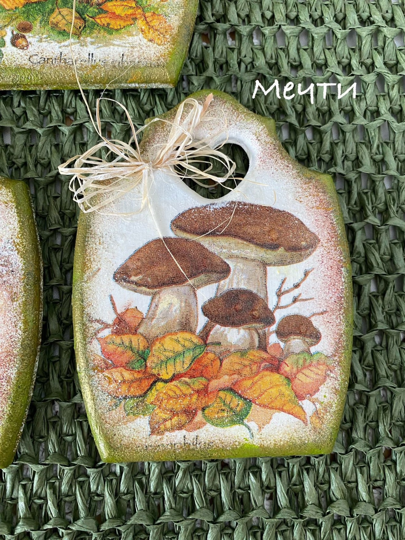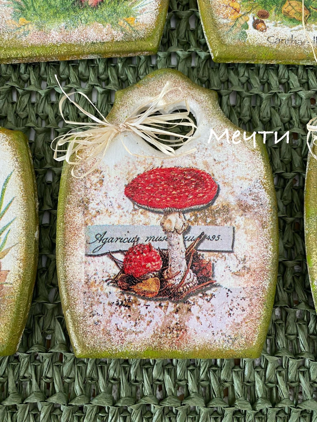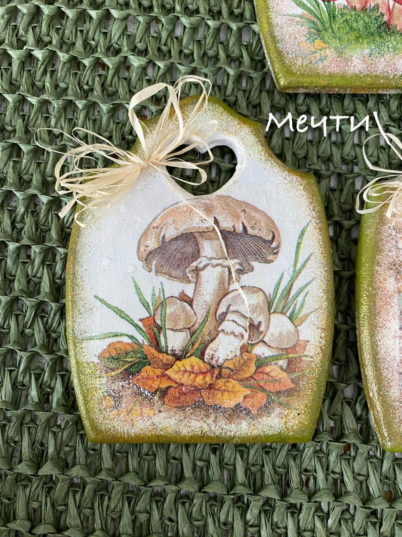 Магнити, мини дъсчици, декорирани с декупаж с мотиви на горски гъбки. Размери; 11см./8,3см. Цена-12лв. Пет броя в наличност.