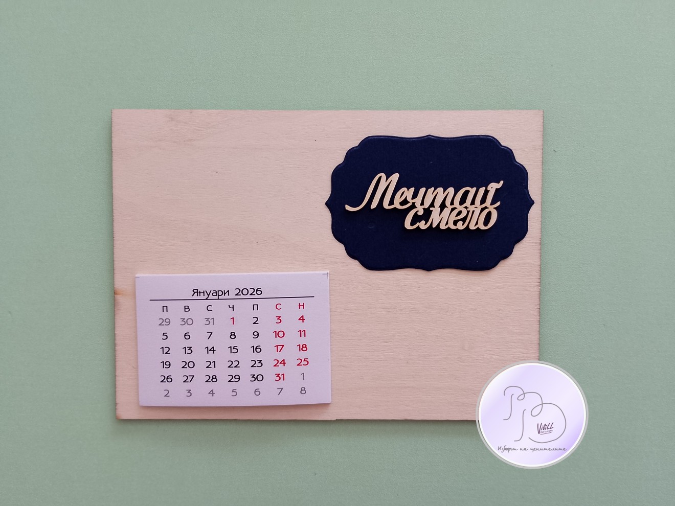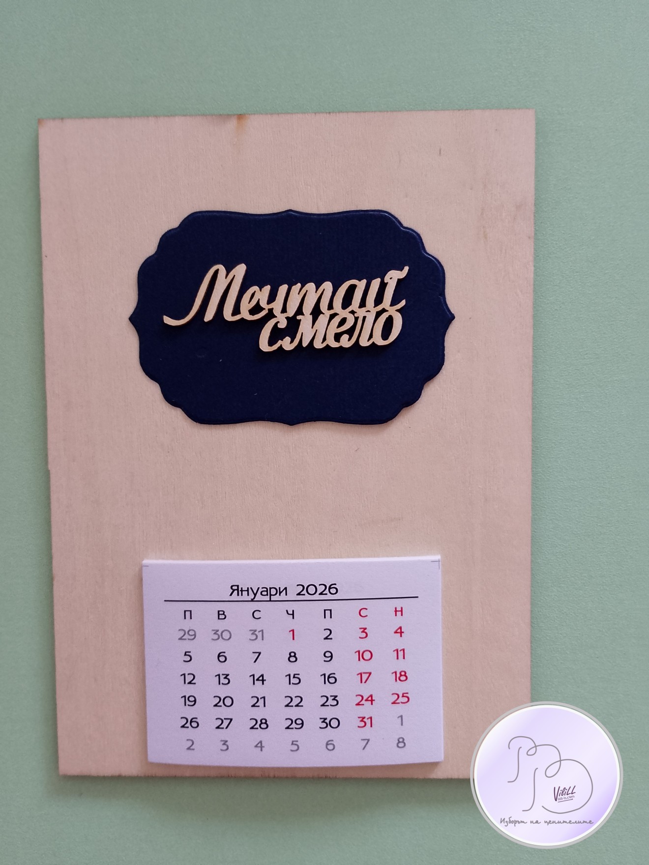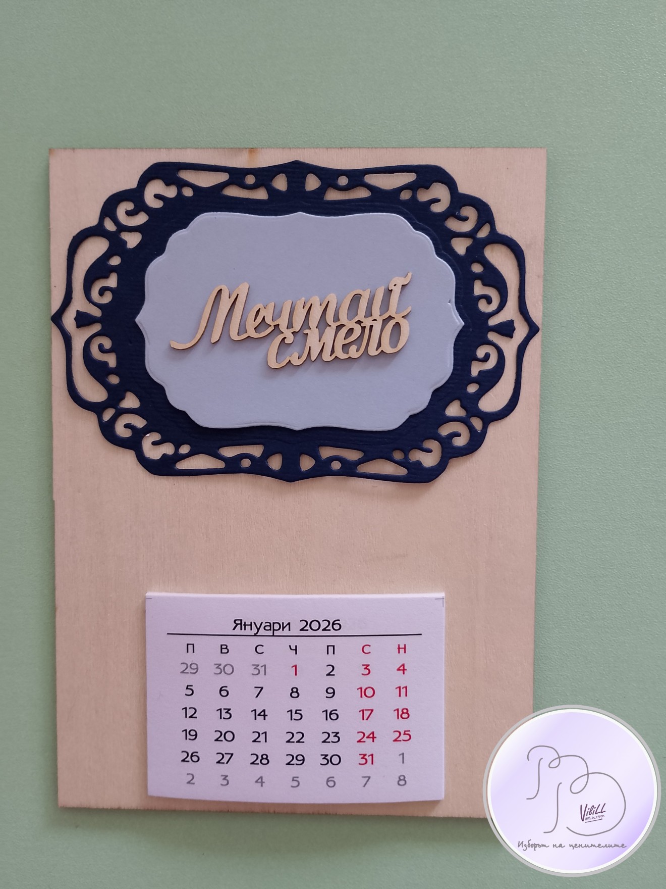 Календар "Мечтай смело". Приблизителни размери: 15х11см. Материал: -основа от дърво. -декоративни елемент. -12 листчета с месеците. -магнитче или поставка. Снимките са мостри за нагледна представа, възможни са различни съчетания.Изработвам по поръчка. Времето за изработка е е ориентировъчно и обикновено е по-малко от обявеното, зависи от наличности и доставки на заготовки. Може и като магнитче, може да се разположи и на стойка/статив или комбинация от двете според желанието на получателя. 📌Цена: 1.вариант календар-магнитче: -размер 15х11см- 10.00лв./5.11 евро./1 календарче-магнит. 2.вариант настолен календар на поставка: -размер 15х11см- 10.00лв./5.11 евро/1 календар. Доставка до офис на Еконт за сметка на получател. 10% от цената дарявам за развитието на платформата! При интерес- на Ваше разположение съм да обсъдим подробностите. Facebook-РъкоВелиеViliLL
