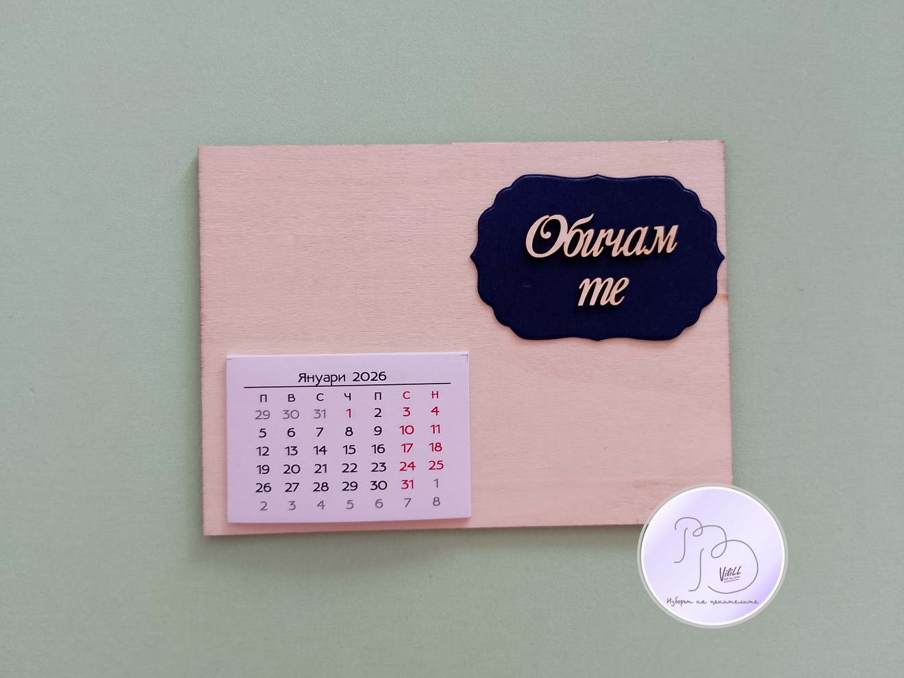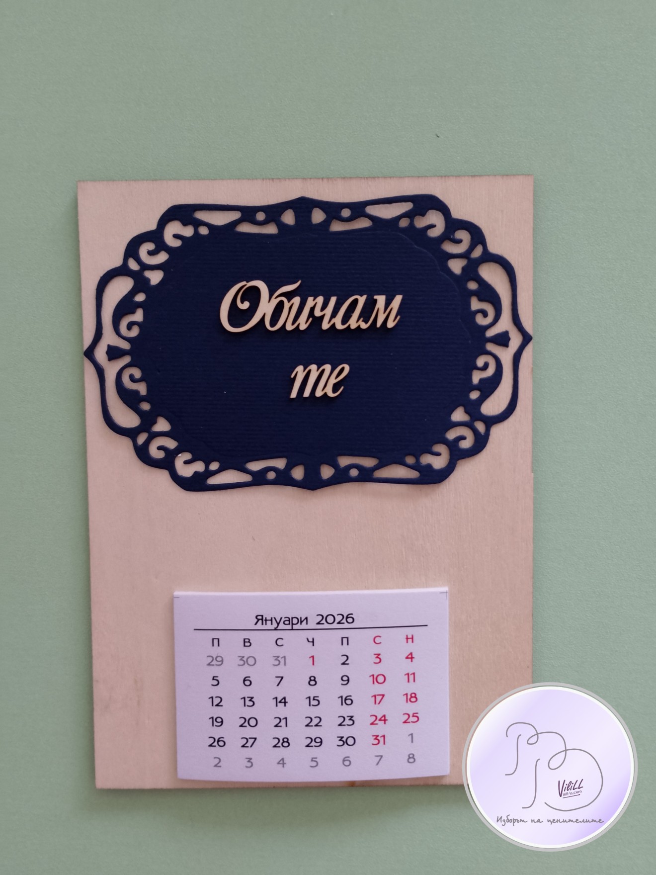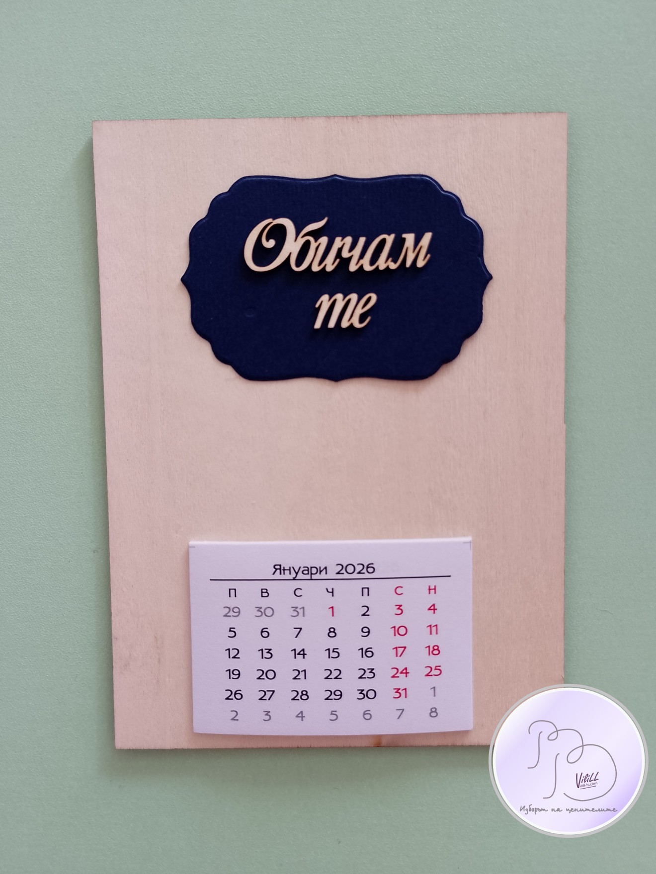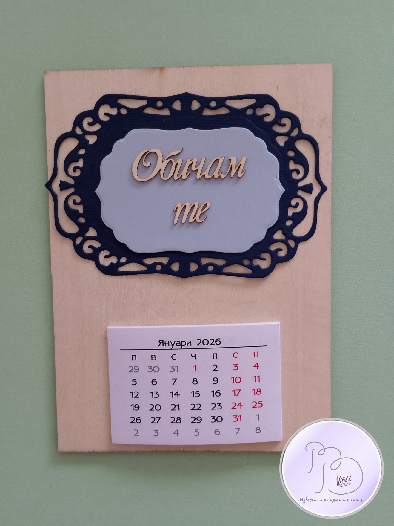 Календар "Обичам те". Приблизителни размери: 15х11см. Материал: -основа от дърво. -декоративни елементи. -12 листчета с месеците. -магнитче или поставка. Снимките са мостри за нагледна представа, възможни са различни съчетания.Изработвам по поръчка. Времето за изработка е е ориентировъчно и обикновено е по-малко от обявеното, зависи от наличности и доставки на заготовки. Може и като магнитче, може да се разположи и на стойка/статив или комбинация от двете според желанието на получателя. 📌Цена: 1.вариант календар-магнитче: -размер 15х11см- 10.00лв./5.11 евро./1 календарче-магнит. 2.вариант настолен календар на поставка: -размер 15х11см- 10.00лв./5.11 евро/1 календар. Доставка до офис на Еконт за сметка на получател. 10% от цената дарявам за развитието на платформата! При интерес- на Ваше разположение съм да обсъдим подробностите. Facebook-РъкоВелиеViliLL