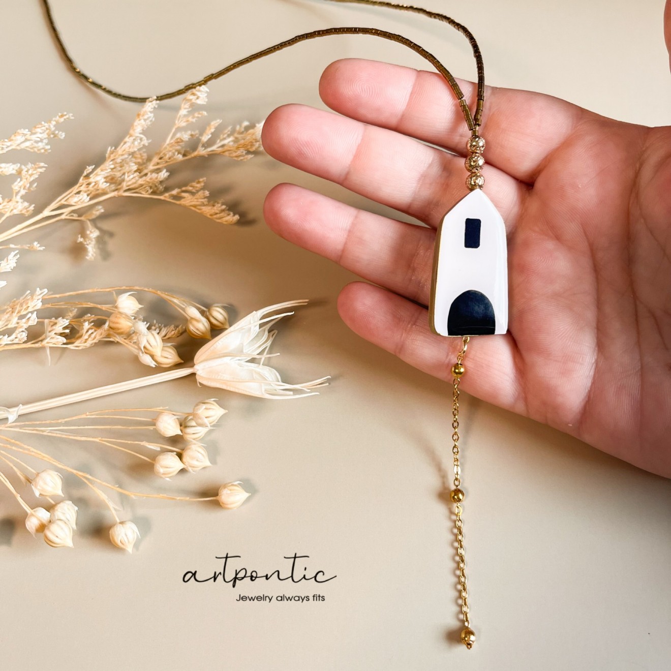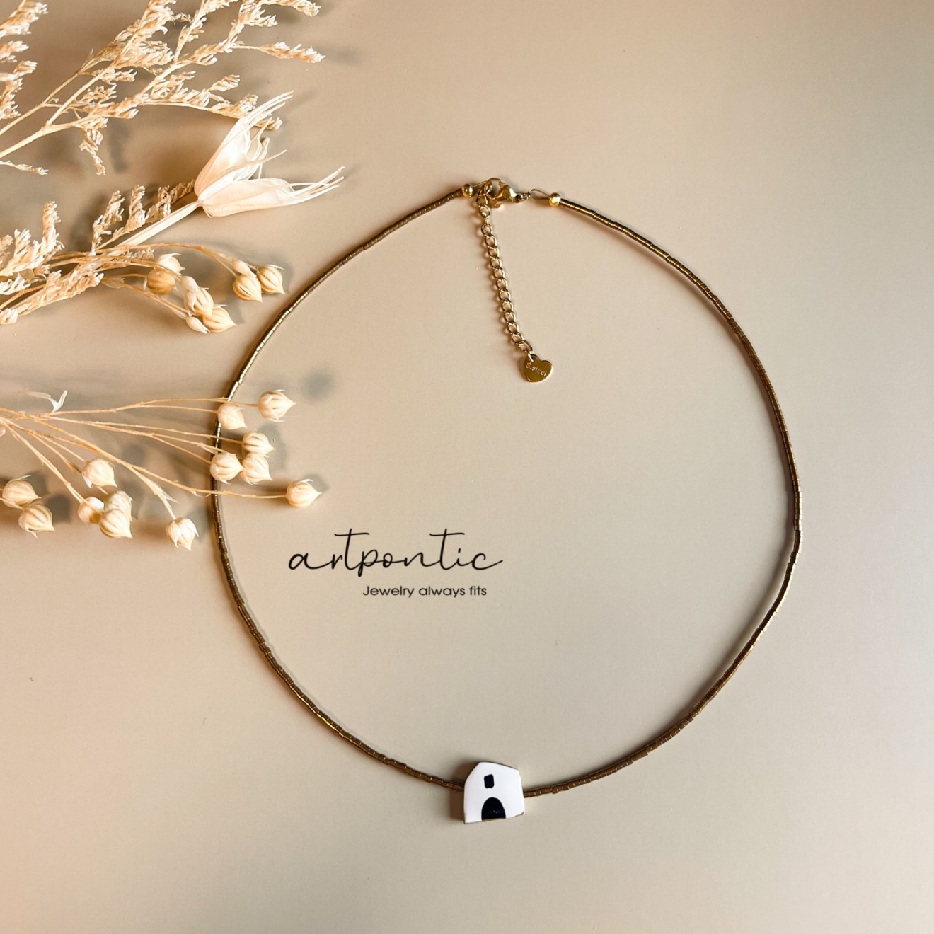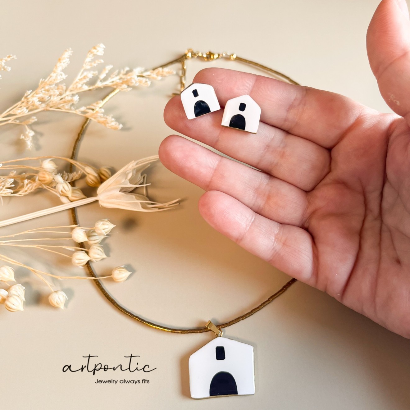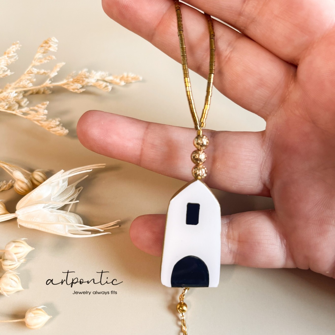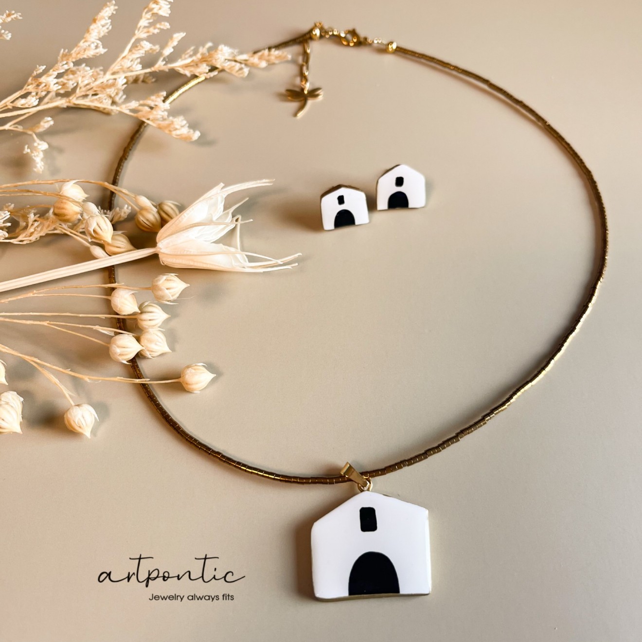 комплект обеци и колие “Къщури” изработени от глина, рисувани, обкантени със течно злато, стоманени елементи и стъклени мъниста. Може да ли взехте заедно или поотделно Колие с малки обеци - 55 Колие с големи обеци - 65 Малки обеци 25 Големи обеци 35 Колие 40