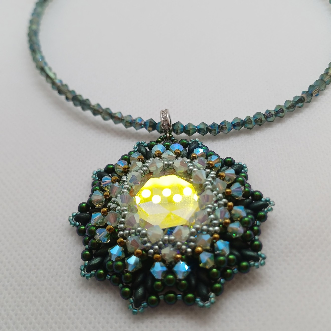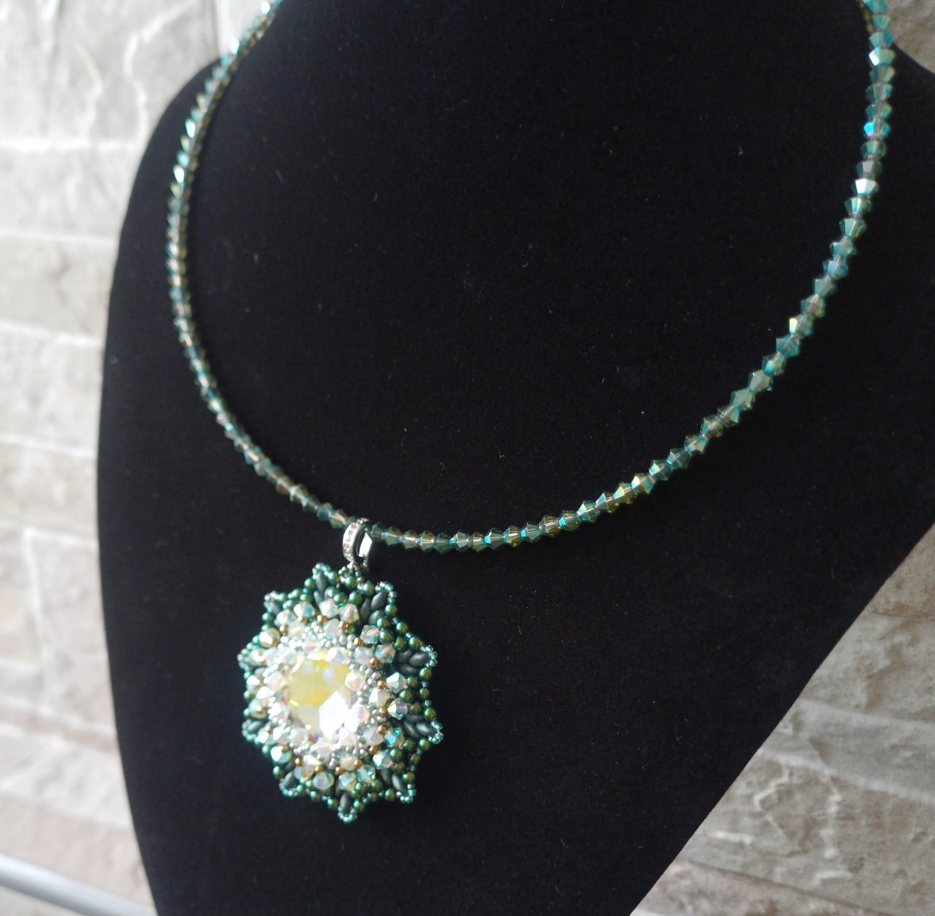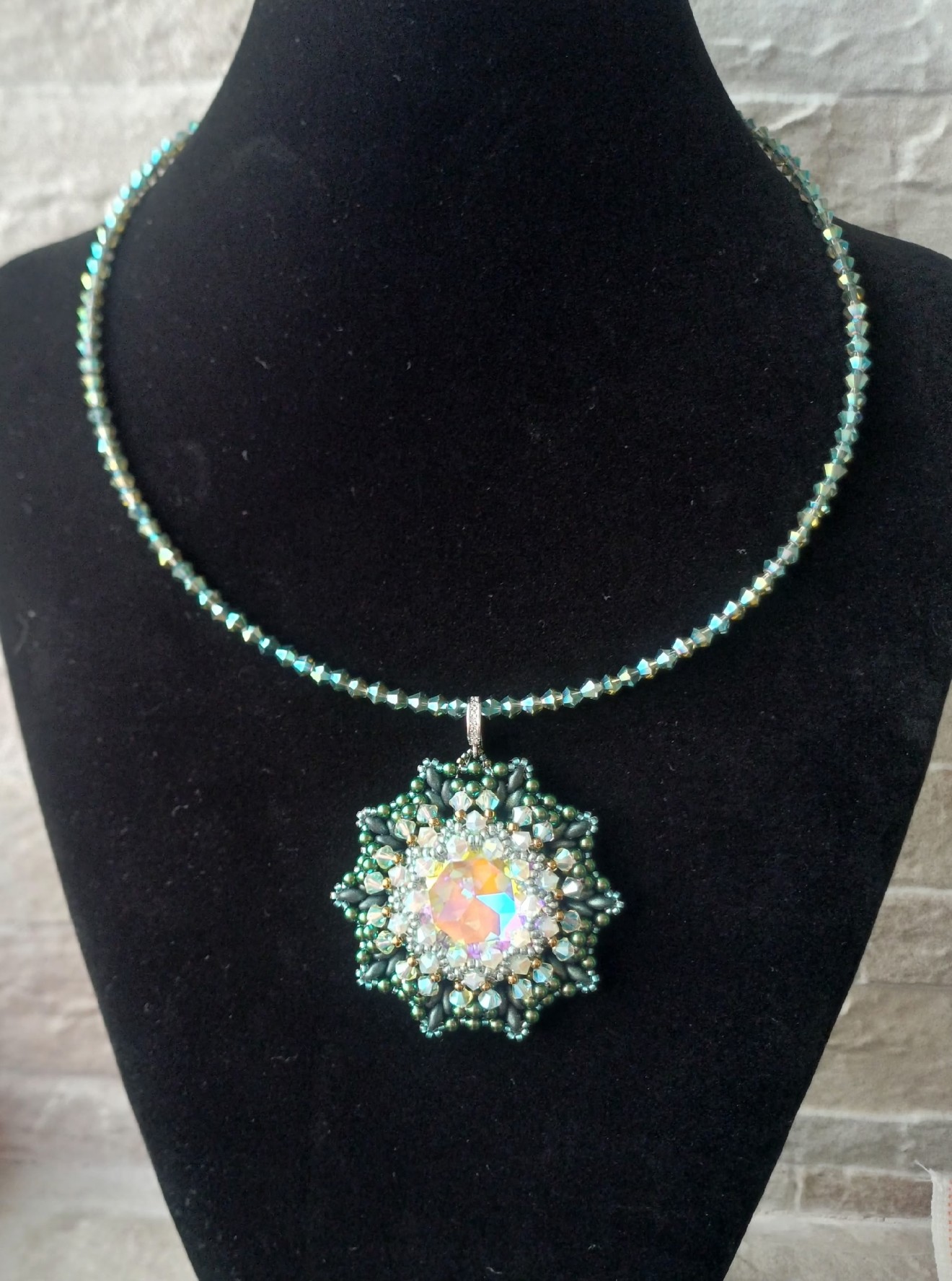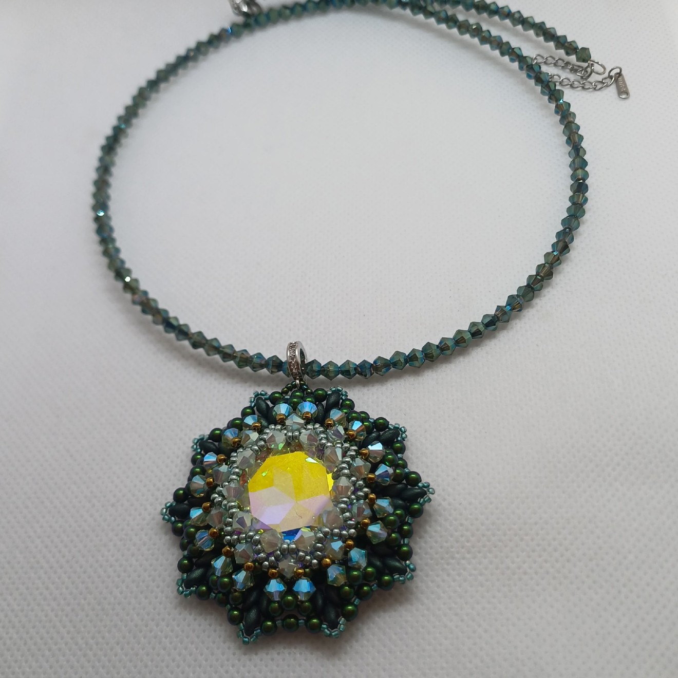 Гердана е изработен е от чешки кристали и перли, високо качествена японска мъниста и мемори тел. Висулката е с размер 5,5 см. Диаметър на гердана 49 см. с удължител 5 см.