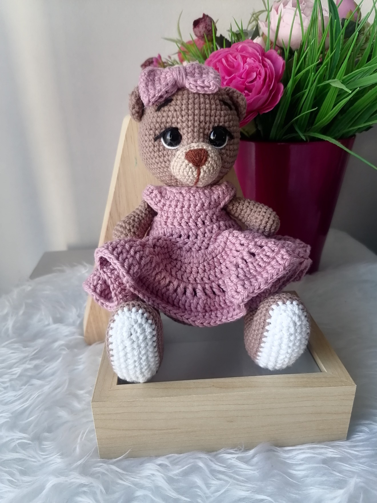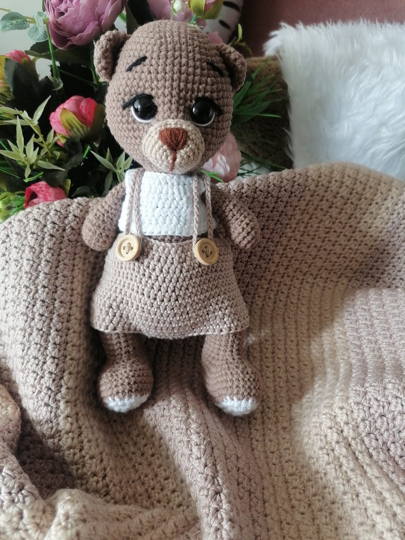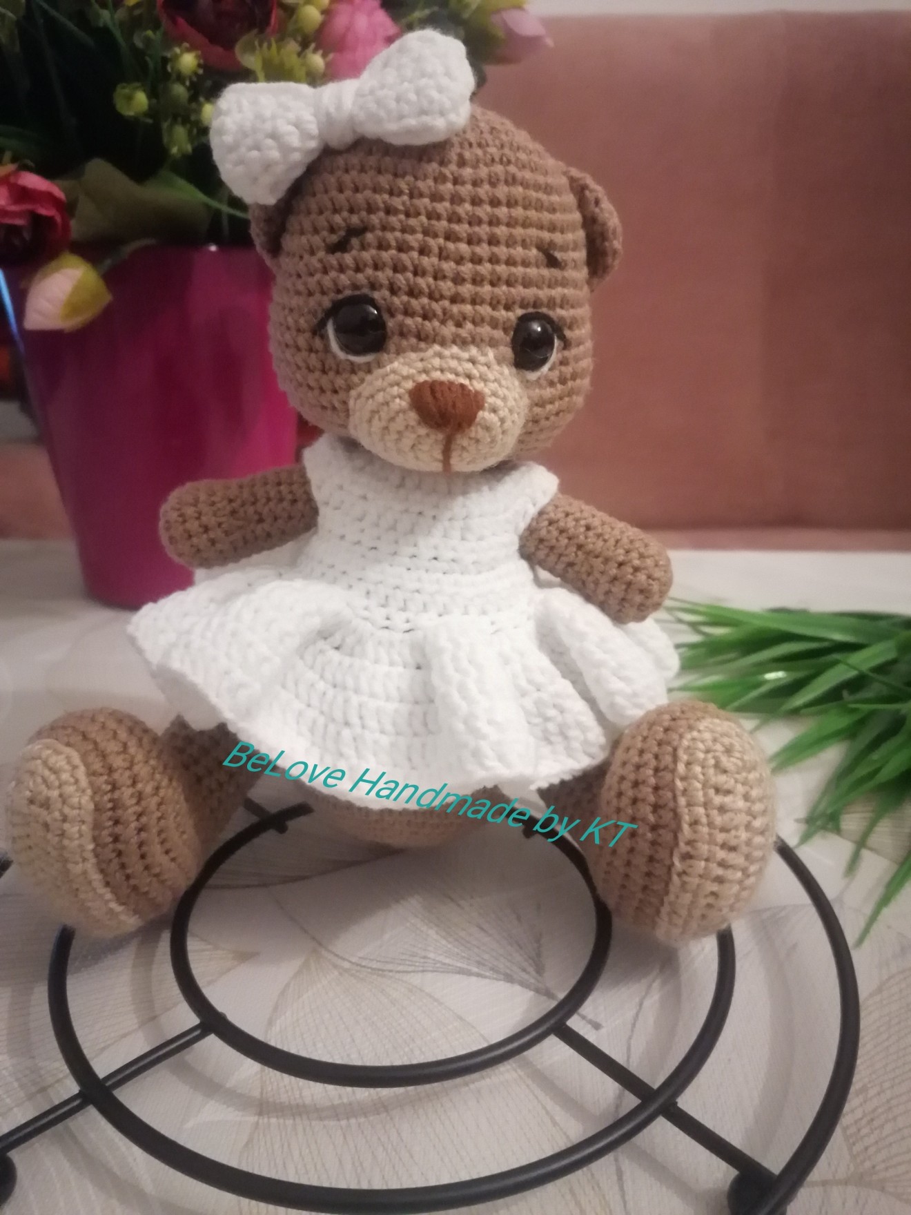 Прежда памук/акрил,безопасни очи на винт ,гранулиран силиконов пълнеж. Може да се изработи в цвят по избор и персонализация!