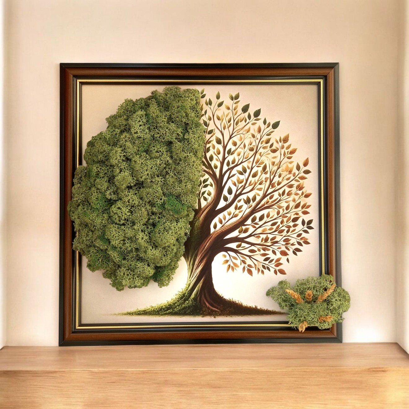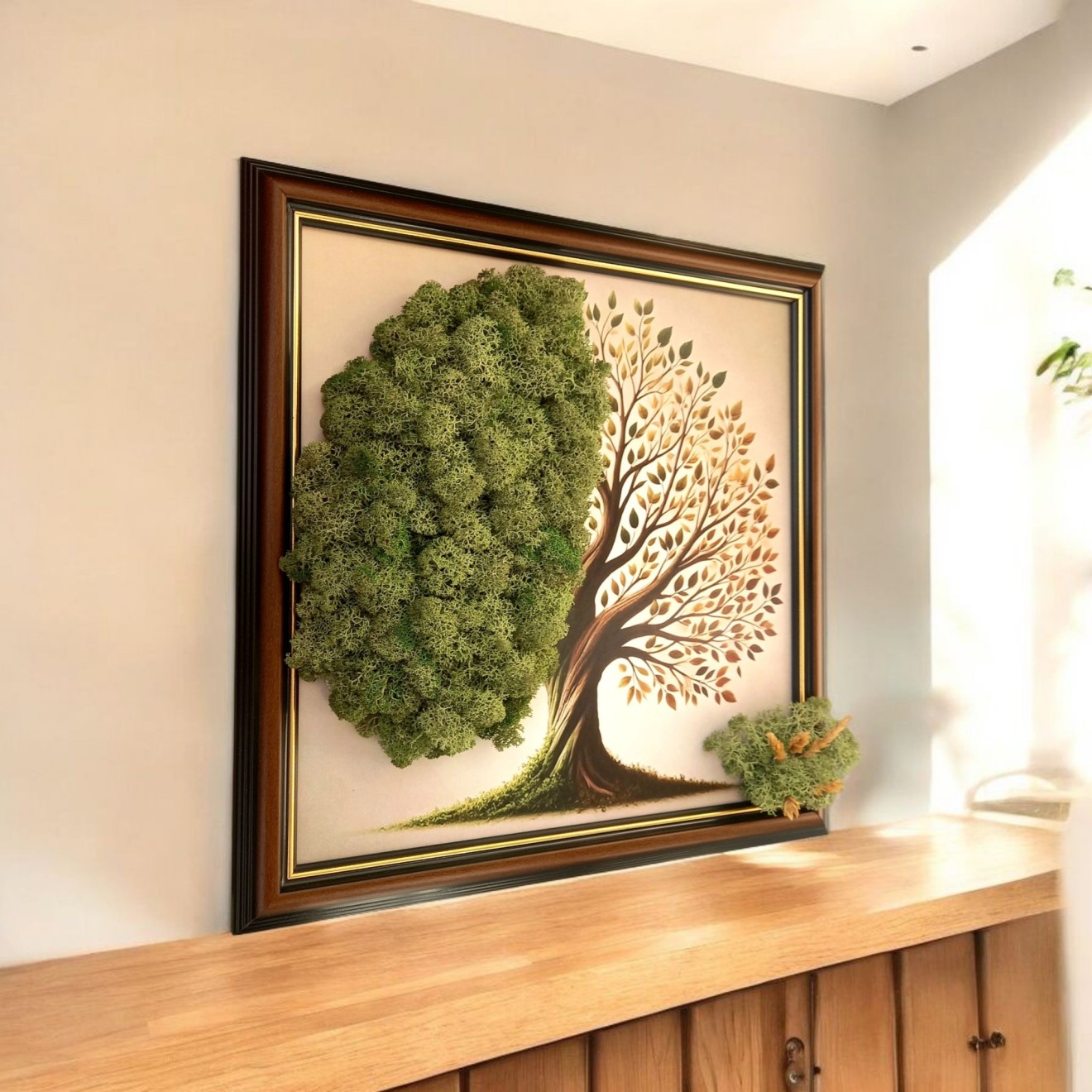"Дървото на хармонията“ 🕊️ – жива картина с мъх 🌿 Нежна комбинация от скандинавски мъх и сухи треви, съчетани с елегантен художествен принт, който вдъхва усещане за природа и хармония у дома 🍃✨ 💚 Изработва се по индивидуален размер 💚 Цветовете на мъха – по Ваш избор 💚 Подходяща за дом, офис или подарък с послание 🎁 Мъхът е естествен, стабилизиран, не изисква поливане или поддръжка, а запазва свежия си вид с години 🌿 🖼️ Уникално допълнение към всеки интериор — символ на баланс, растеж и ново начало 🌞