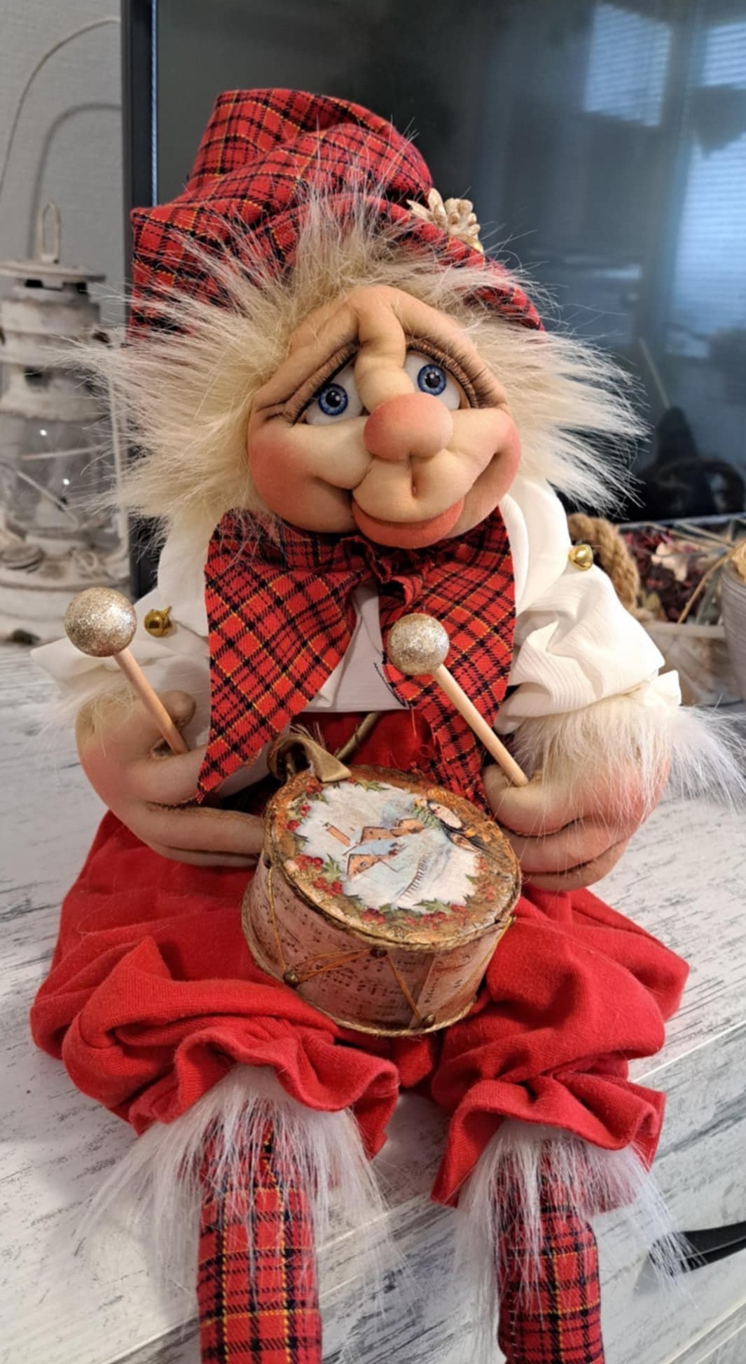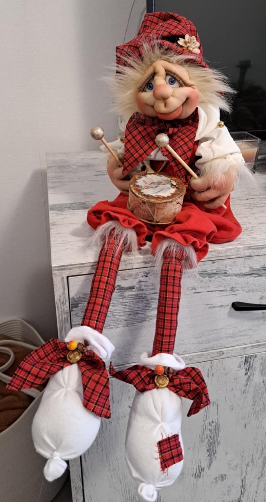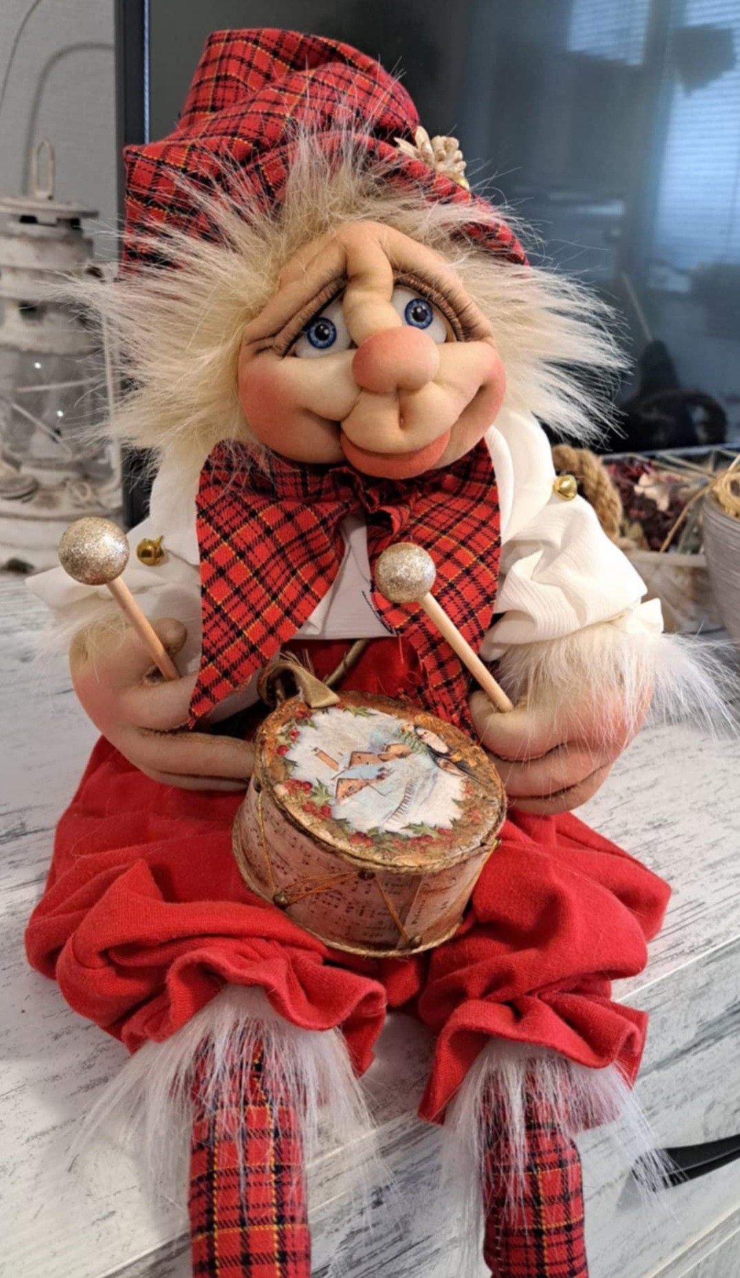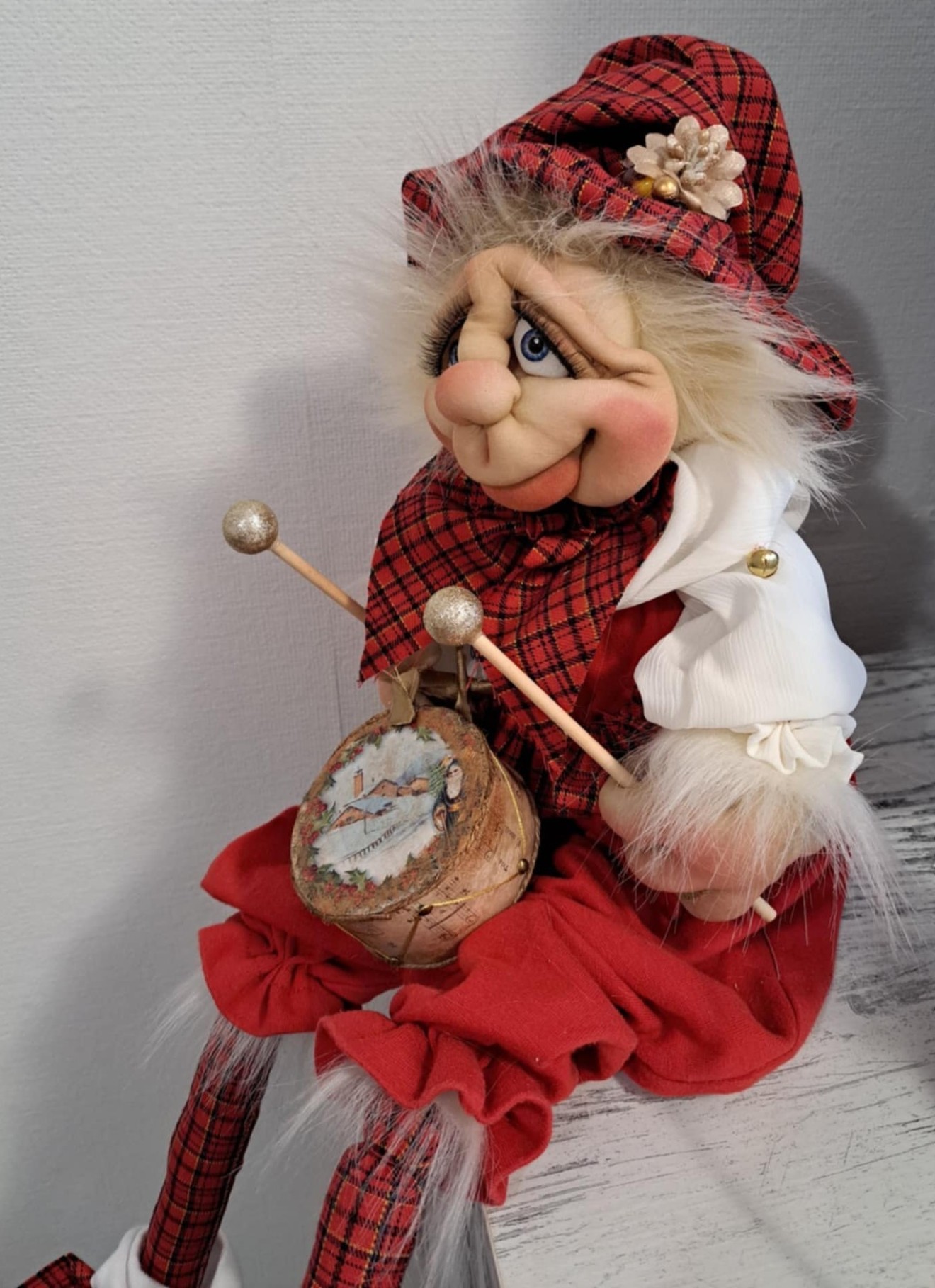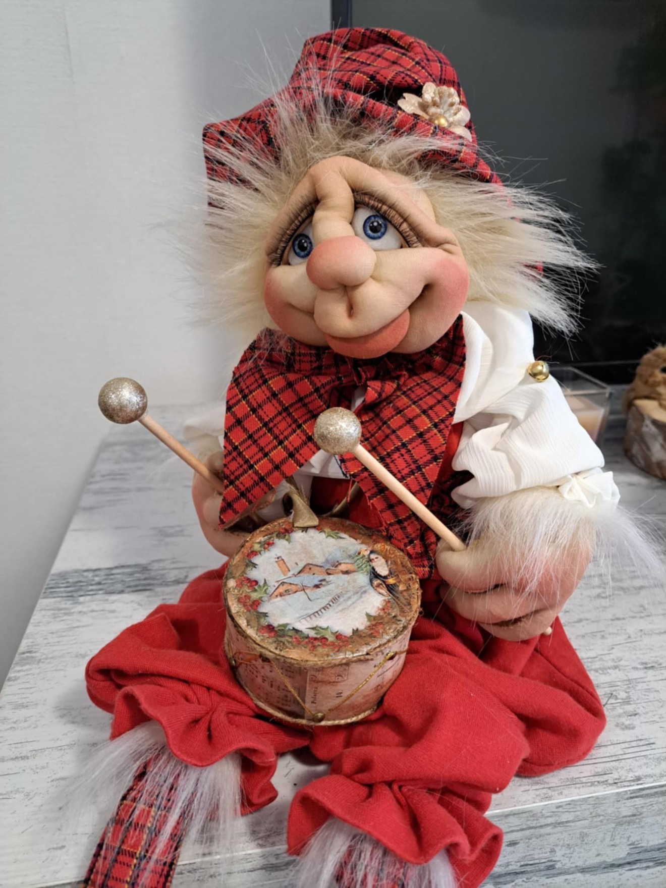 Ръчно изработено човече с барабанче. Човечето стои само в седнало положение. Материали: памучен плат, плюш, картон, силиконова вата