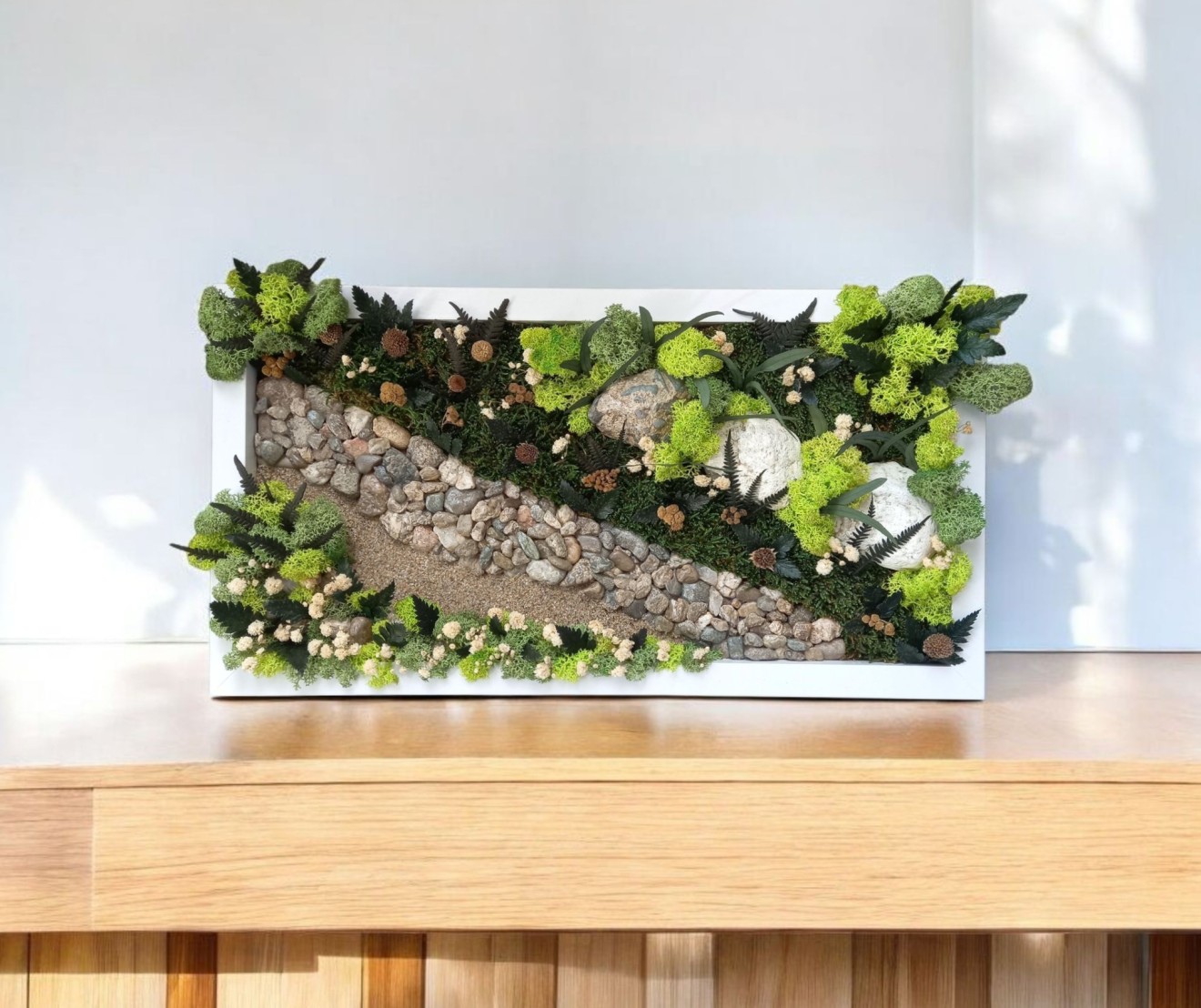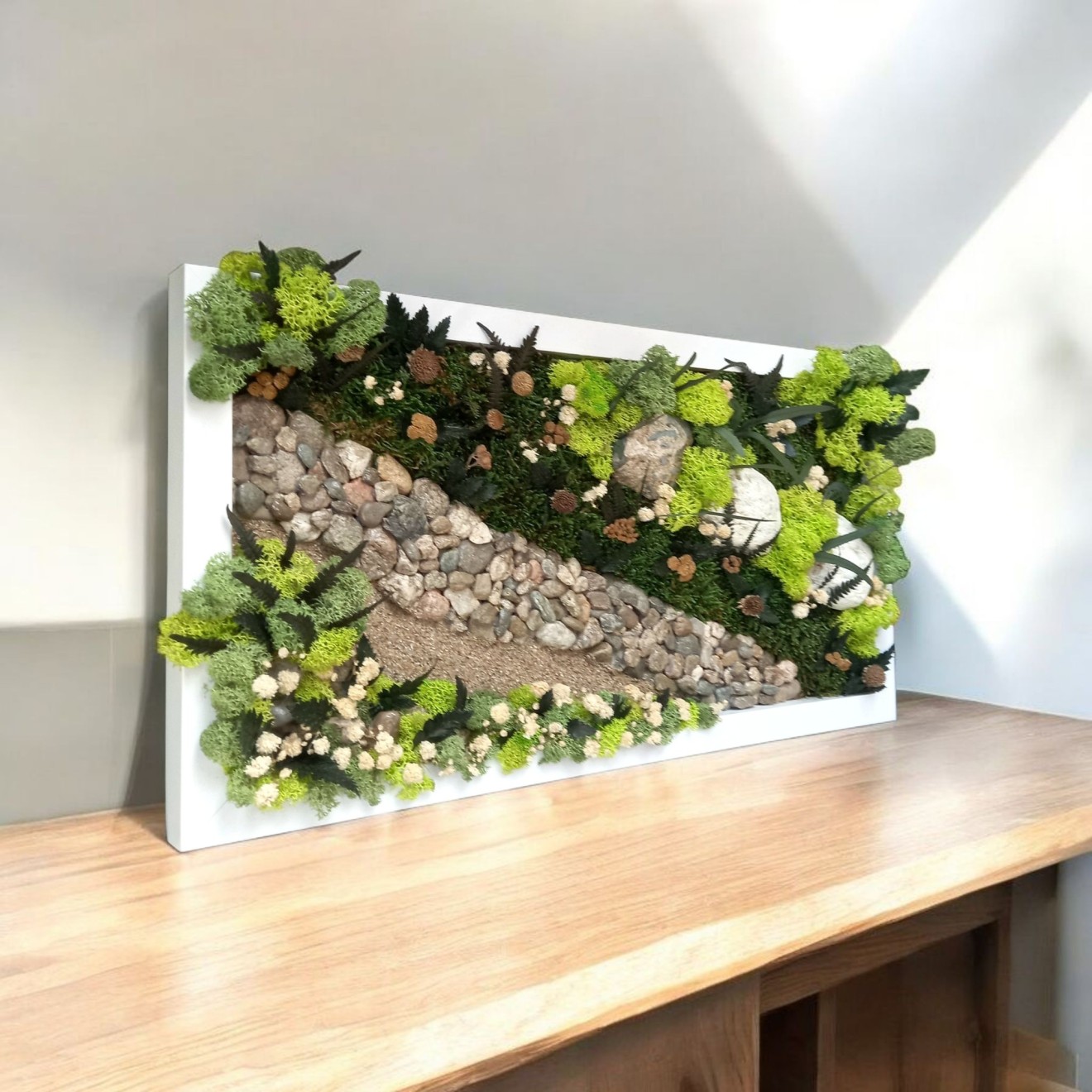 „Природен баланс“ 🍃 Уникална ръчно изработена картина, вдъхновена от хармонията на природата 🌿 Създадена със скандинавски и плосък мъх, стабилизирани растения, сухи цветя, камъчета и фин пясък. Топлите естествени елементи създават усещане за спокойствие, свежест и баланс в пространството 💚 🔸 Размер и цветове – по желание 🔸 Подходяща за дом, офис, хотел или като специален подарък 🎁 🌿 Всяка картина се изработва индивидуално – с внимание към детайла и природната естетика.