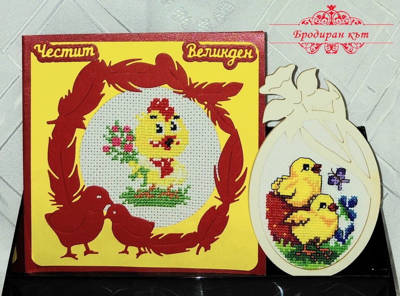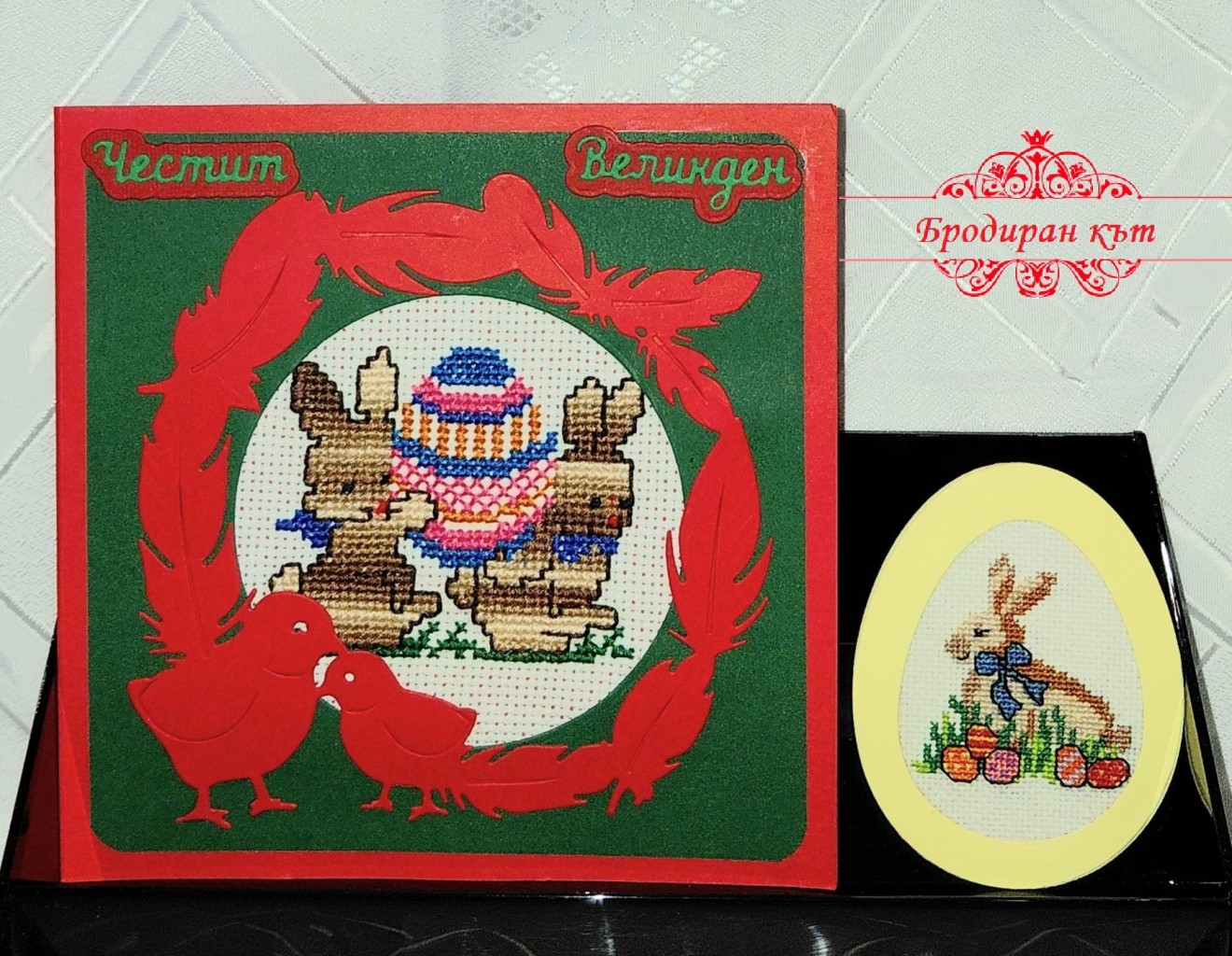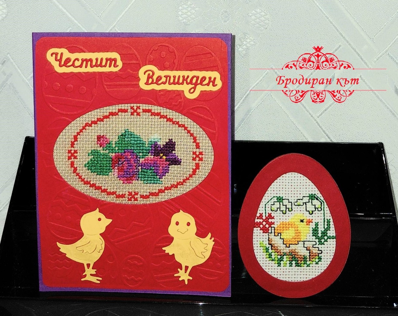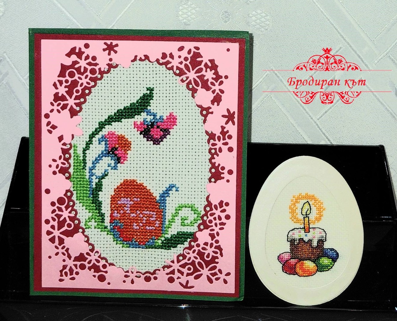 Комплекти ръчно бродирани картички, великденски яйца и магнити. Всяко яйце е с две лица - от едната страна е бродерия, от другата е апликация (на последната снимка).