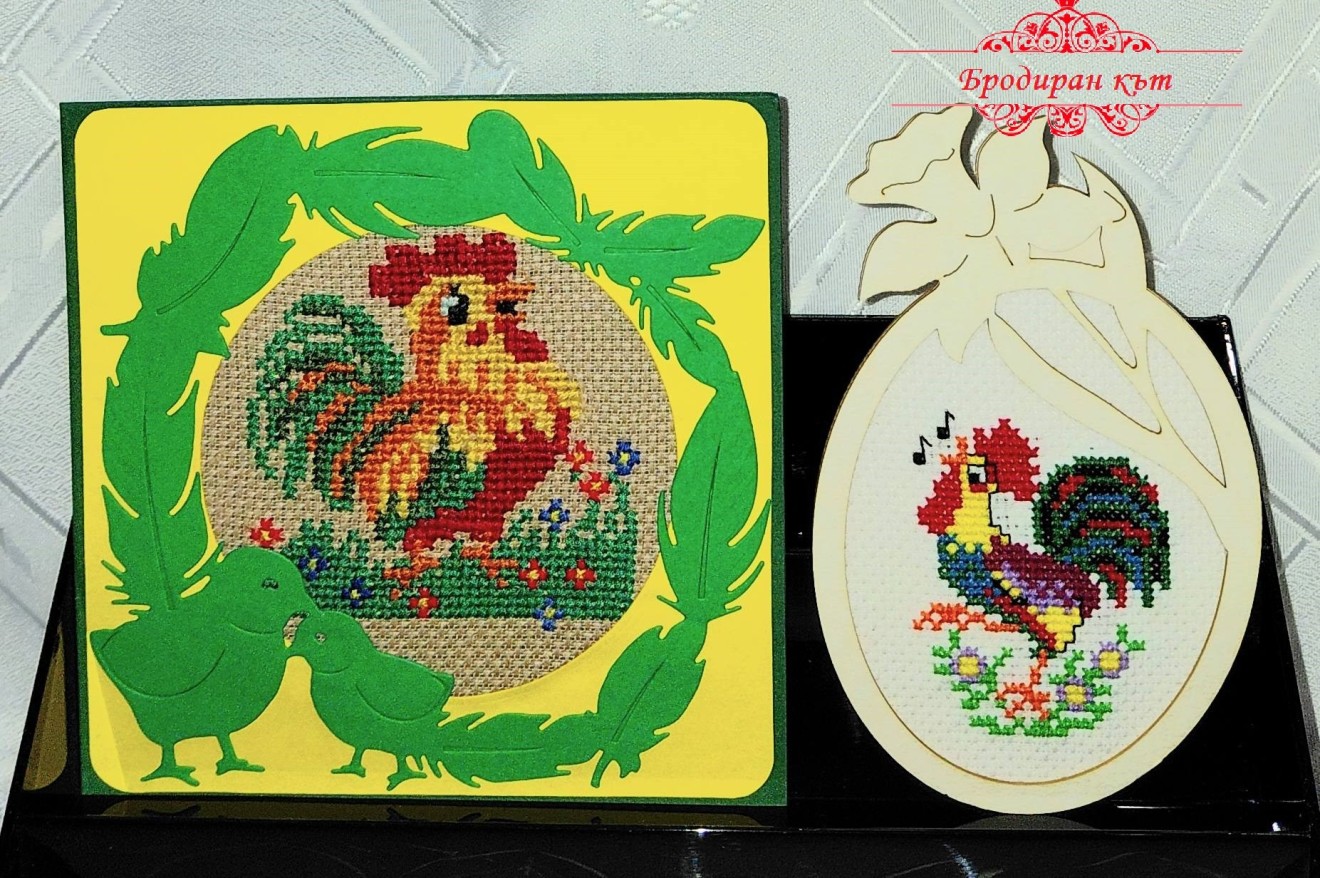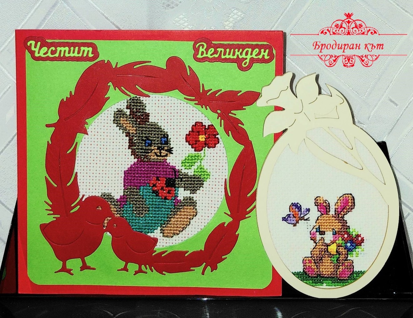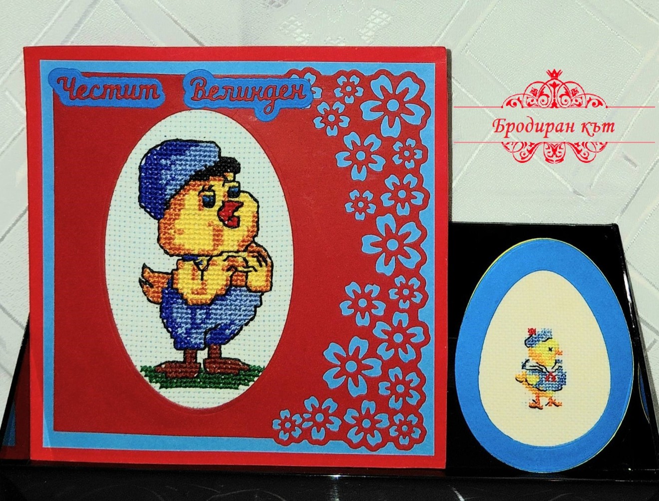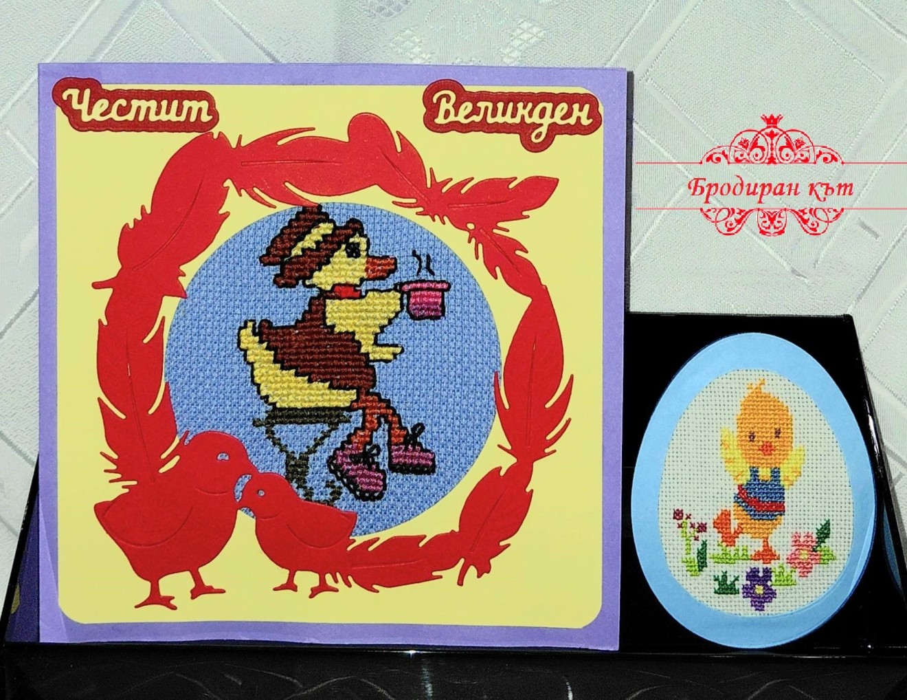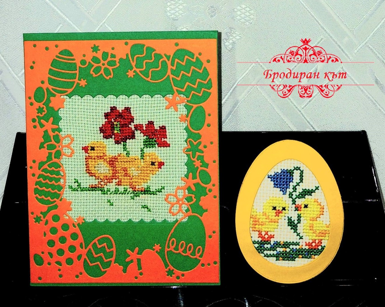 Комплекти ръчно бродирани картички, великденски яйца и магнити. Всяко яйце е с две лица - от едната страна е бродерия, от другата е апликация (на последната снимка).
