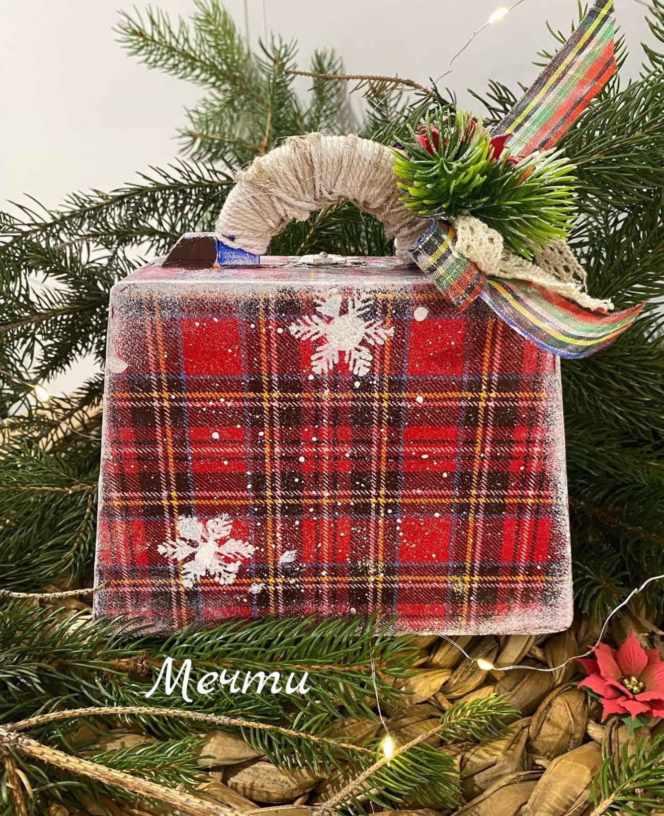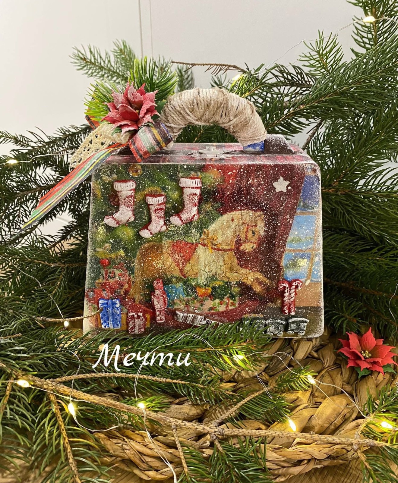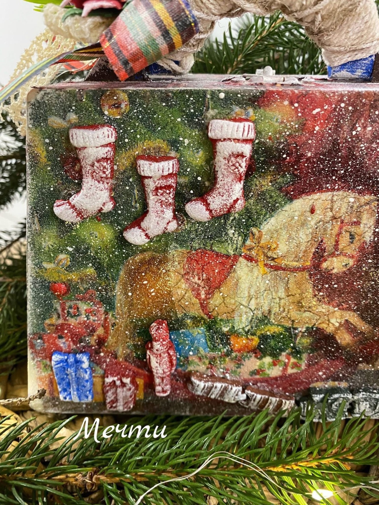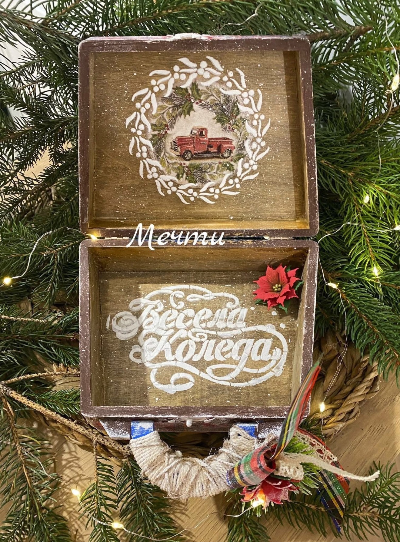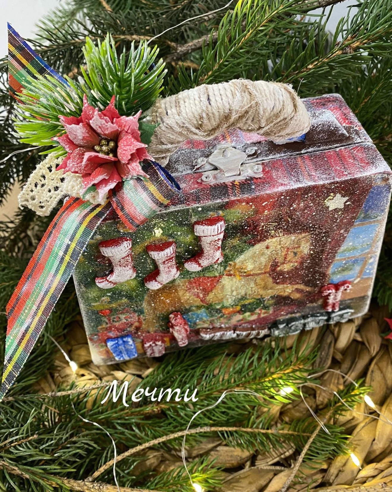 Дървена кутия, декорирана с декупаж, гипсови отливки, панделки, дантелка и т.н. Размери; горна част-14см. долна част-18см. височина-13,5см. дълбочина-6см. #коледенподарък #коледнаукраса #handmade #ръчнаизработка #Декорация #коледа #кутия