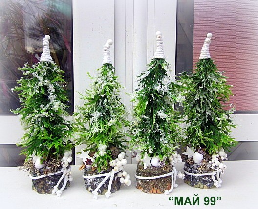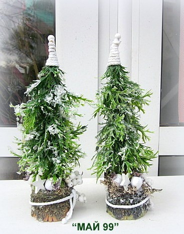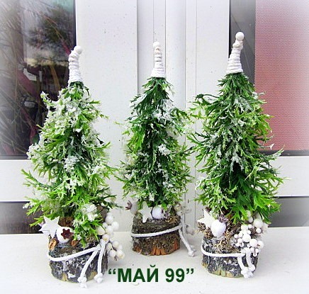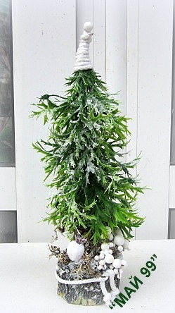 Ръчно изработена зелена,заскрежена елха на пънче/имитация дърво от еленови рога изкуствени клонки,натурален шнур и шапка от натурален бял шнур и бели плодчета,мини шишарки и бяла дървена коледна звезда с височина 30 см.