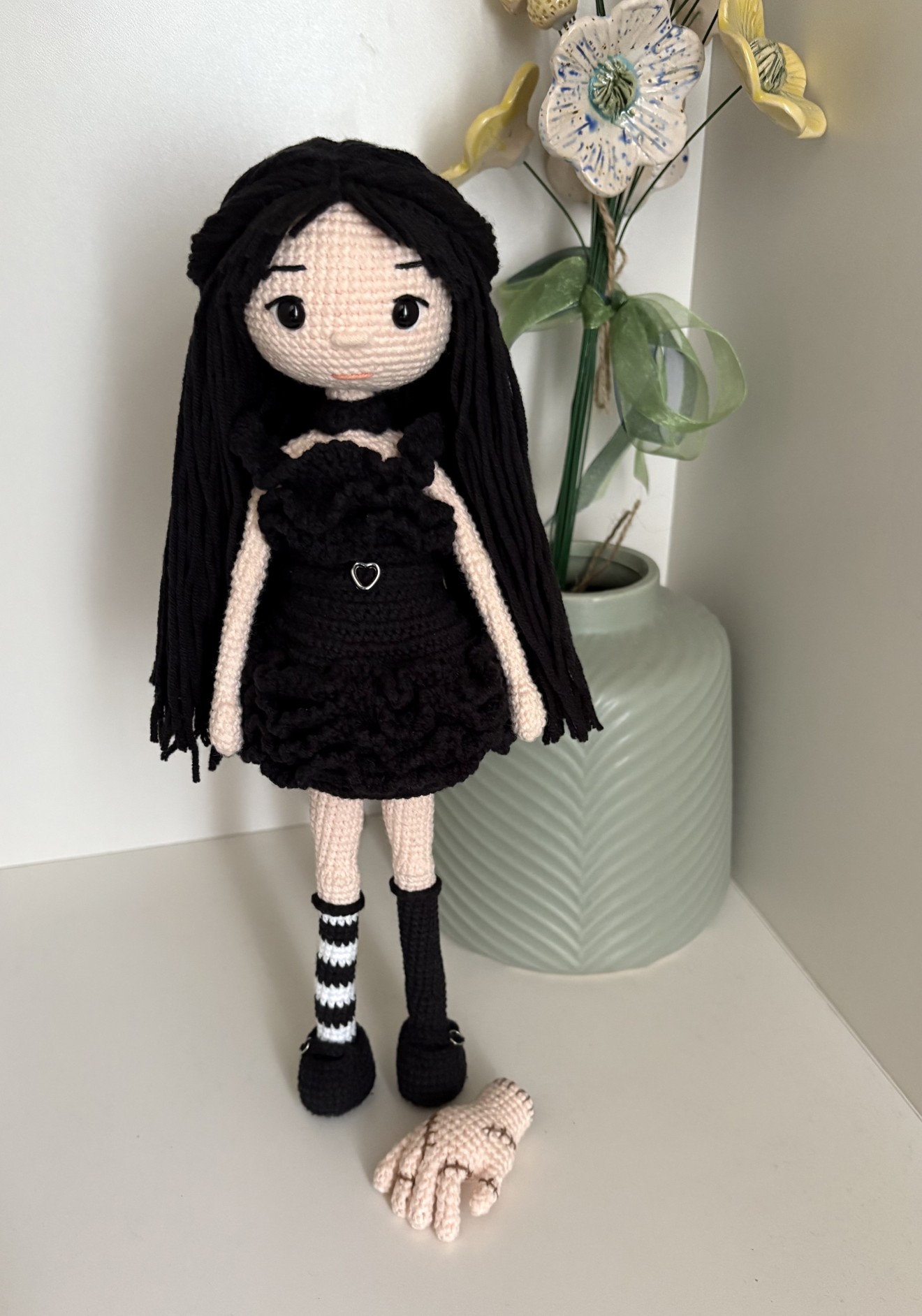 Уенздей Аддамс и Нещо 🖤🫰 🧶 Изплетена от прежда памук-акрил 👁️ С безопасни очички на винт 🧷 С телена конструкция, която позволява ръцете и краката и да се мърдат 👗 Роклята се сваля