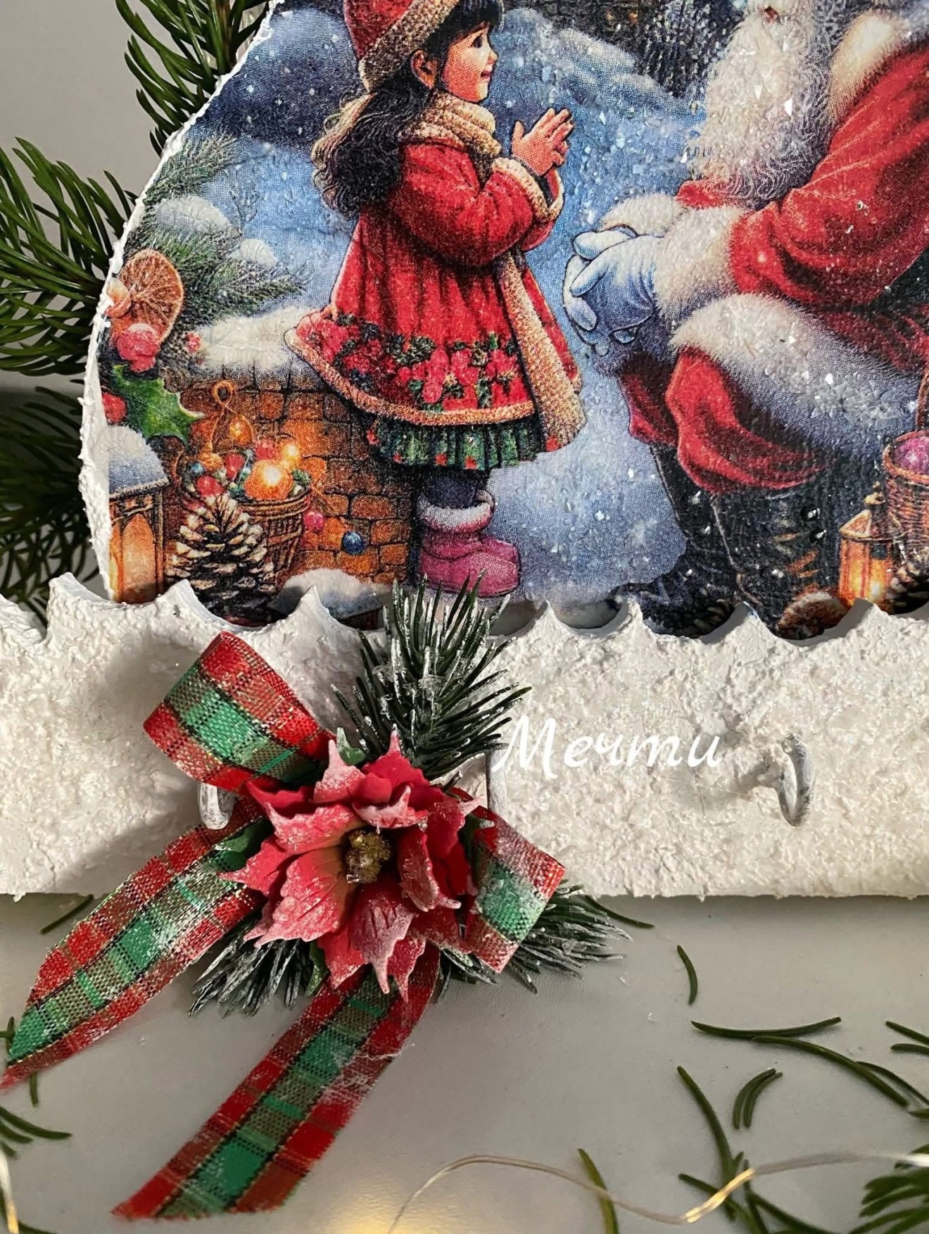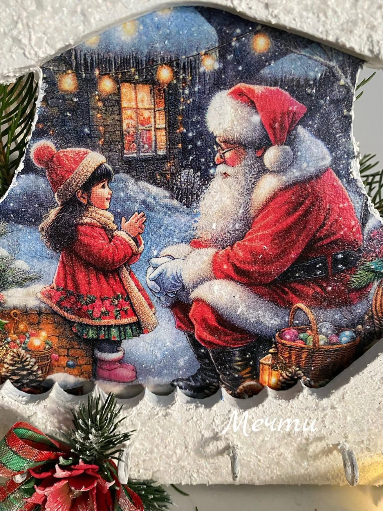 Заготовка от МДФ, декорирана с декупаж, изкуствен сняг, кристали, капки дъжд, панделка, ръчно изработена коледна звездичка. Размери; 26см./24см. С четири броя кукички. #коледенподарък #коледа #декорация #коледнаукраса #handmade #ръчнаизработка #къщичка #закачалка