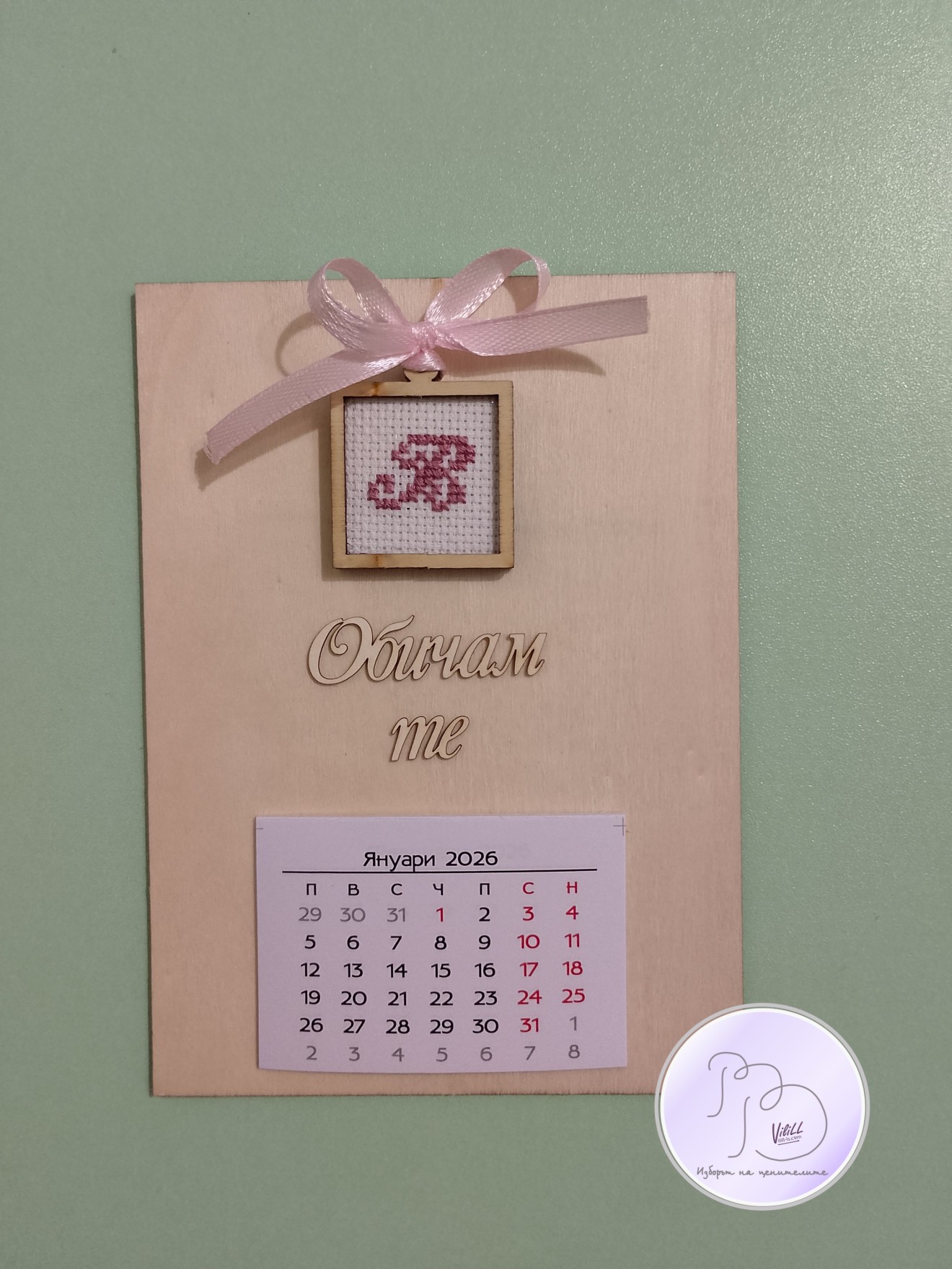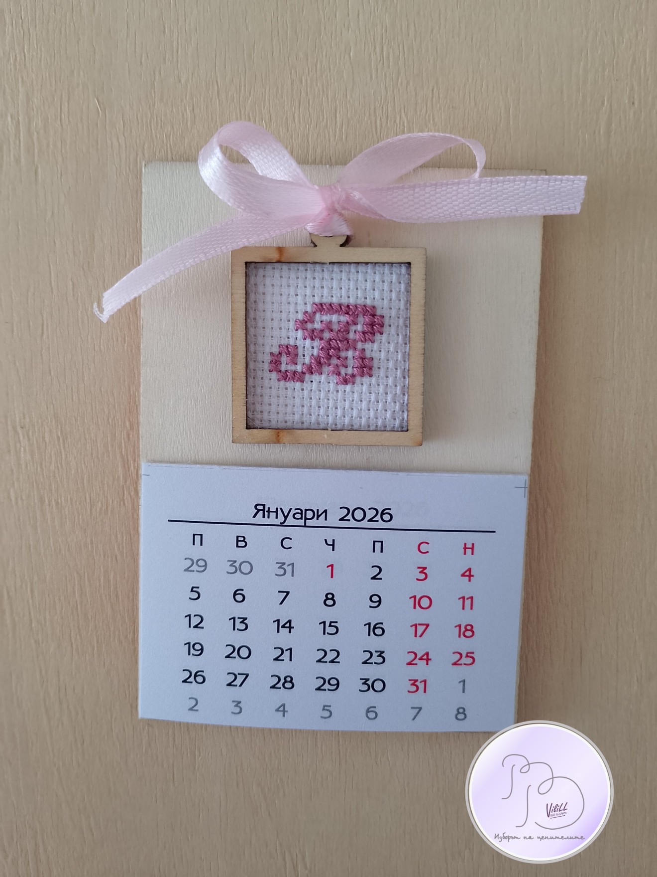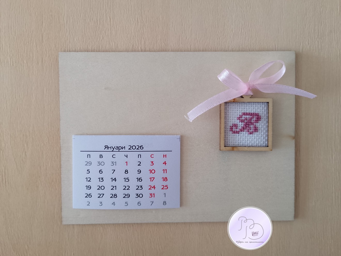 Практичен и символичен календар с лична буква, ръчна бродерия. Календарът се предлага в 2 варианта: 1.магнитче. 2.настолен с поставка. Хоризонтално и/или вертикално, с и без надпис, буква и цвят- според Вашето желание. Приблизителни размери: -календар15х11см. -7х10 см. Материал: 1.календар-основа от дърво -декоративен елемент. -12 листчета с месеците. -панама/плат. -конци и бродерия. 📌Цена: -размер:15.11 см: 15.00лв/7.67 евро/1 календар. -размер:7х10 см: 12.00лв./6.14 евро/1 календар. Доставка до офис на Еконт за сметка на получател. 10% от цената дарявам за развитието на платформата! При интерес- на Ваше разположение съм да обсъдим подробностите. Facebook-РъкоВелиеViliLL