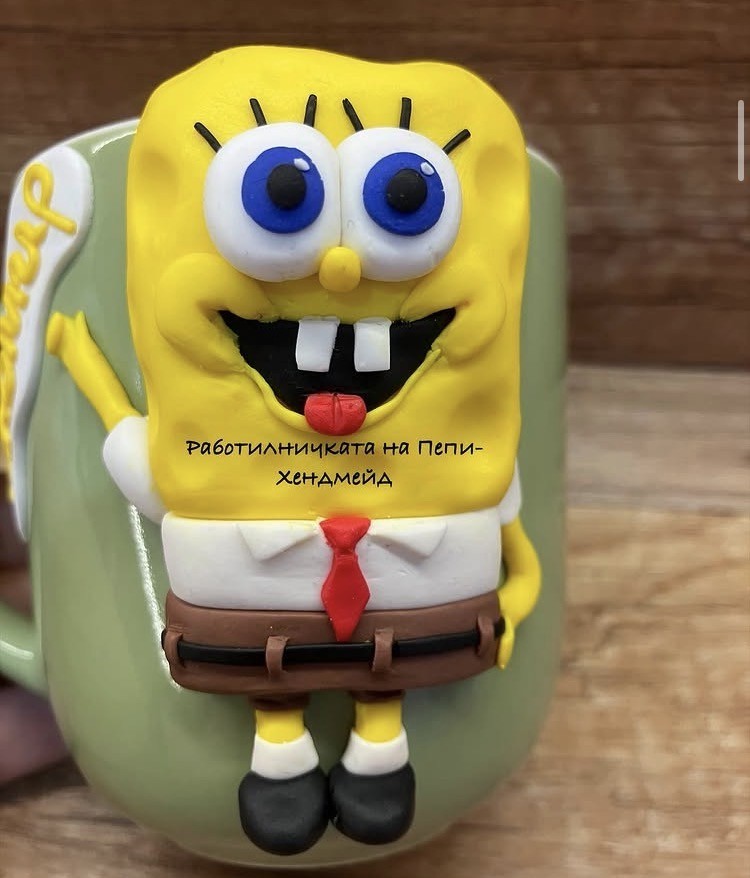 керамична чаша с декорация от полимерна глина Спондж Боб.