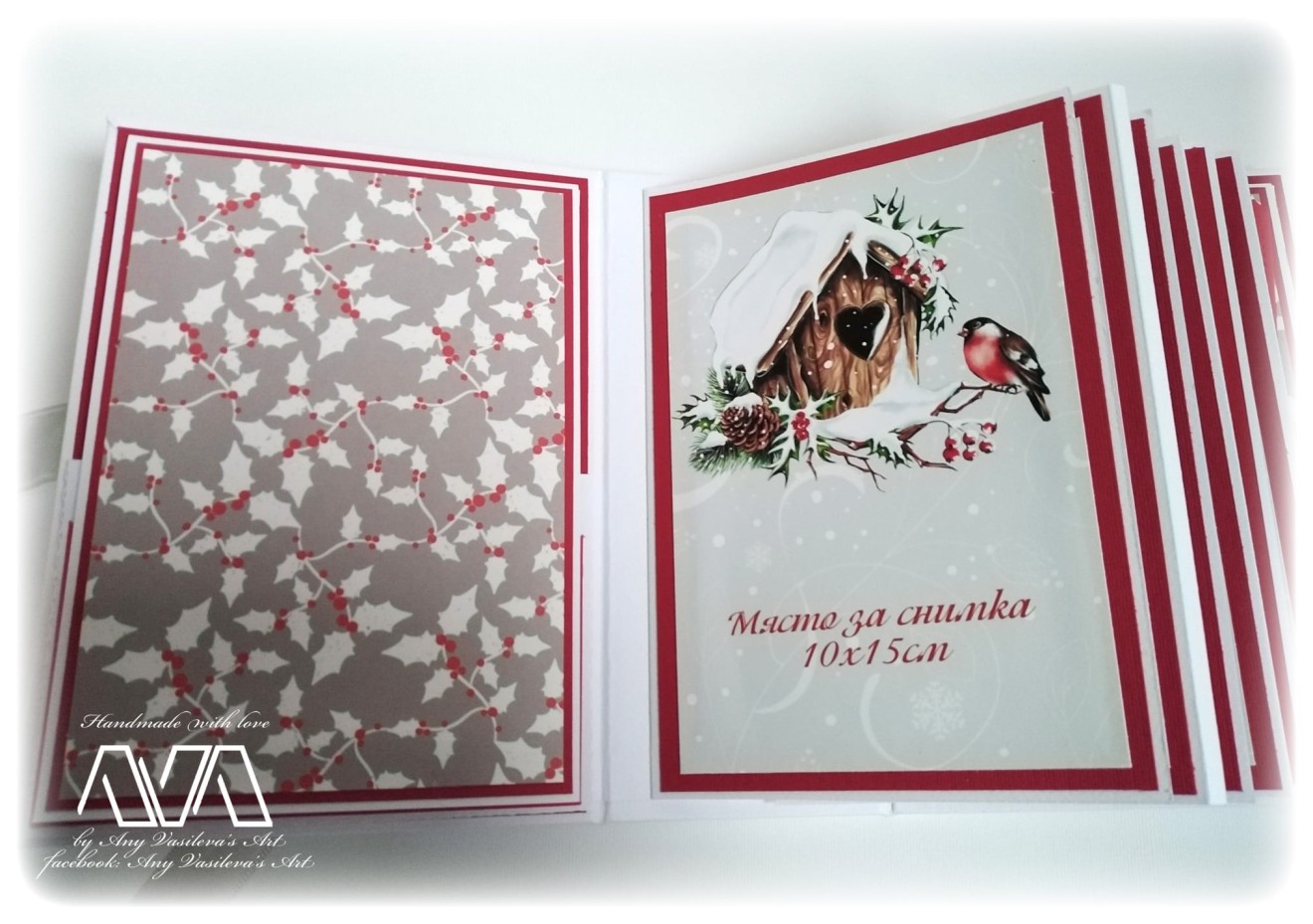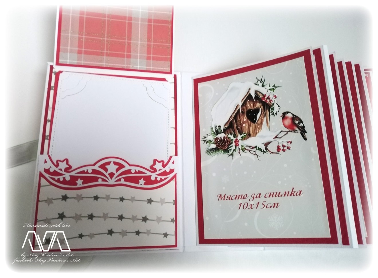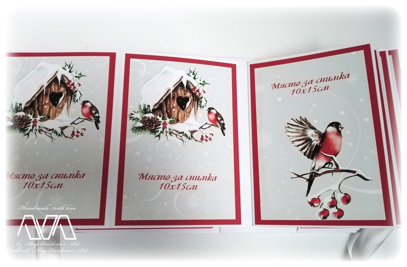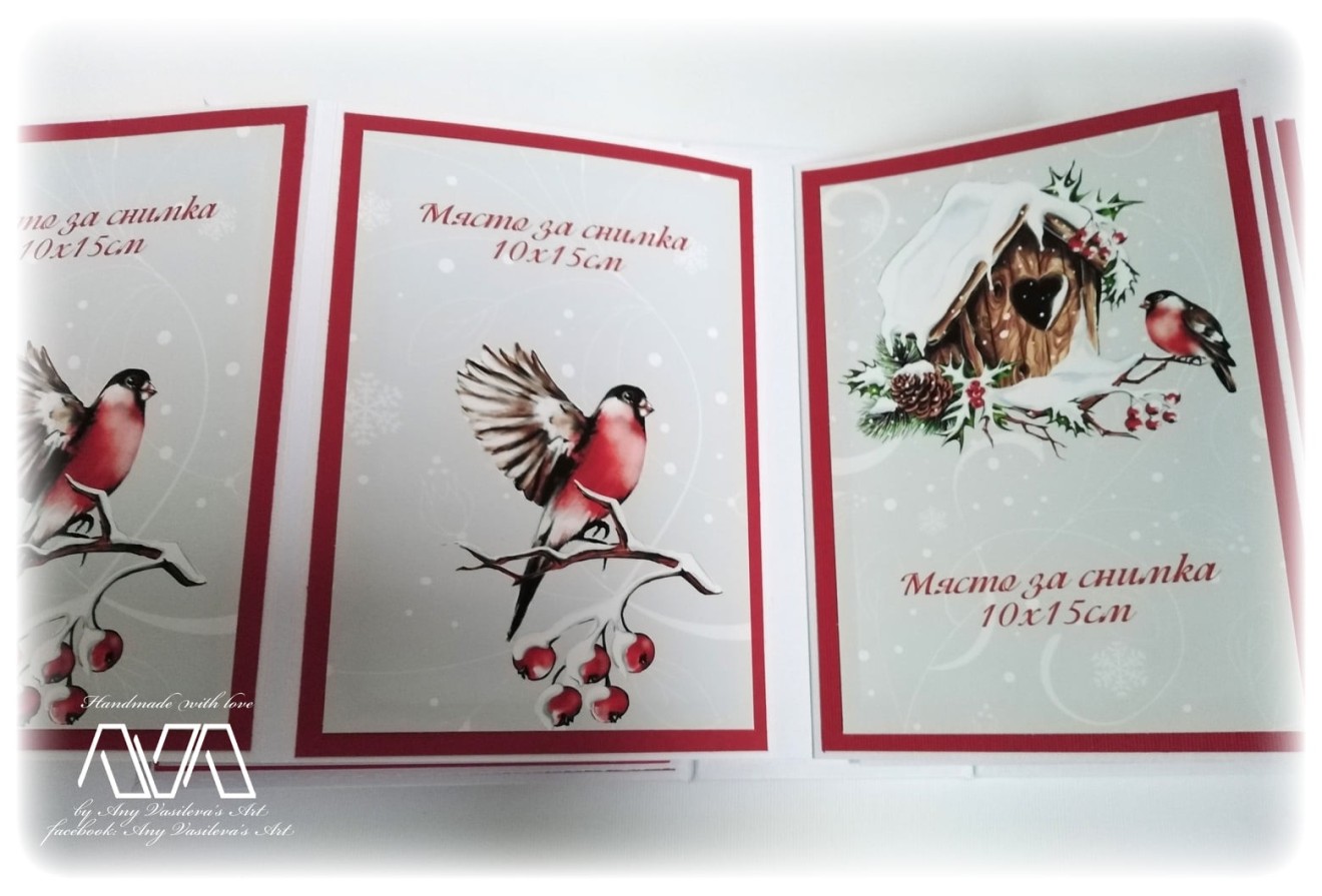 Коледен албум за снимки с размери 13х18х7 см. В стандартна цветова комбинация - червено, сиво и тъмно синьо. Събира 26-30 броя снимки с размери 10х15см. Прекрасно място, където да съберете снимките от коледната си фотосесия. Идеален подарък за коледните празници за всеки - мъж, жена, дете, близък, роднина, колега, приятел.