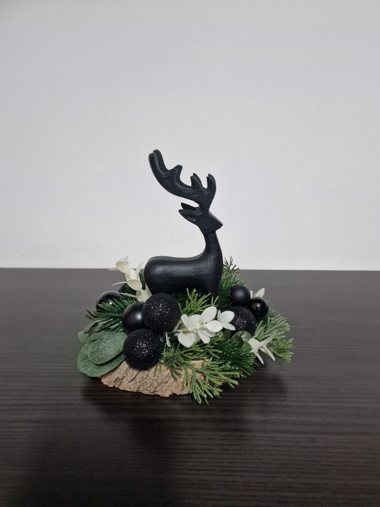 Еленчето е от метална сплав. Боровите клонки са изкуствени. Основата е от дърво.