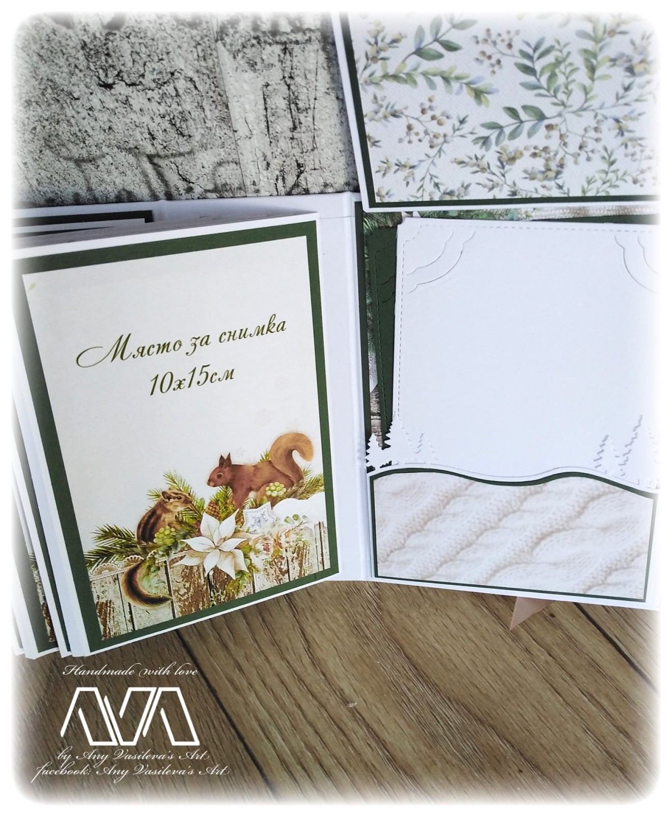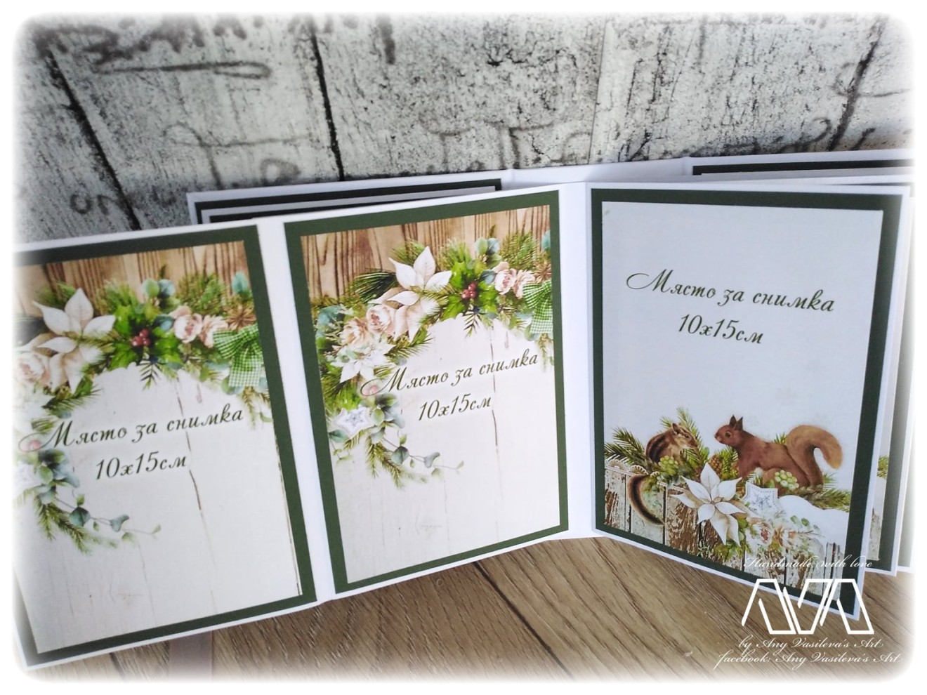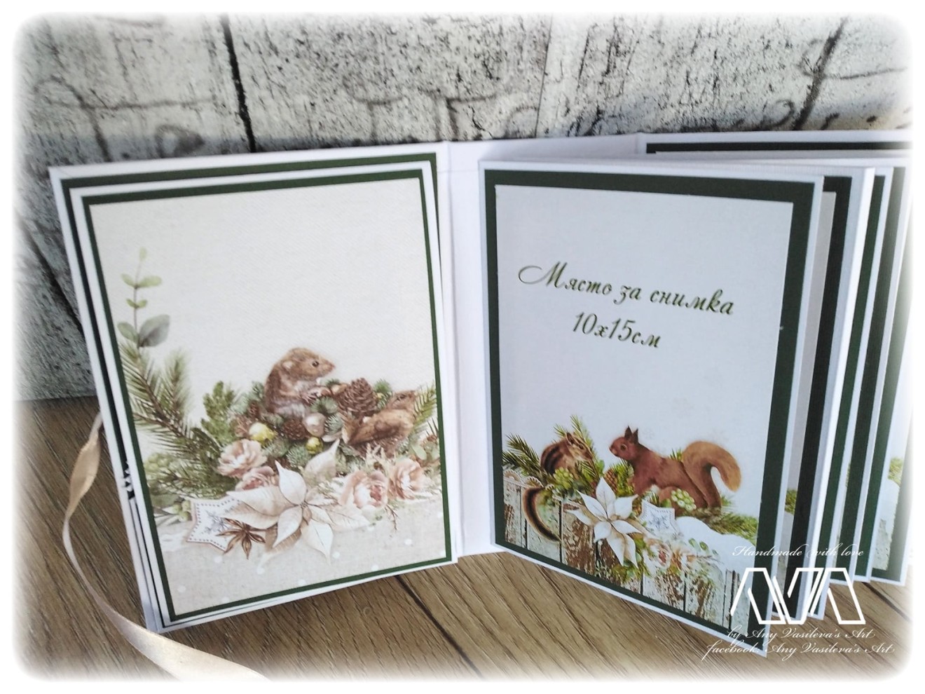 Коледен албум за снимки с размери 13х18х7 см. В традиционна и топла цветова комбинация - тъмно зелено, бежово и дървесни десени. Събира 26-30 броя снимки с размери 10х15см. Прекрасно място, където да съберете снимките от коледната си фотосесия. Идеален подарък за коледните празници за всеки - мъж, жена, дете, близък, роднина, колега, приятел.