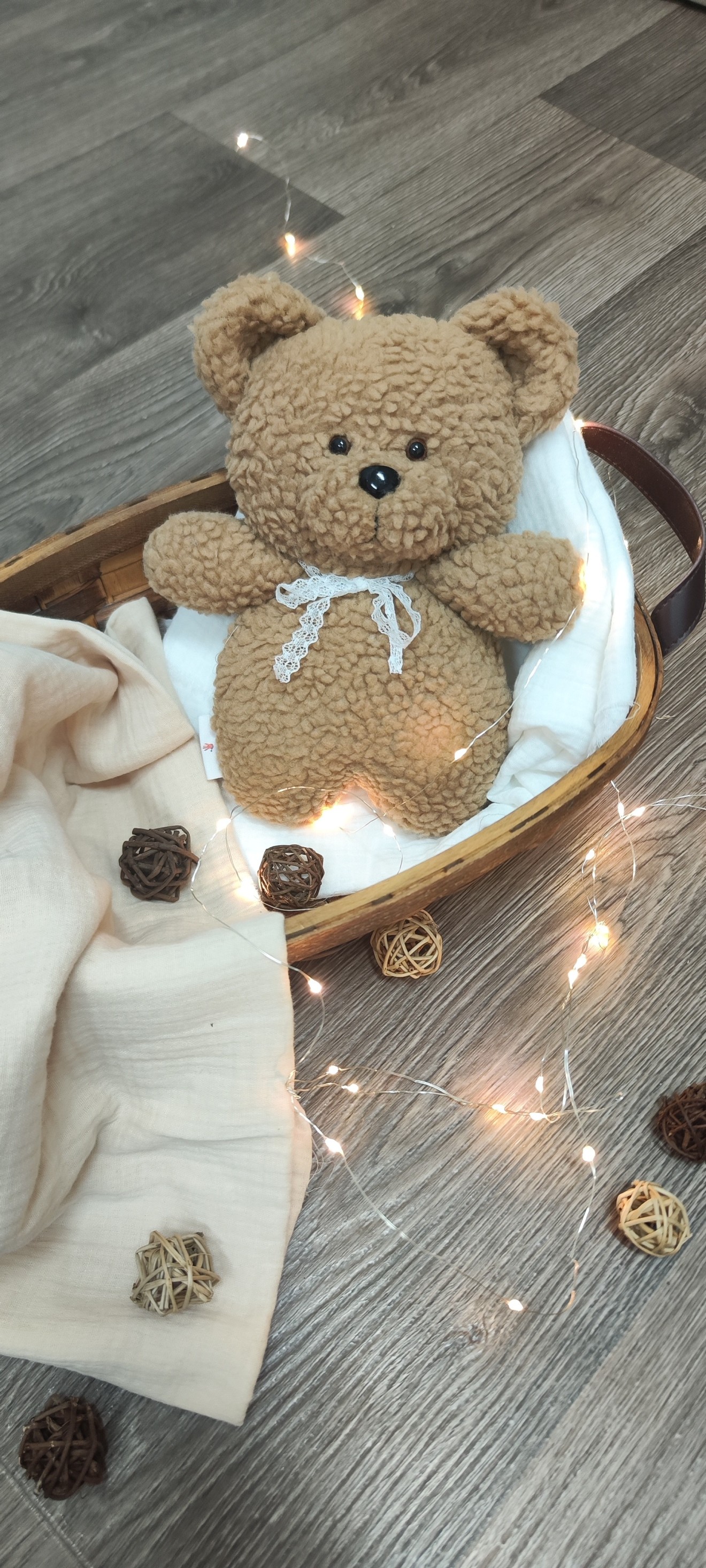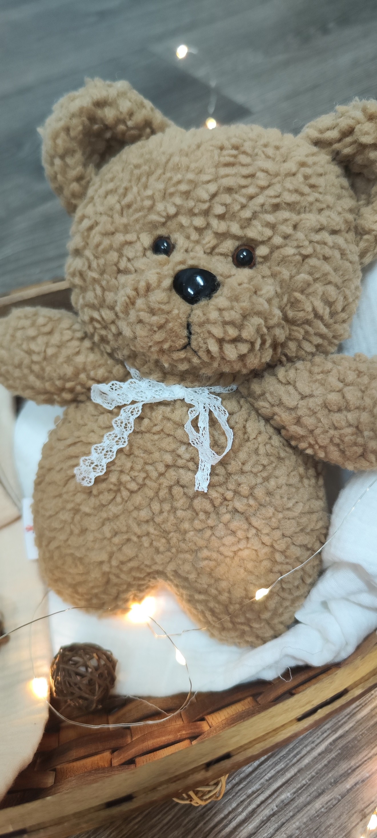Меко мече за гушкане, което обича да се разхожда, да слуша приказки и е пръв съюзник във всички бели. С големина 23см. Подходящо за подарък за новородено, изписване от родилното, погача на бебе или без повод.