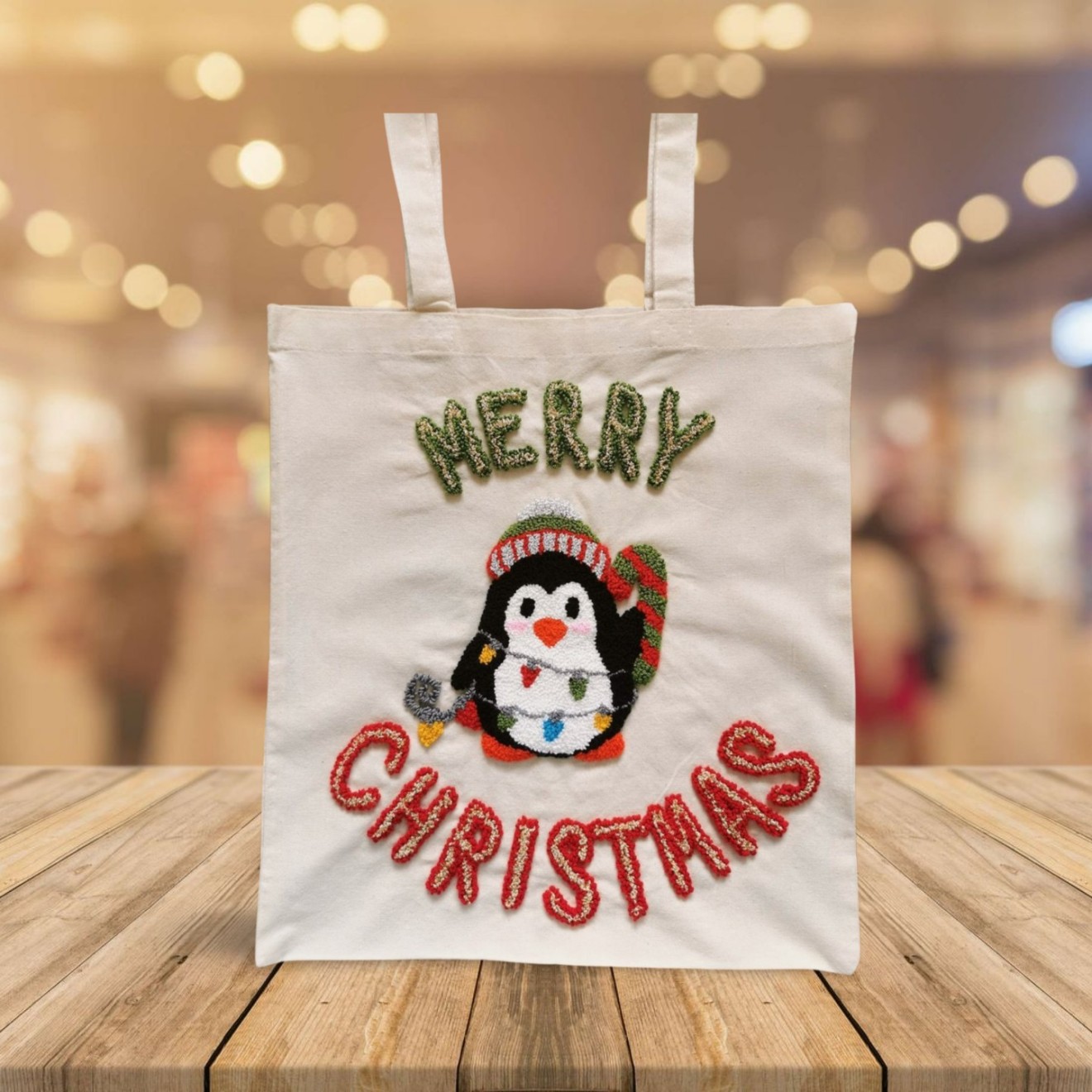 Коледна торба от чист памук, бродирана с пънч нийдъл игла. Пежда от акрил, памук, ламе.