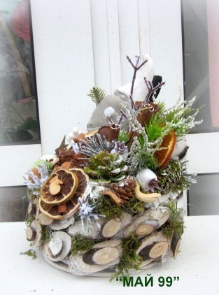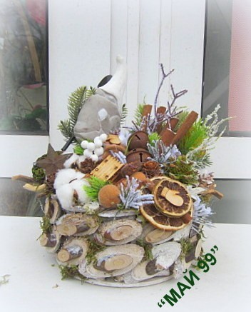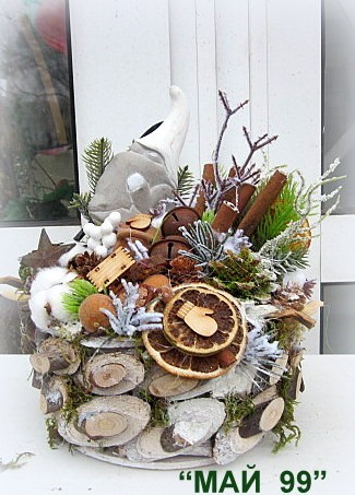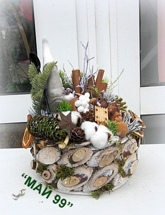 Коледна украса в кръгъл дървен съд ф 20 см. с циментово джудже,канела,памук и естествени материали,изкуствени зелени клонки и шишарки с мъх.