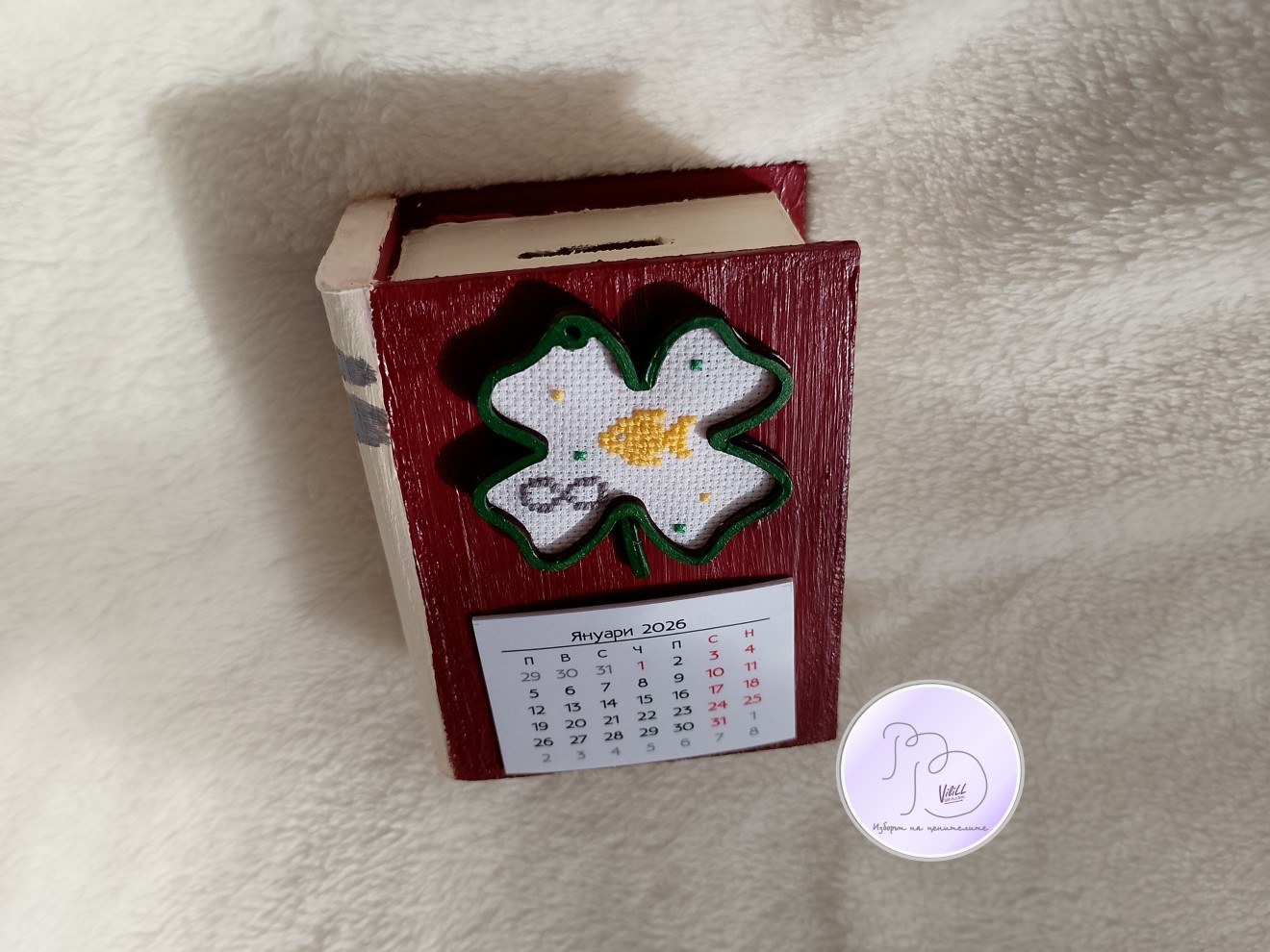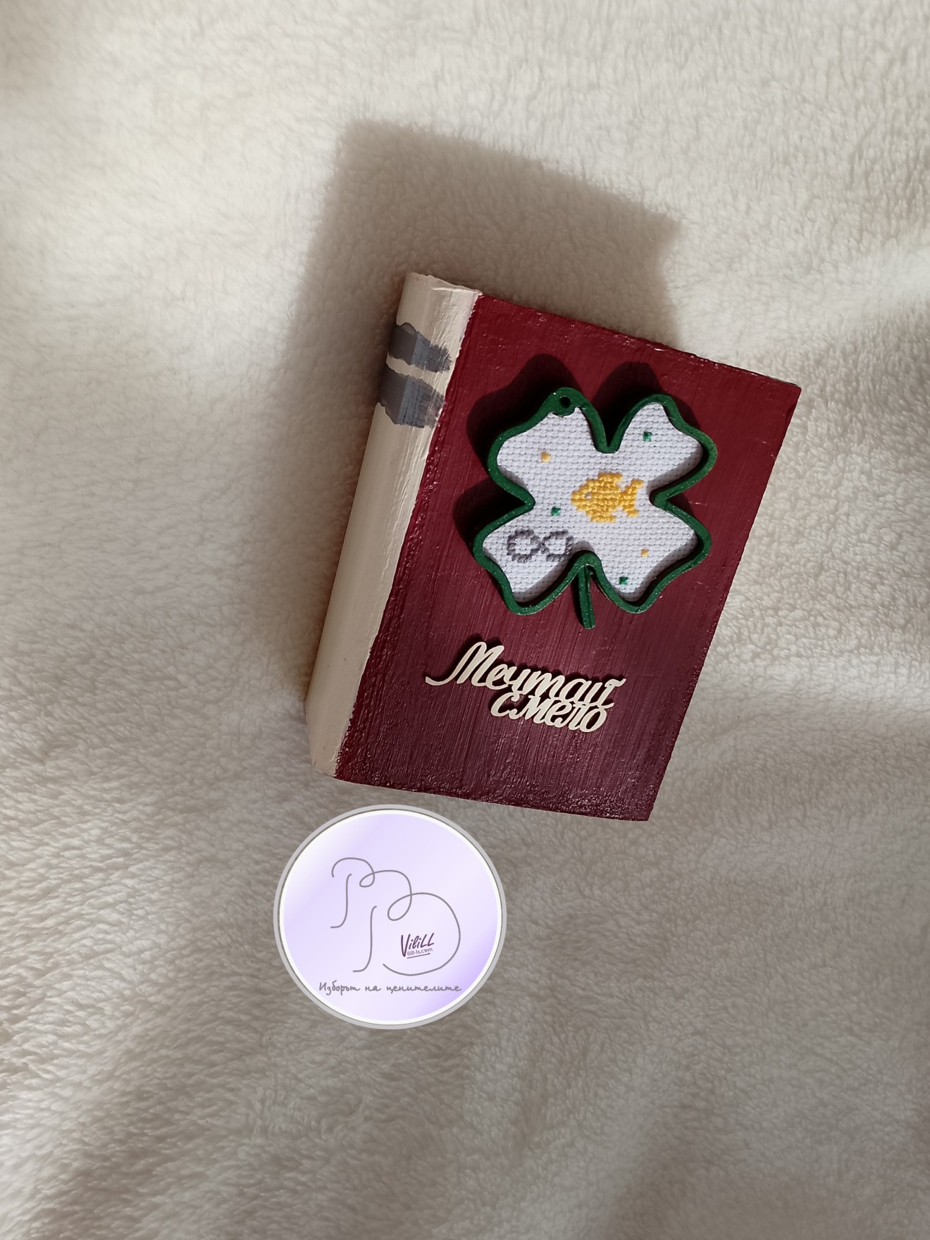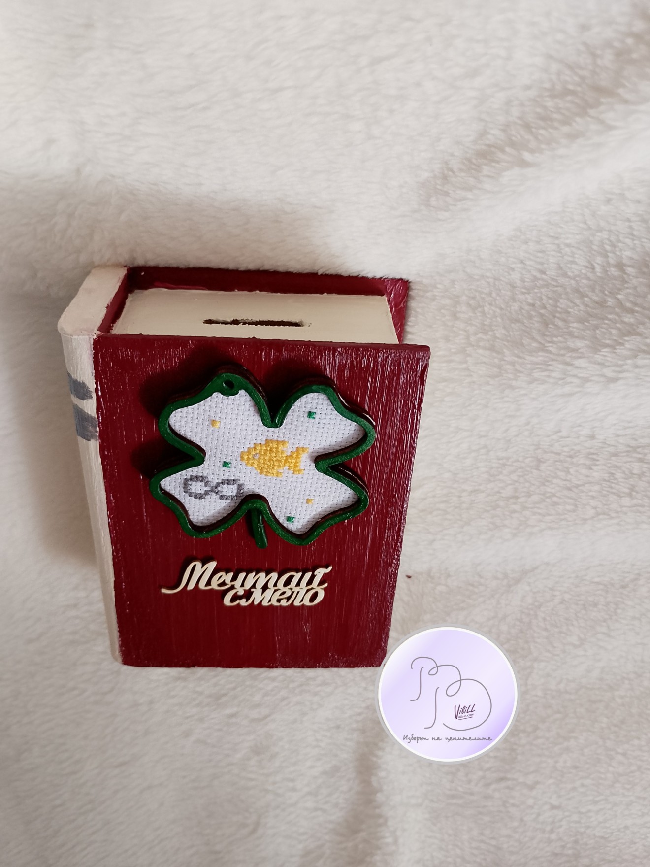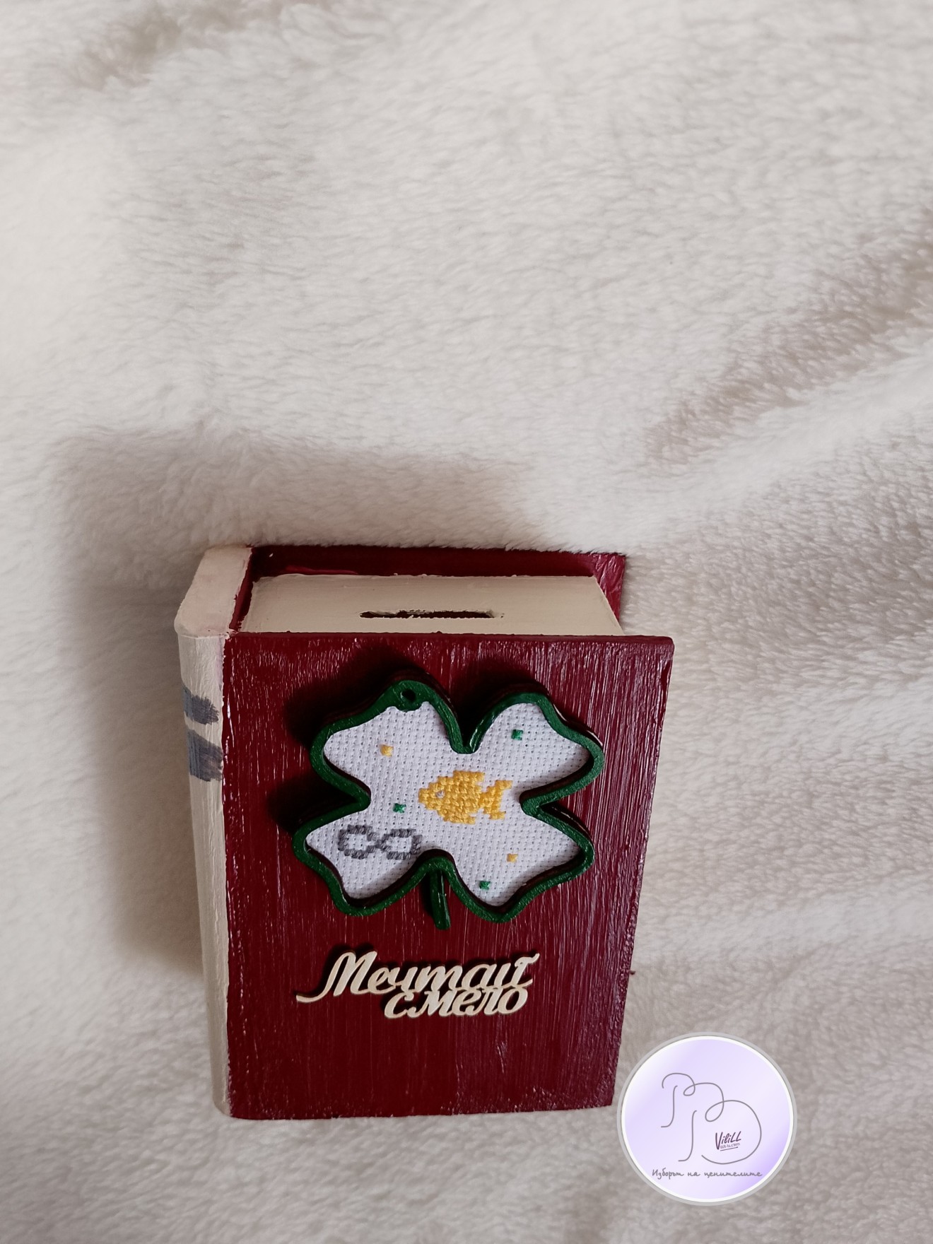Книга-касичка, декорирана с ръчно бродирана златна рибка е отлична идея за атрактивен и практичен подарък за наближаващите декемврийски празници. Спестете пари-осъществете мечти! Възможни комбинации разгледайте и изберете сред снимките. Може вариант касичка и касичка-календар. Приблизителни размери:12.4х9.5х5 см. Материал: -тяло касичка- МДФ. -акрилни бои. -надпис-бирен картон. -детелинка-шперплат. -ръчна бродерия- панама/плат и конци. -12 листчета с месеците. Цена: 20.00лв./10.23 евро/1 касичка. Доставка до офис на Еконт за сметка на получател. 10% от цената дарявам за развитието на платформата! При интерес- на Ваше разположение съм да обсъдим подробностите. Facebook-РъкоВелиеViliLL